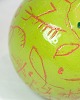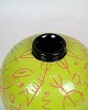 Lene Regius' runde vase med sort top, grøn glasur og orange mønstrede indgraveringer fra omkring 1980'erne repræsenterer en unik periode inden for keramisk design. Vasen kombinerer forskellige farver og mønstre for at skabe et karakteristisk udtryk, typisk for den tid og kunstnerens stil.