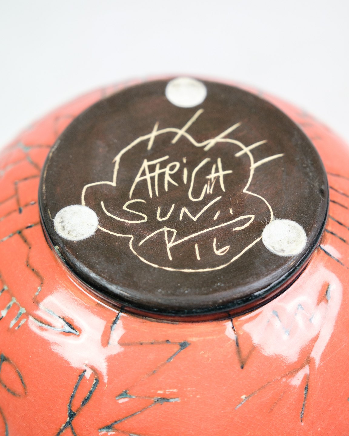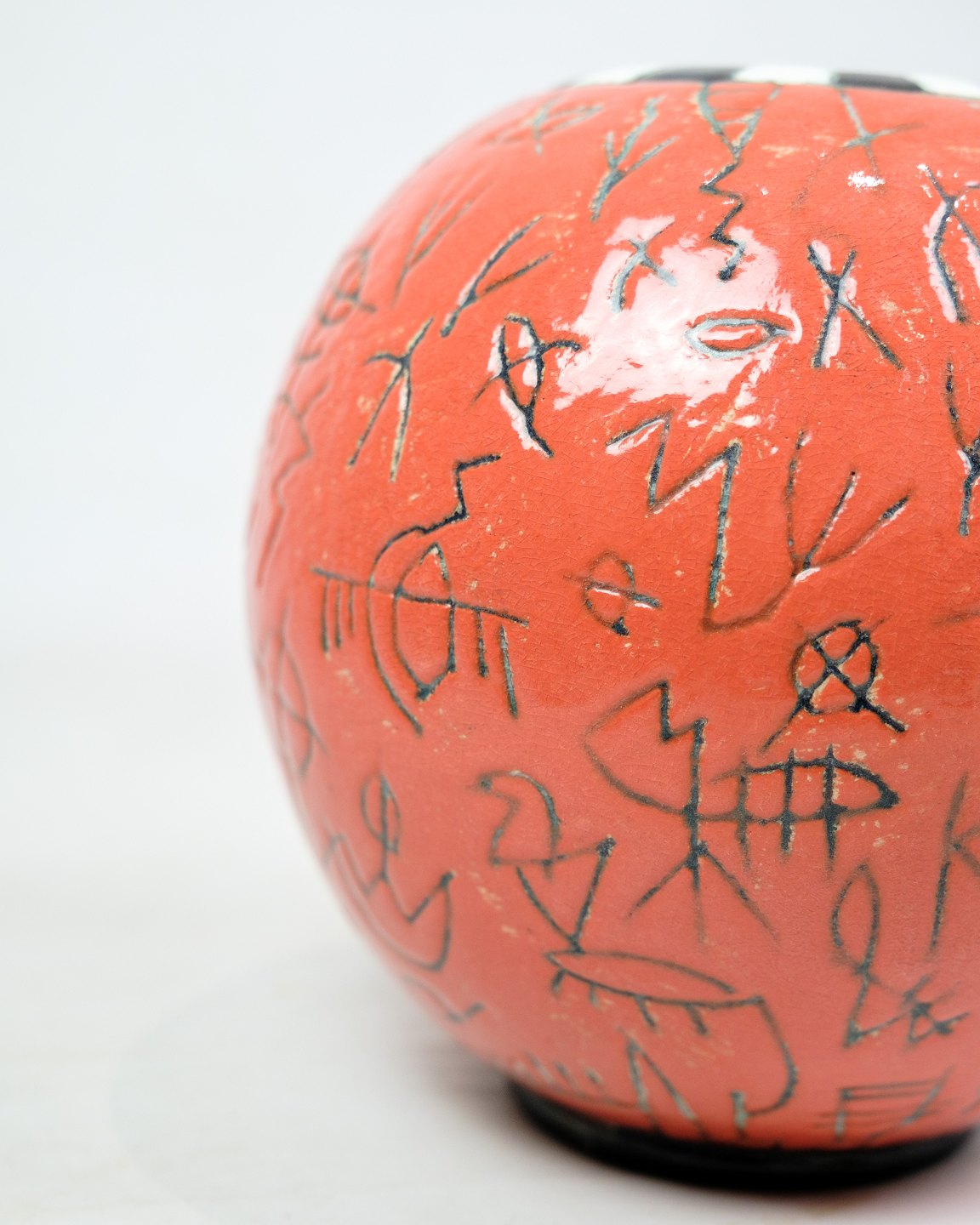 SoldLene Regius' round vase with black and white top, orange glaze and black patterned engravings from around the 1980s represents a unique period in ceramic design. The vase combines different colors and patterns to create a characteristic expression, typical of the time and the artist's style.