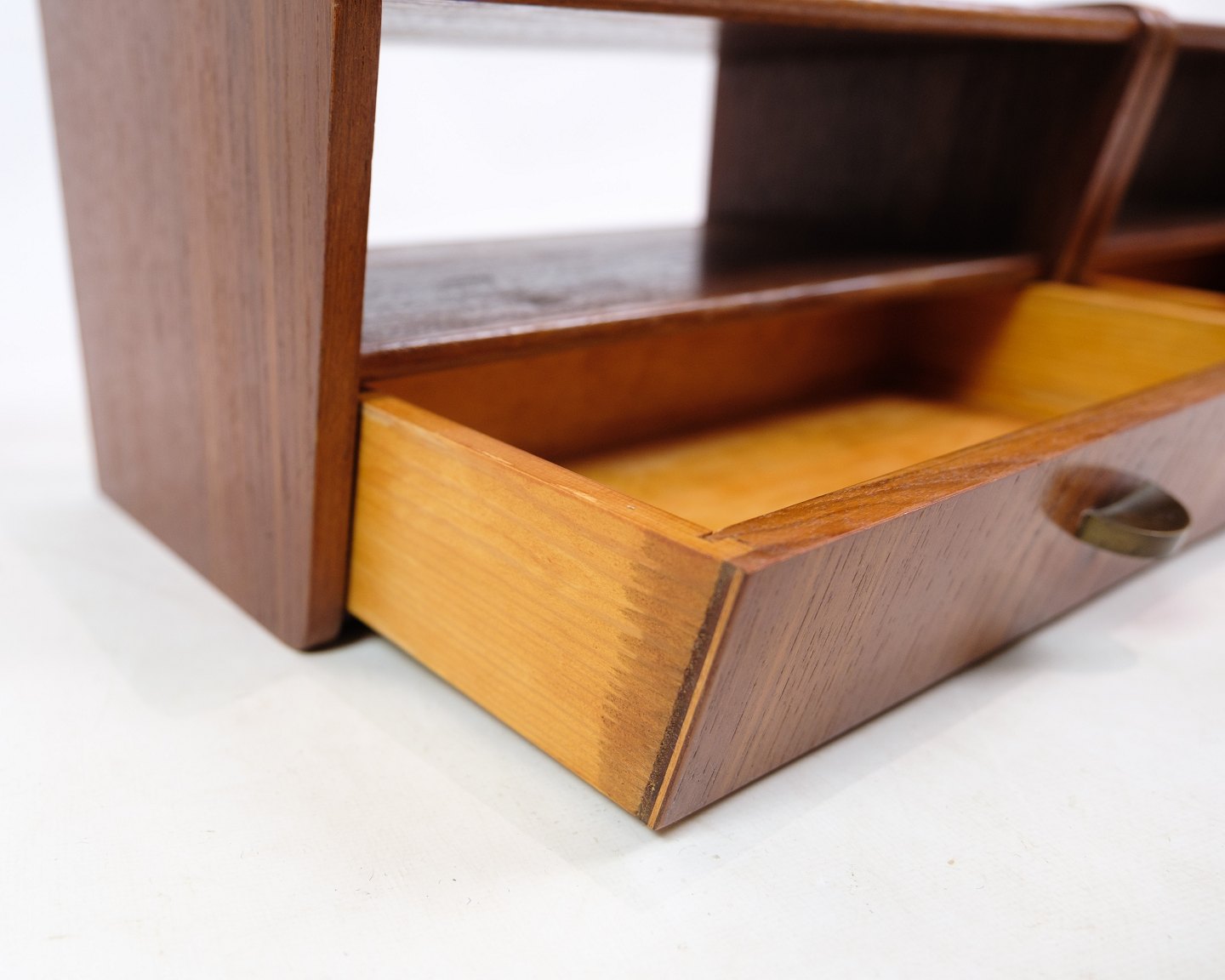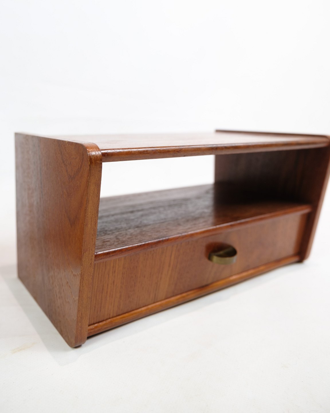 SoldWall-hung bedside tables of Danish design in teak wood from the 1960s with a shelf and drawer, equipped with brass handles. These bedside tables combine functionality and aesthetics with the warm expression of the teak wood and the elegant touch of the brass handles. The wall-hung construction provides a modern and space-saving element for the bedroom. A typical example of Danish furniture design from the 1960s, which is still sought after for its craftsmanship and stylish appearance.