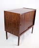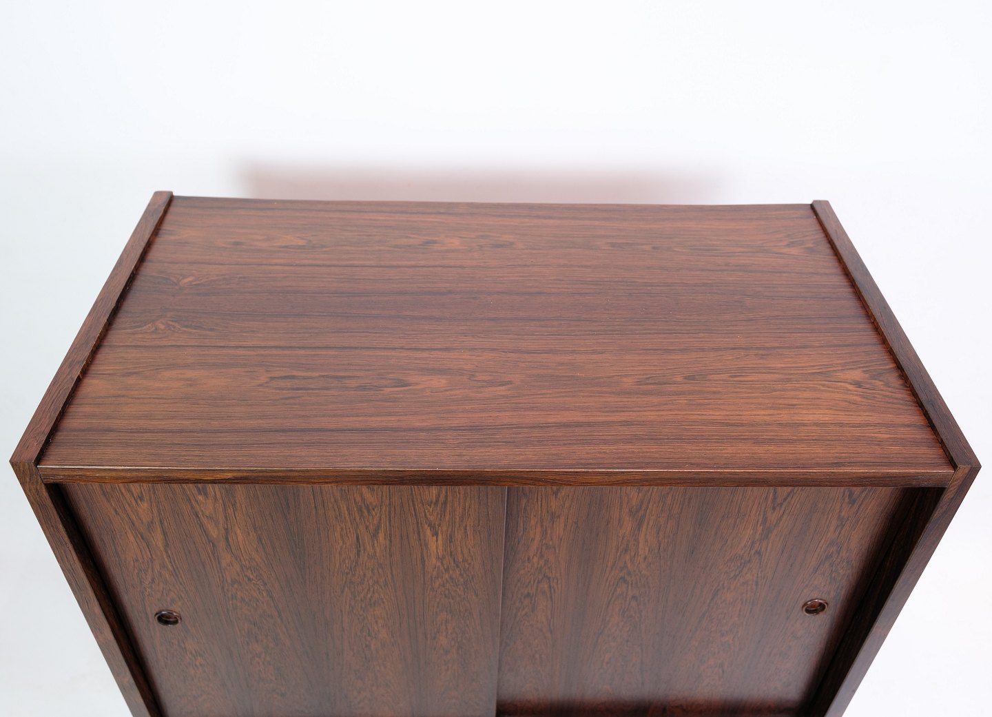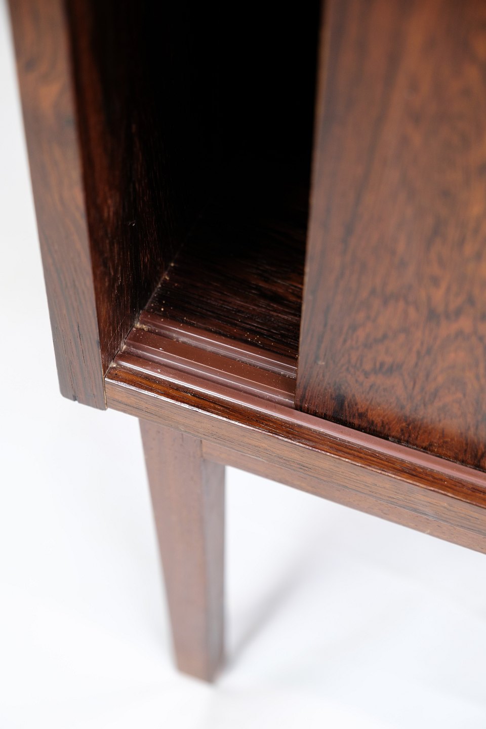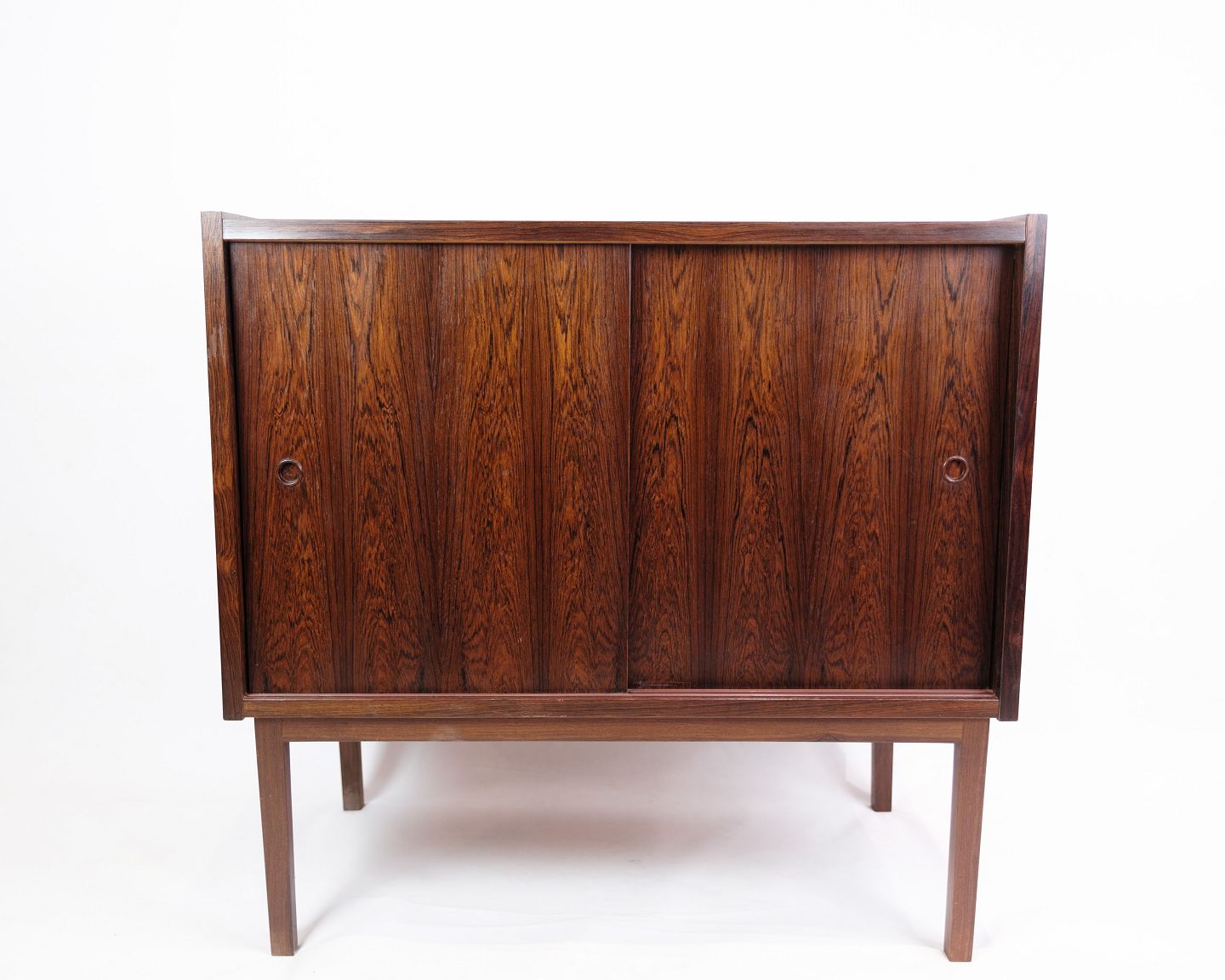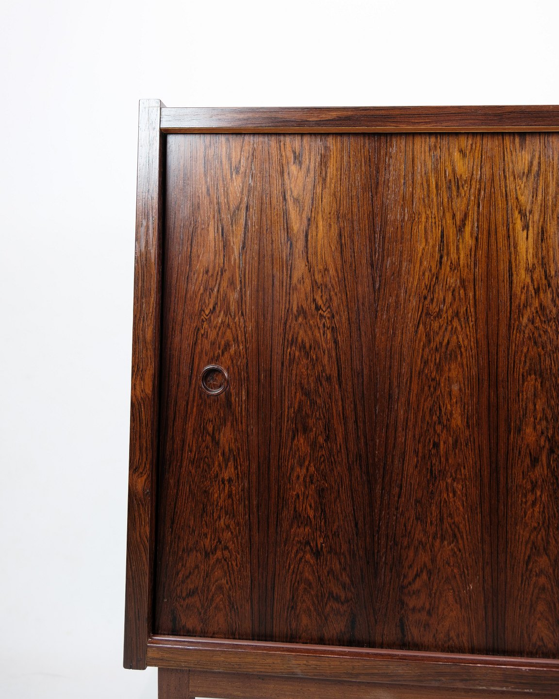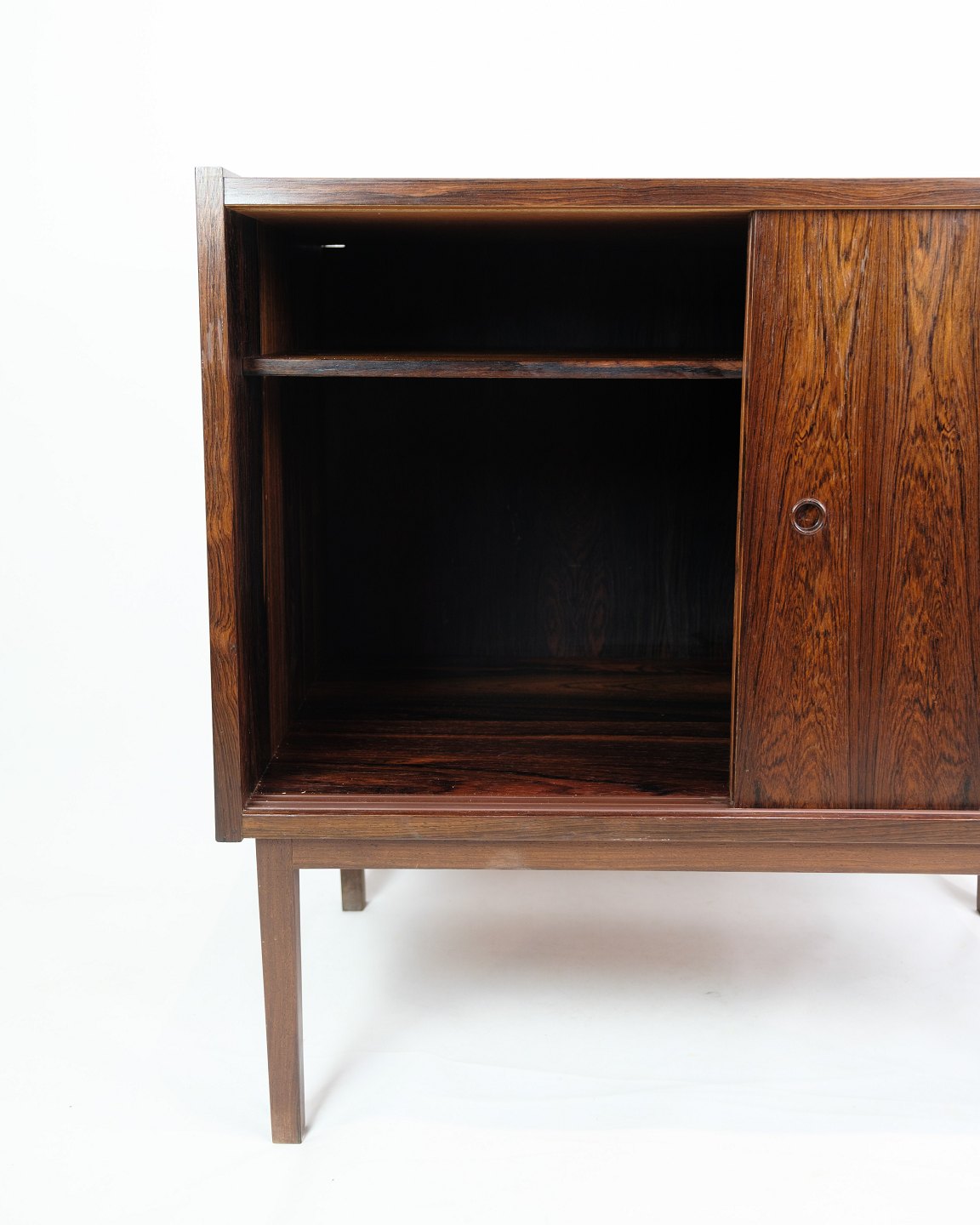 The small rosewood sideboard, of Danish design and from the 1960s, represents an era of stylish and functional furniture design. The rosewood, with its characteristic dark color and beautiful veins, gives the sideboard a unique and luxurious appearance.