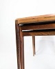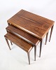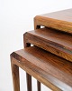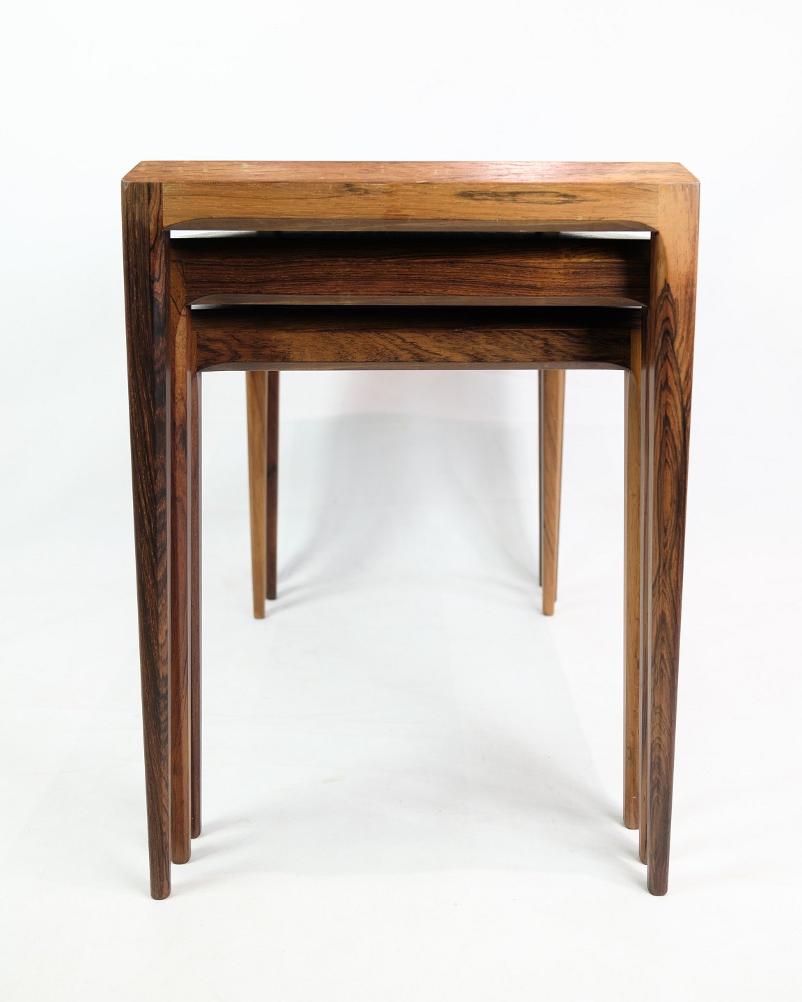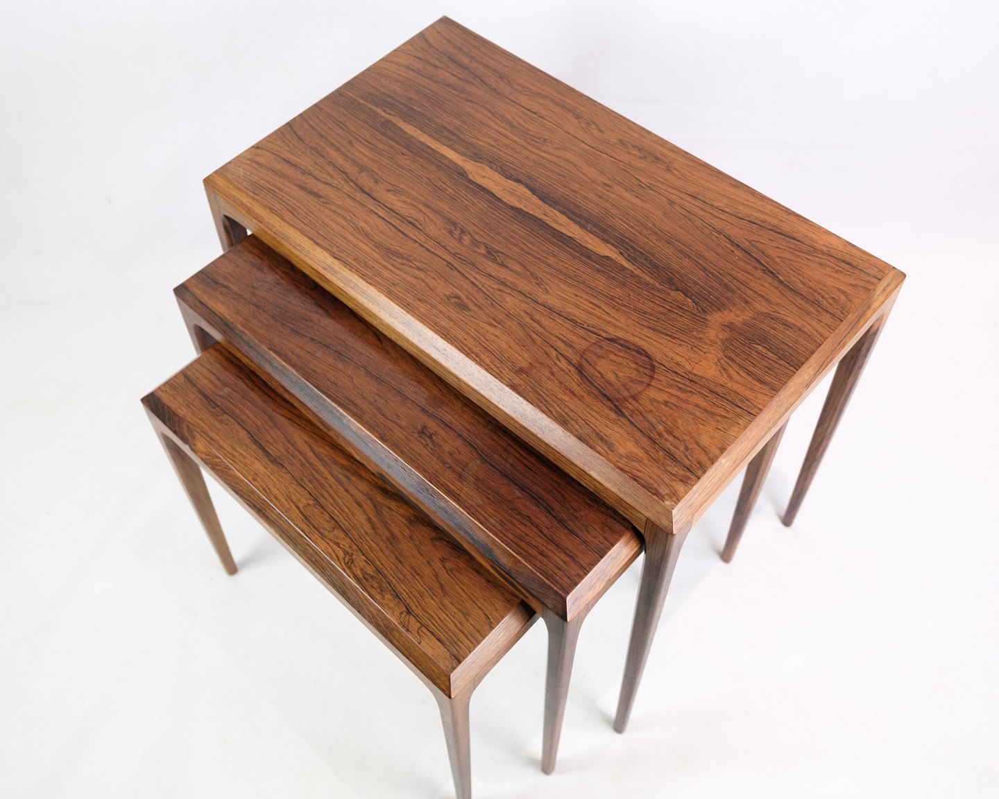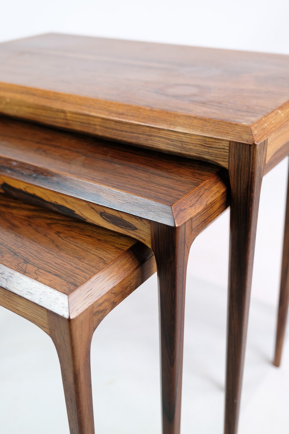 SoldSide tables designed by Johannes Andersen and made in rosewood with extraordinary joints in the corners, dated around the 1960s. These tables are an impressive example of mid-20th century Danish furniture design. Johannes Andersen was known for his focus on details and the use of quality materials such as rosewood. The extraordinary joints in the corners add a unique and artistic dimension to the tables, making them more than just functional furniture, but also aesthetic masterpieces. A timeless and desirable set of deposit tables for collectors and admirers of Danish design.