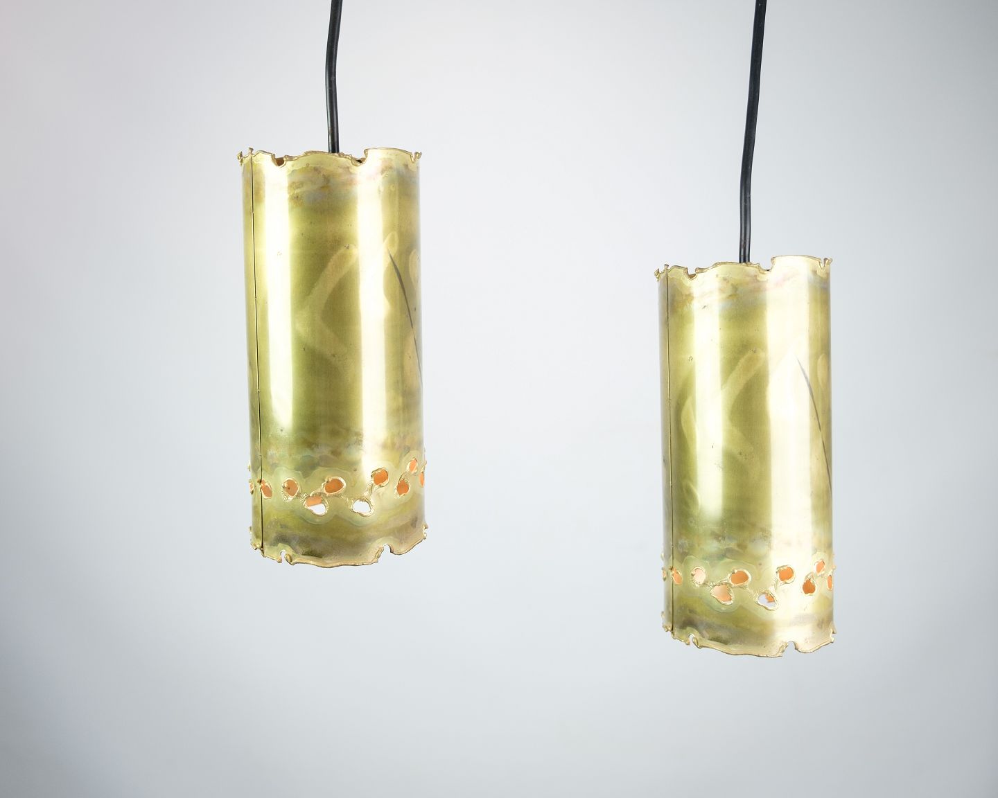 Loftlampen i messing, præget af en karakteristisk cylinderform og en sort ledning, er et bemærkelsesværdigt eksempel på belysningsdesign fra 1960'erne, skabt af den dygtige designer Sven Aage Holm Sørensen. Dette ikoniske stykke fanger ånden af dansk modernisme med sin enkle, men elegant udformede struktur.