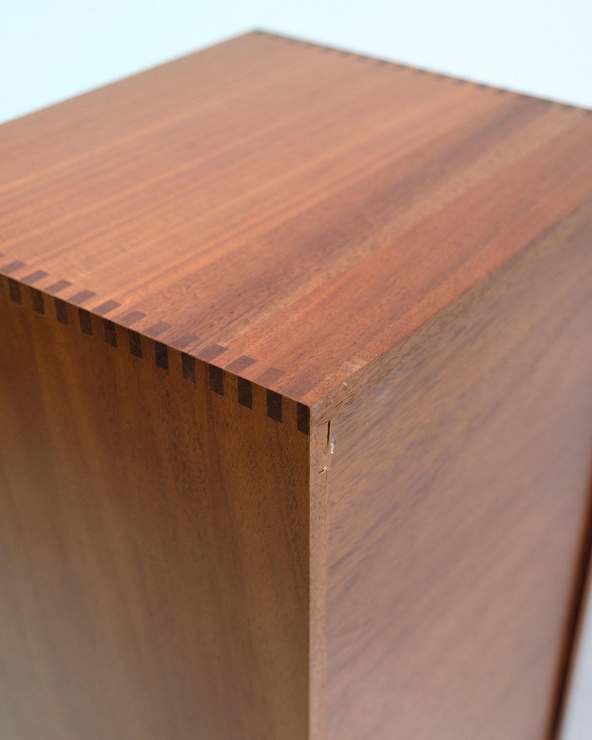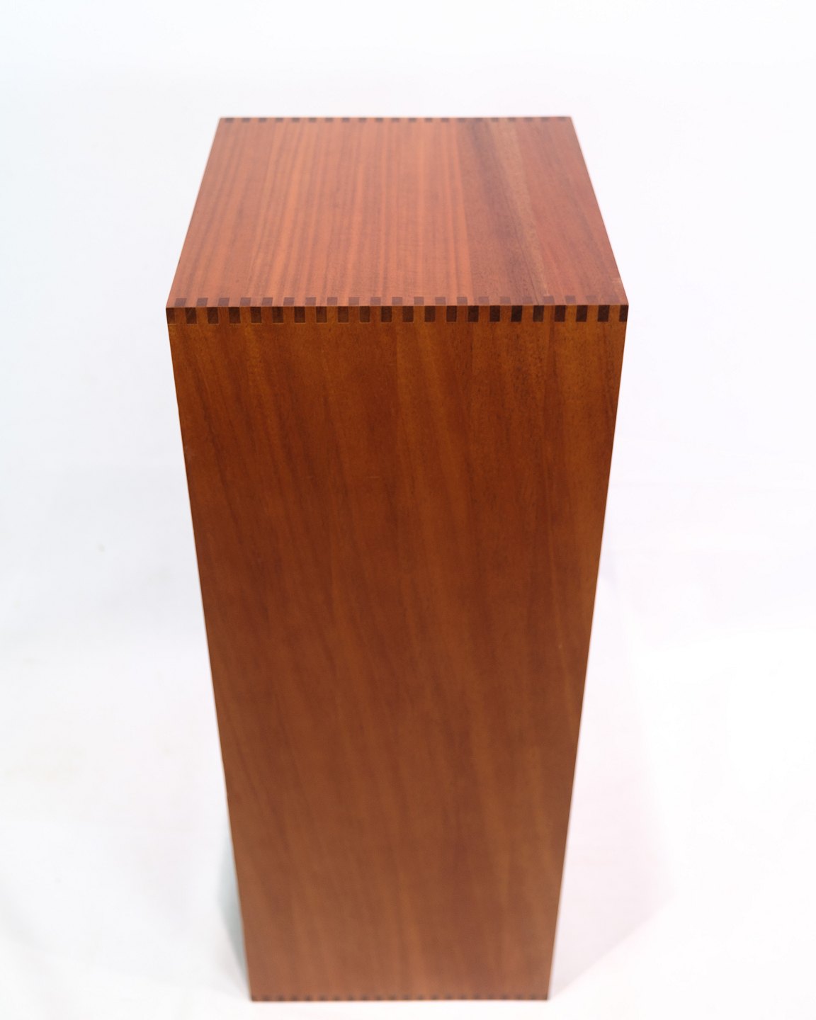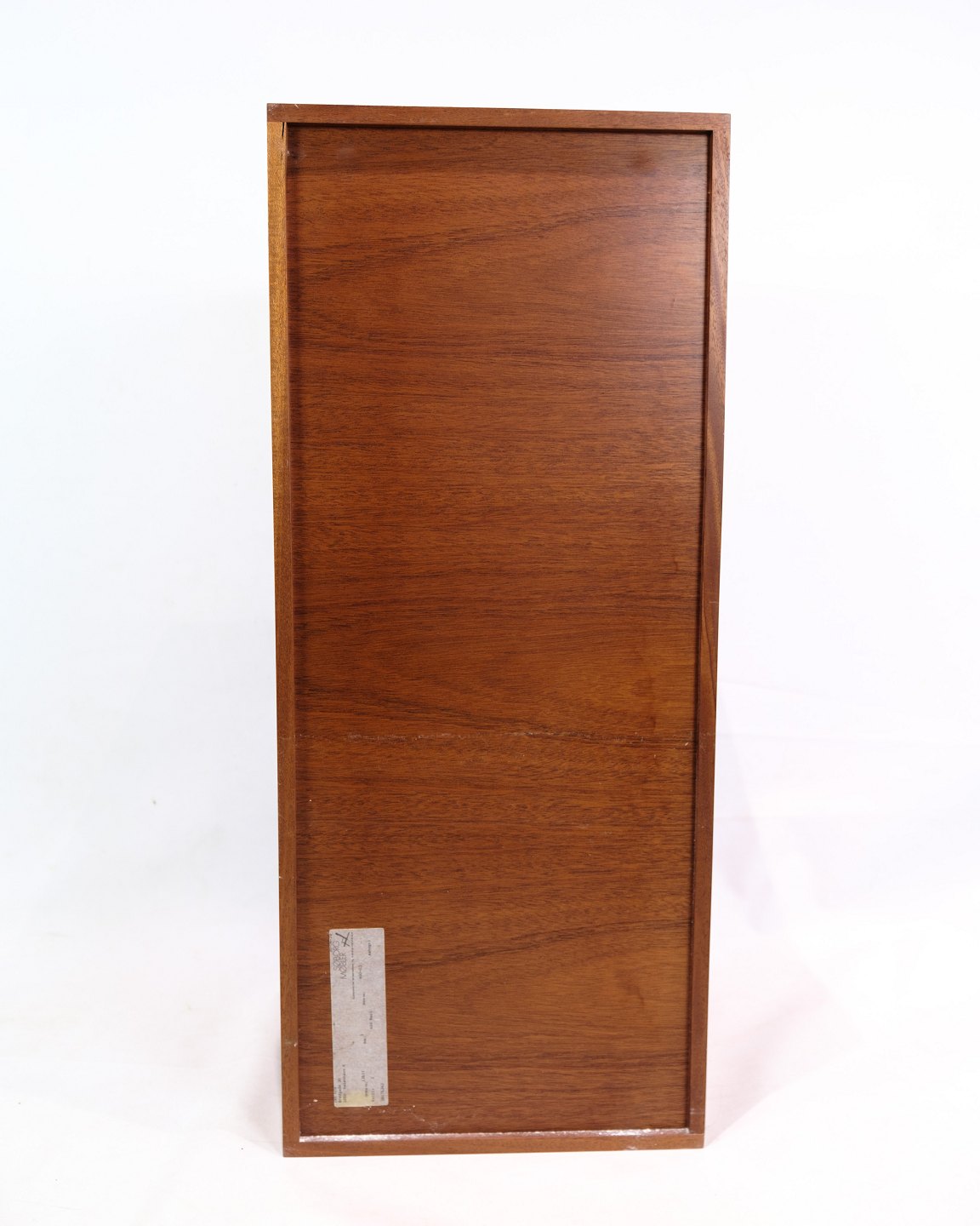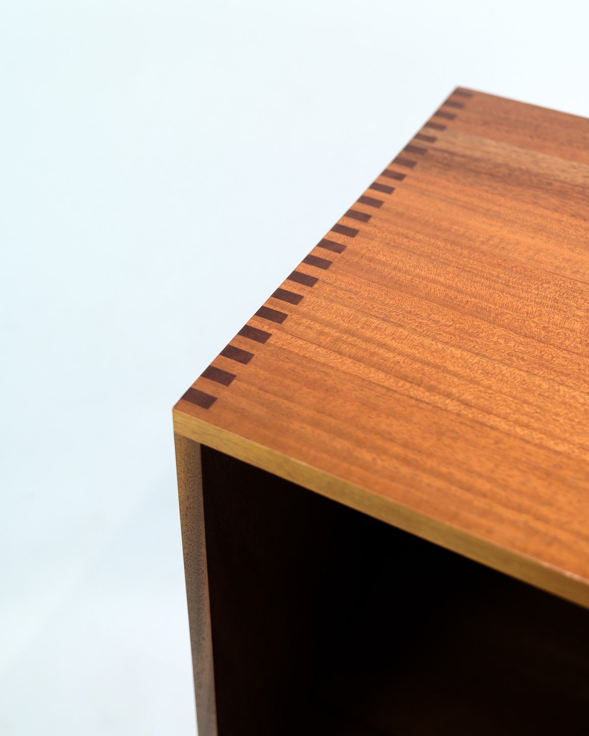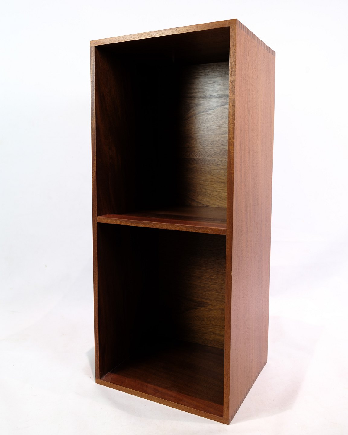 Denne reol med hylde er et eksempel på dansk design fra 1960'erne, lavet af Mahogni. Den repræsenterer en æra, hvor dansk møbeldesign blomstrede og opnåede international anerkendelse for sin enkelhed, funktionalitet og høje kvalitet. Typisk for mange møbler fra denne periode er reolen sandsynligvis karakteriseret ved rene linjer, elegant træbearbejdning og et minimalistisk udtryk. Produkter som disse var populære i danske hjem og er stadig eftertragtede som samlerobjekter og emblematiske repræsentanter for den danske modernistiske æstetik.