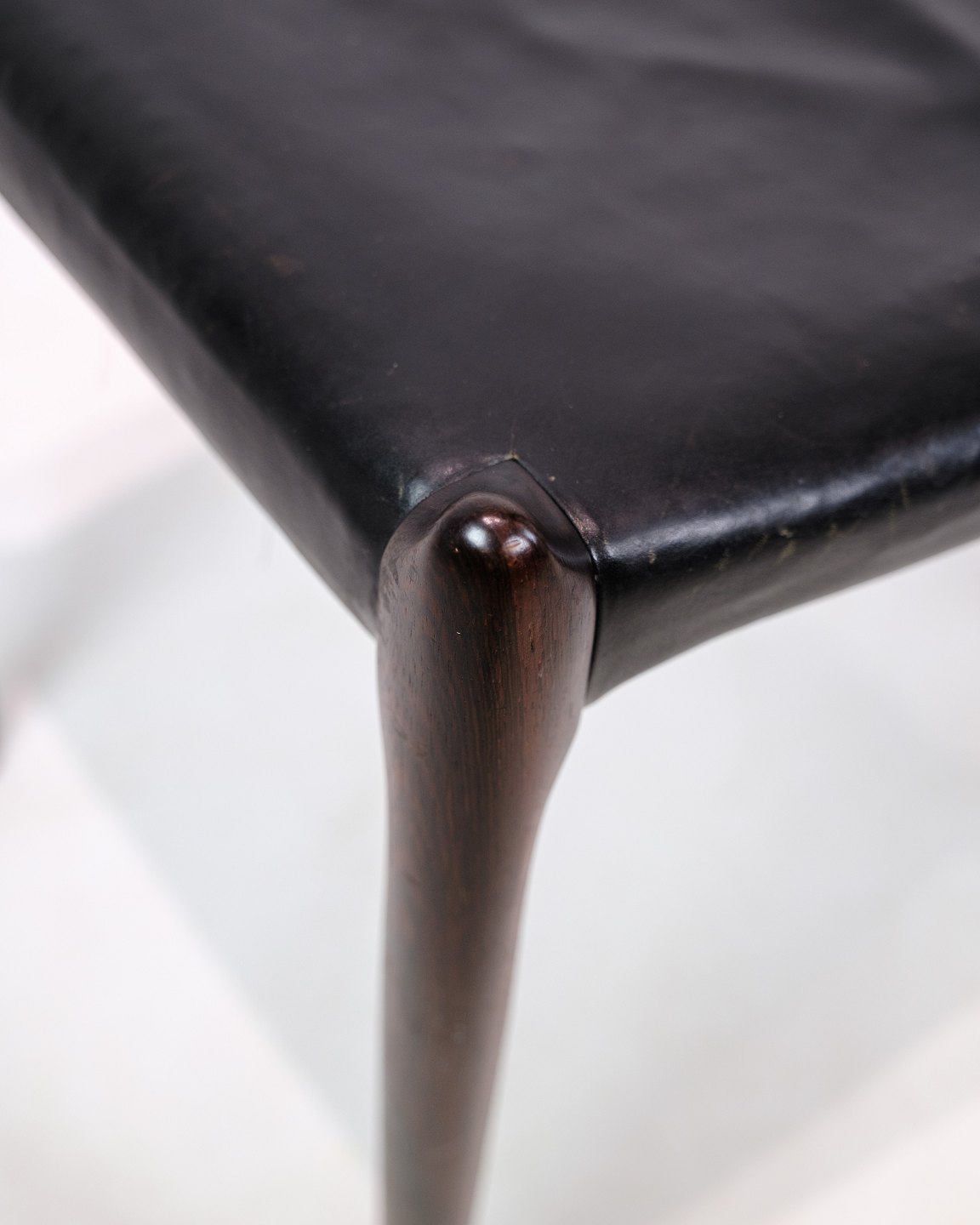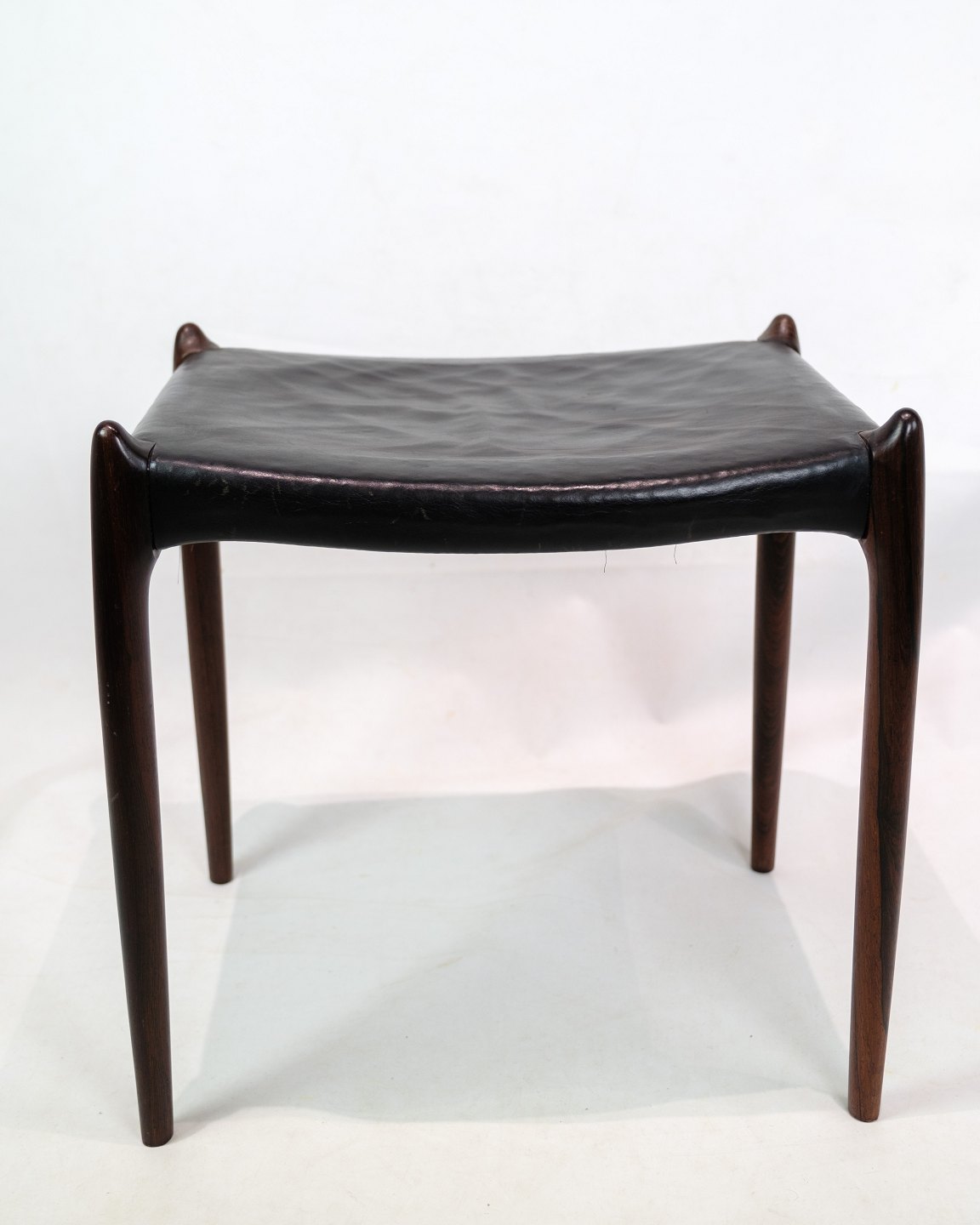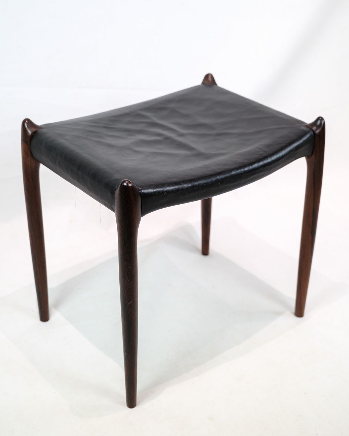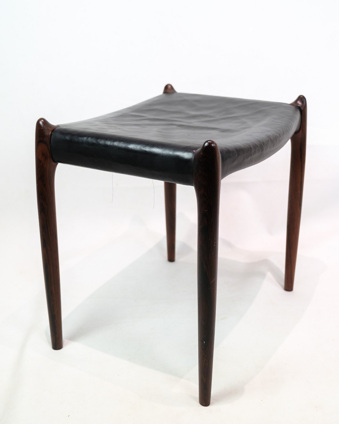 Niels O. Møller's signature style is expressed in the stool's simple and functional design, where each element is carefully coordinated to achieve the perfect balance between aesthetics and functionality. The black leather adds an elegant contrast to the rich rosewood, giving the stool a sophisticated look.