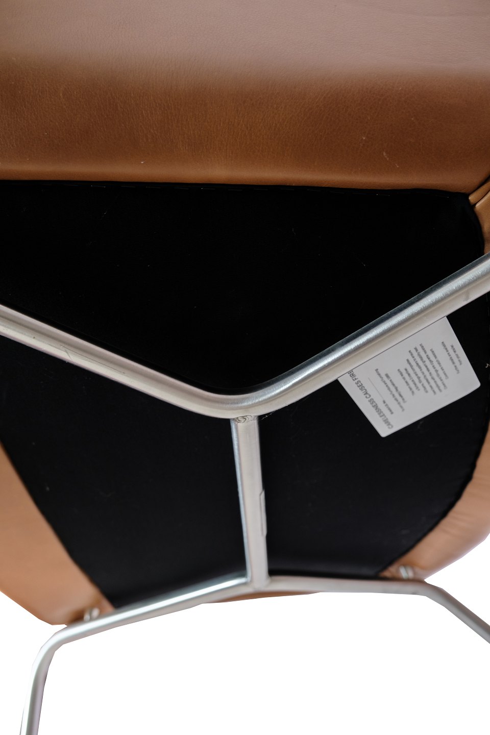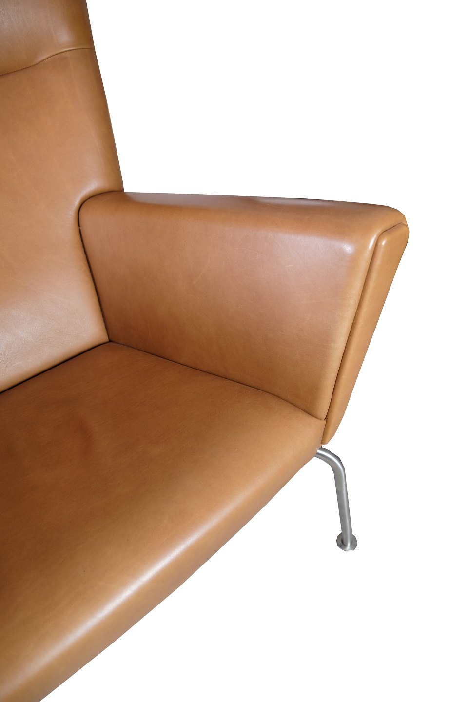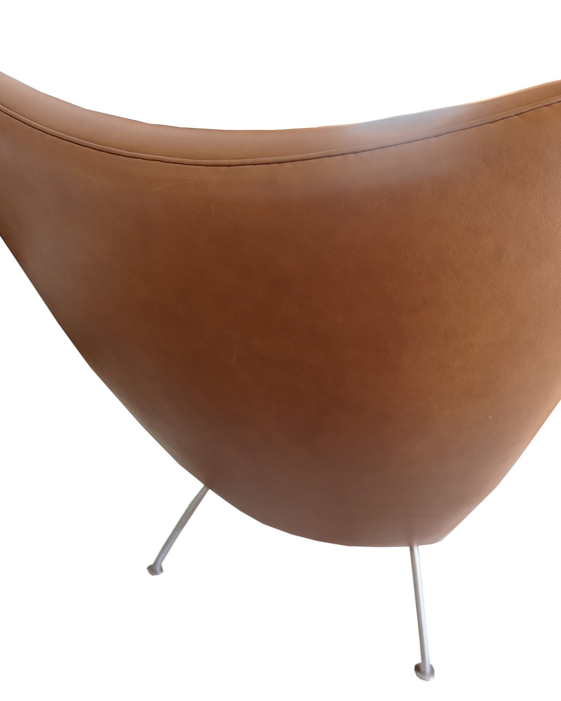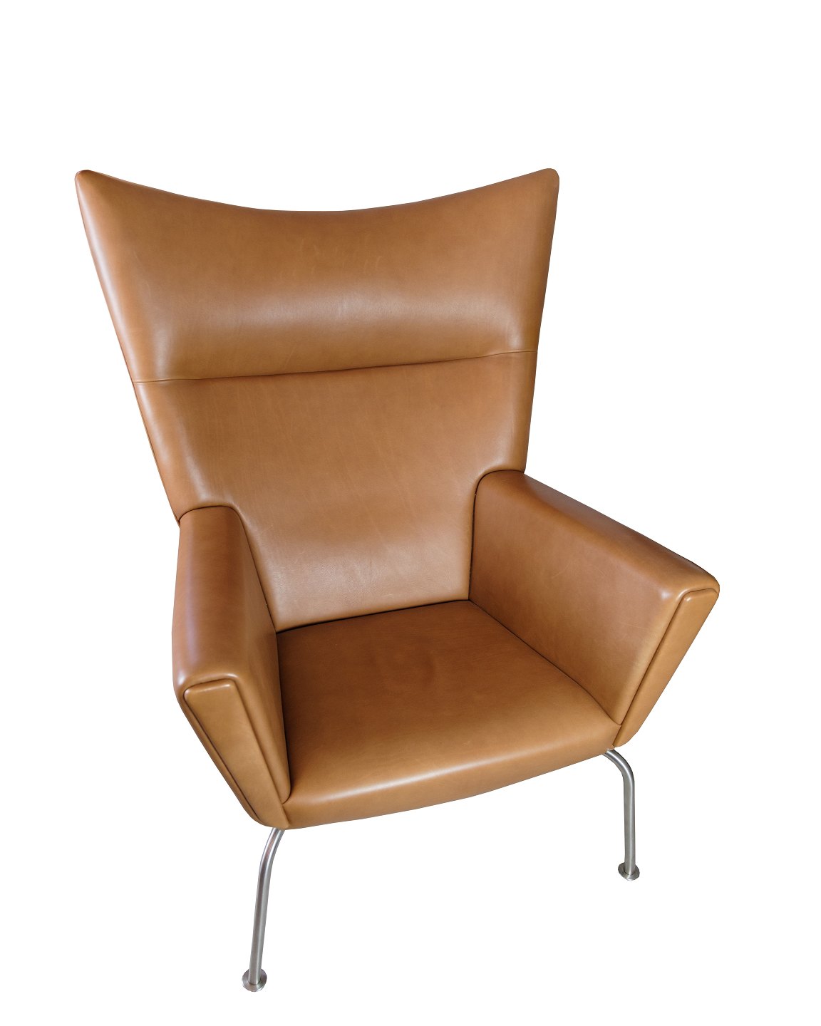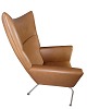 Betrukket med elegance læder i en varm valnødfarve tilføjer den en sofistikeret og luksuriøs fornemmelse til ethvert rum. Wegners fokus på håndværk og komfort skinner igennem i denne stol, der både er smuk og funktionel. Med sit tidløse design er denne lænestol ikke blot et møbel, men en investering i stil og komfort, der vil blive værdsat i mange år fremover. Det er muligt at tilkøbe skammel i præcis samme læder.