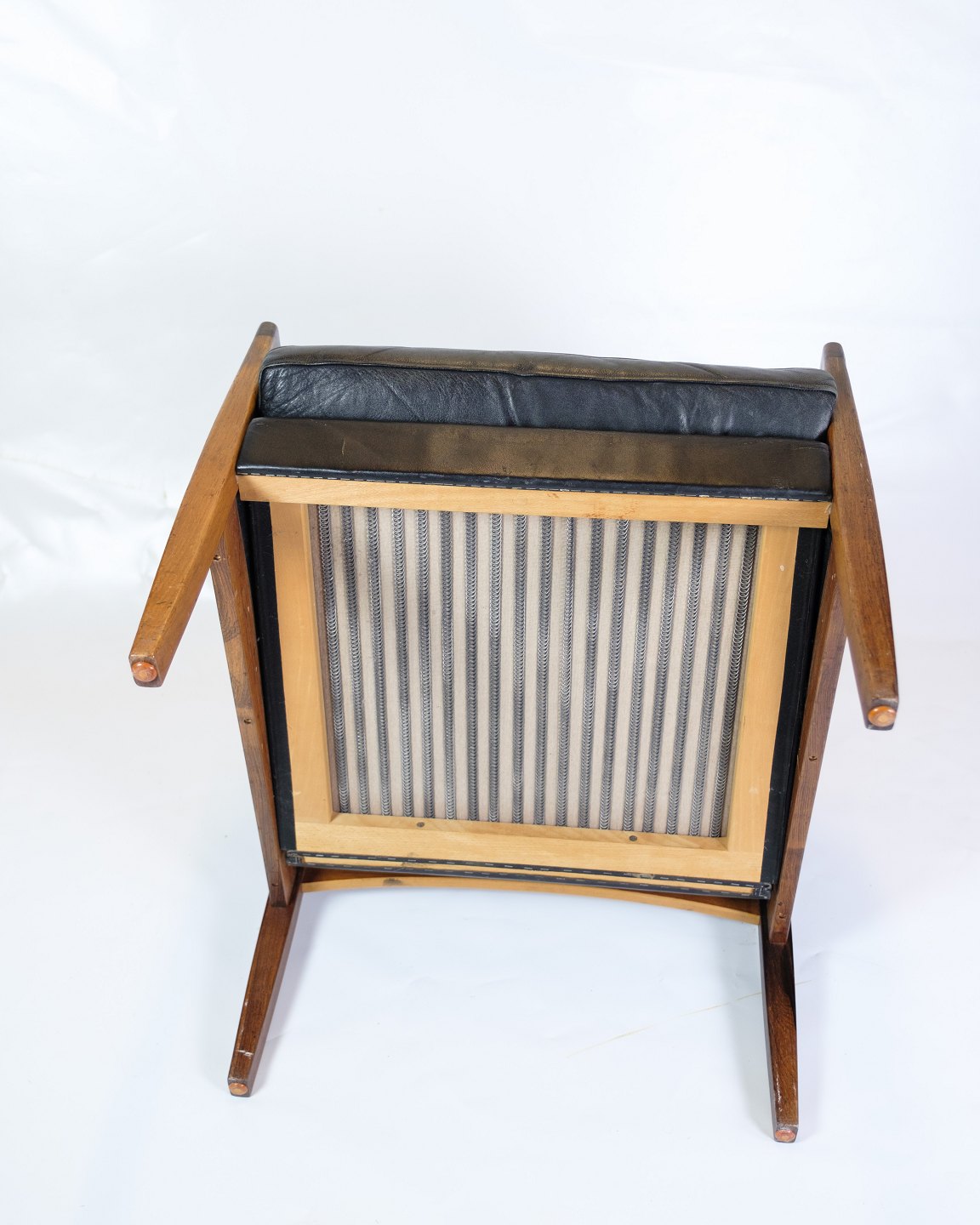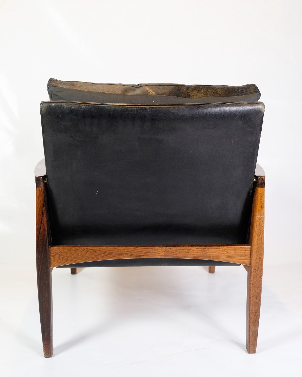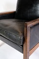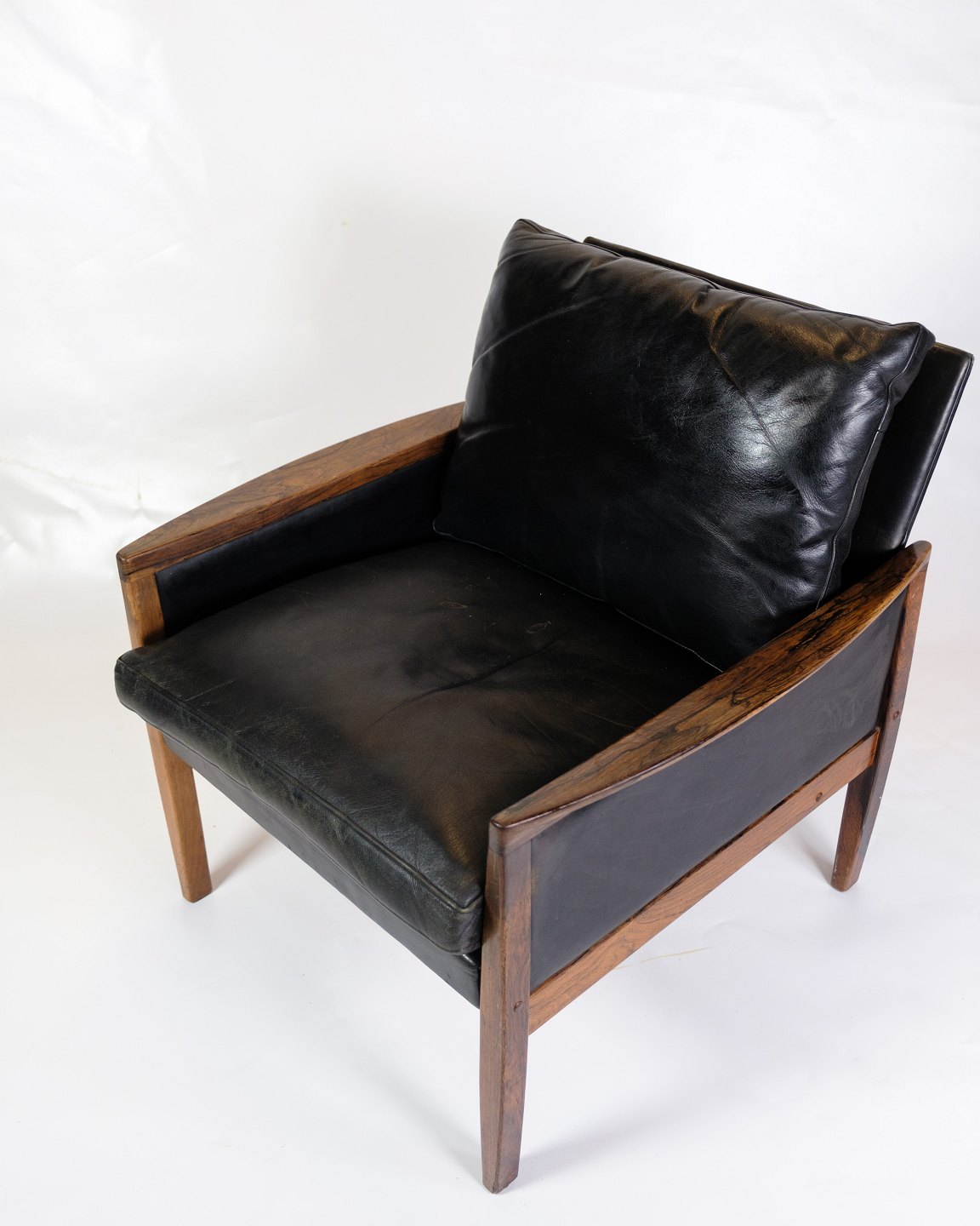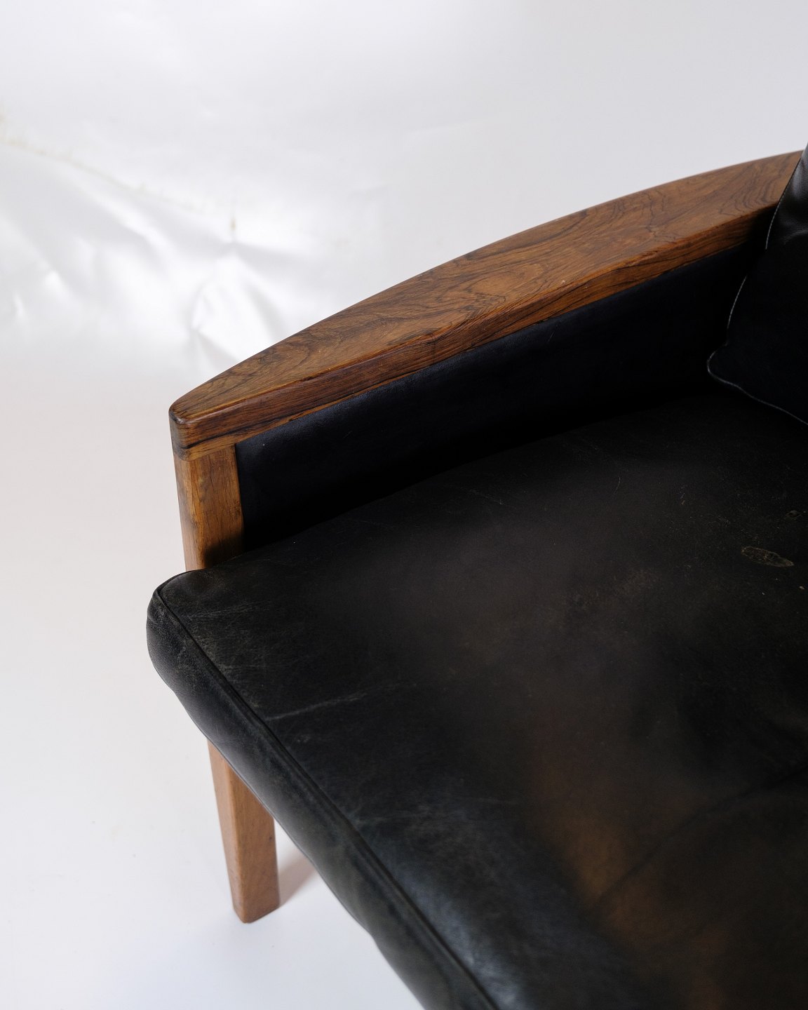 This elegant armchair in rosewood with black leather cushions is a splendid example of classic Danish design. The rosewood, with its deep color and fine grain, gives the chair a unique and luxurious appearance, while the soft, black leather ensures a comfortable sitting experience.
