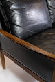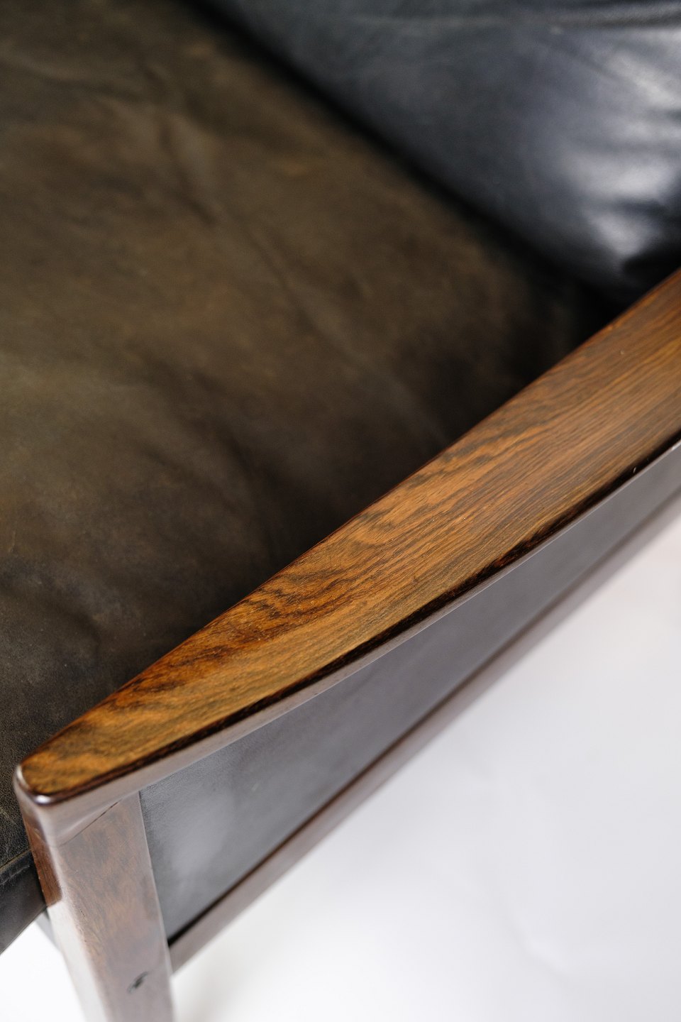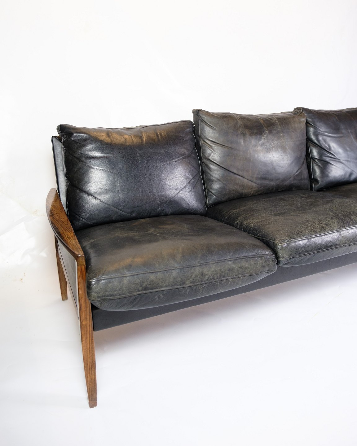 Denne elegante 3-personers sofa kombinerer luksus med komfort og funktionalitet. Fremstillet af solidt palisandertræ og polstret med sorte læderhynder tilbyder denne sofa en sofistikeret og behagelig siddeoplevelse. Den smukke silhuet og det strømlinede design gør den til et imponerende centrum i ethvert rum.