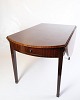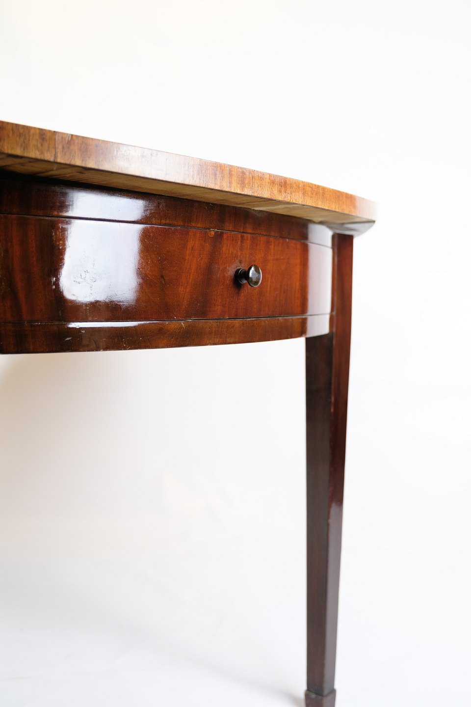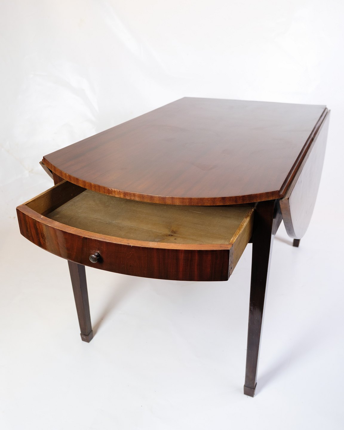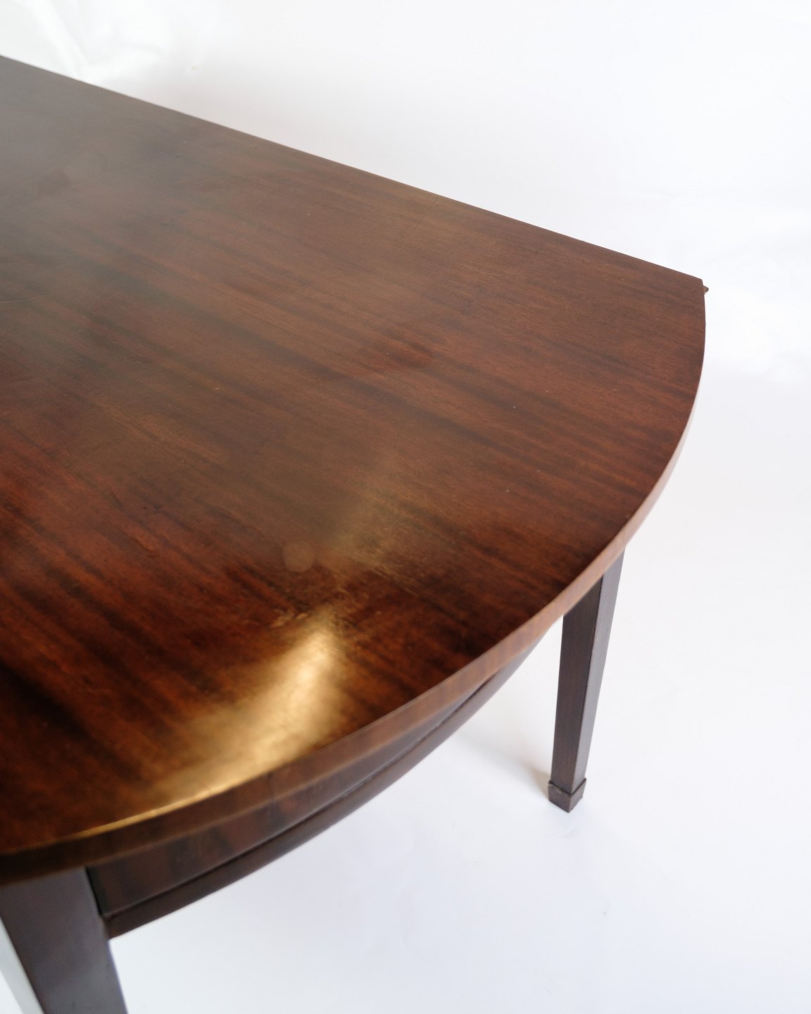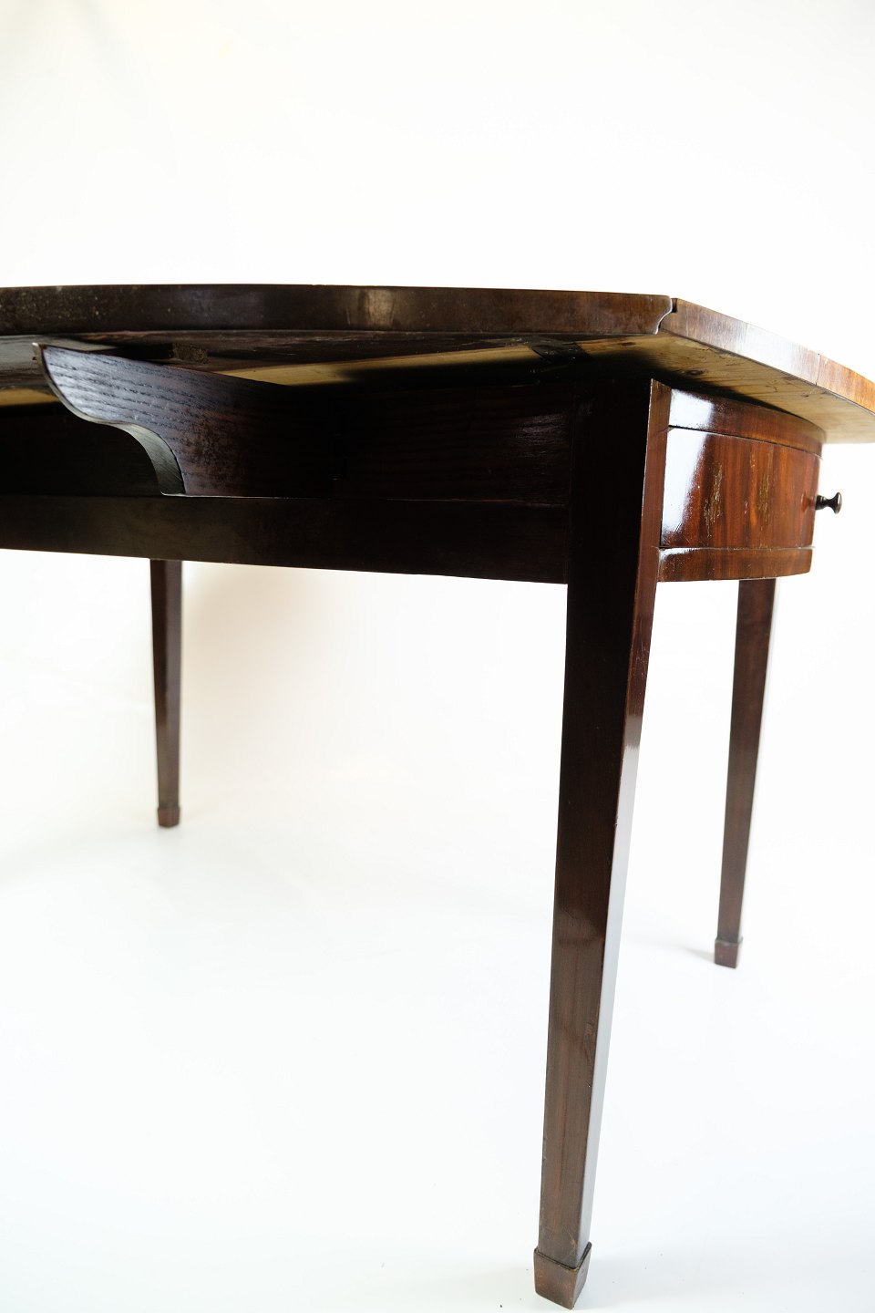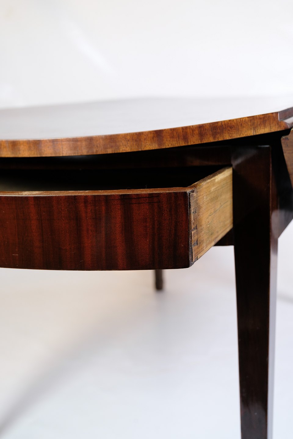 This antique folding table/dining table from around 1840 is a wonderful example of classic craftsmanship and timeless elegance. Made of polished mahogany wood, the table radiates warmth and beauty with its beautiful wood pattern. The unique design includes a practical drawer that adds functionality to the table. With its older age, the table wears an authentic patina that only adds to its historic appeal.