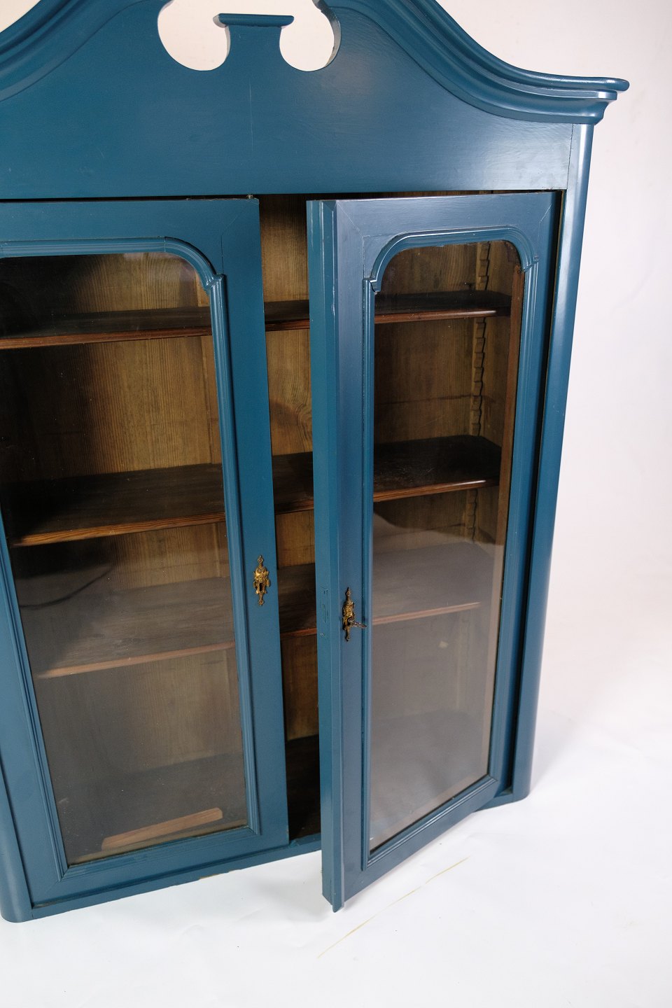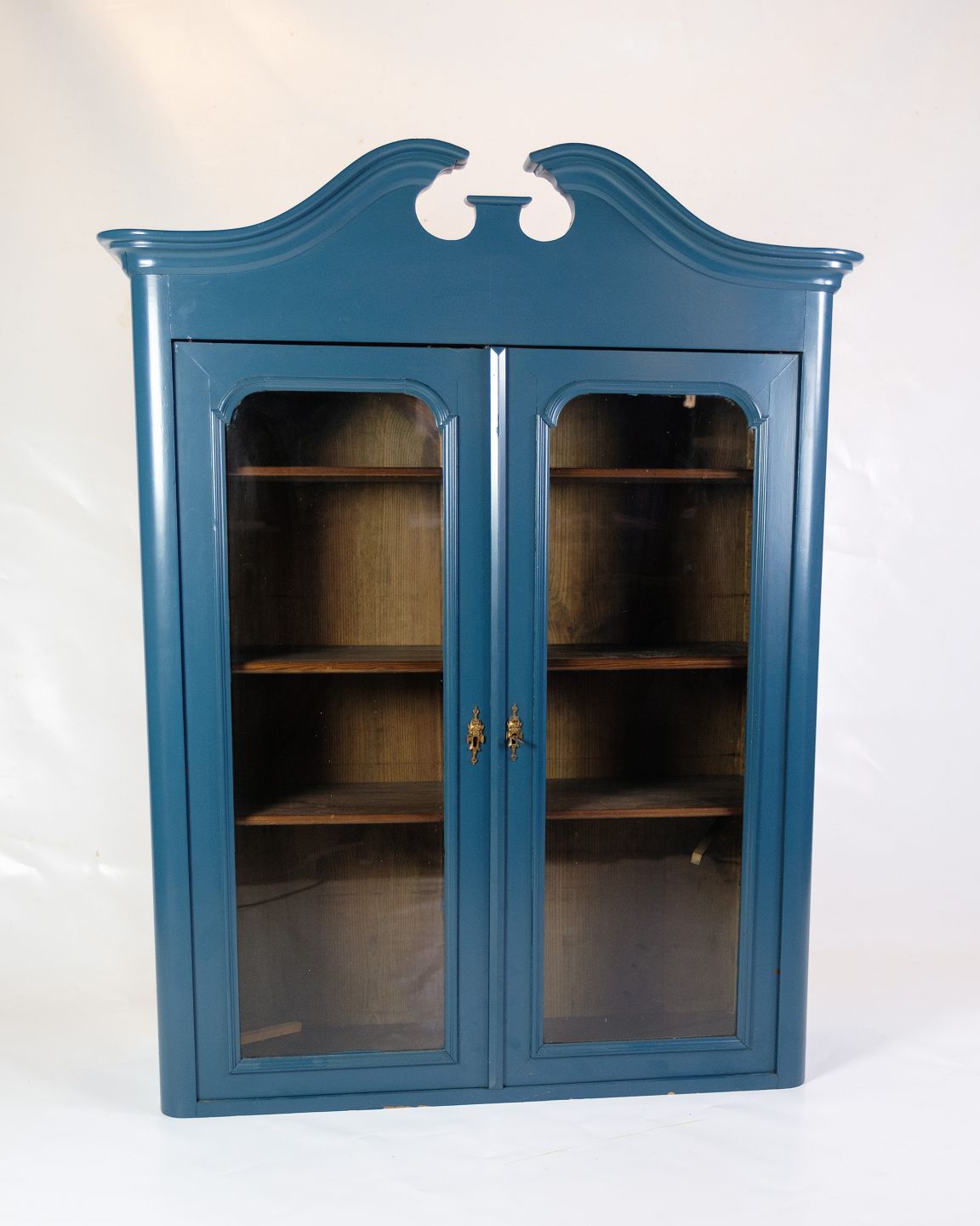 SoldThis 1920 antique wall mounted display cabinet is a wonderful example of historic craftsmanship and aesthetic beauty. Painted in a beautiful blue color, it exudes a charming vintage style that adds character to any room. With its four shelves, this cabinet offers ample space to display your favorite items or collections in an elegant way.