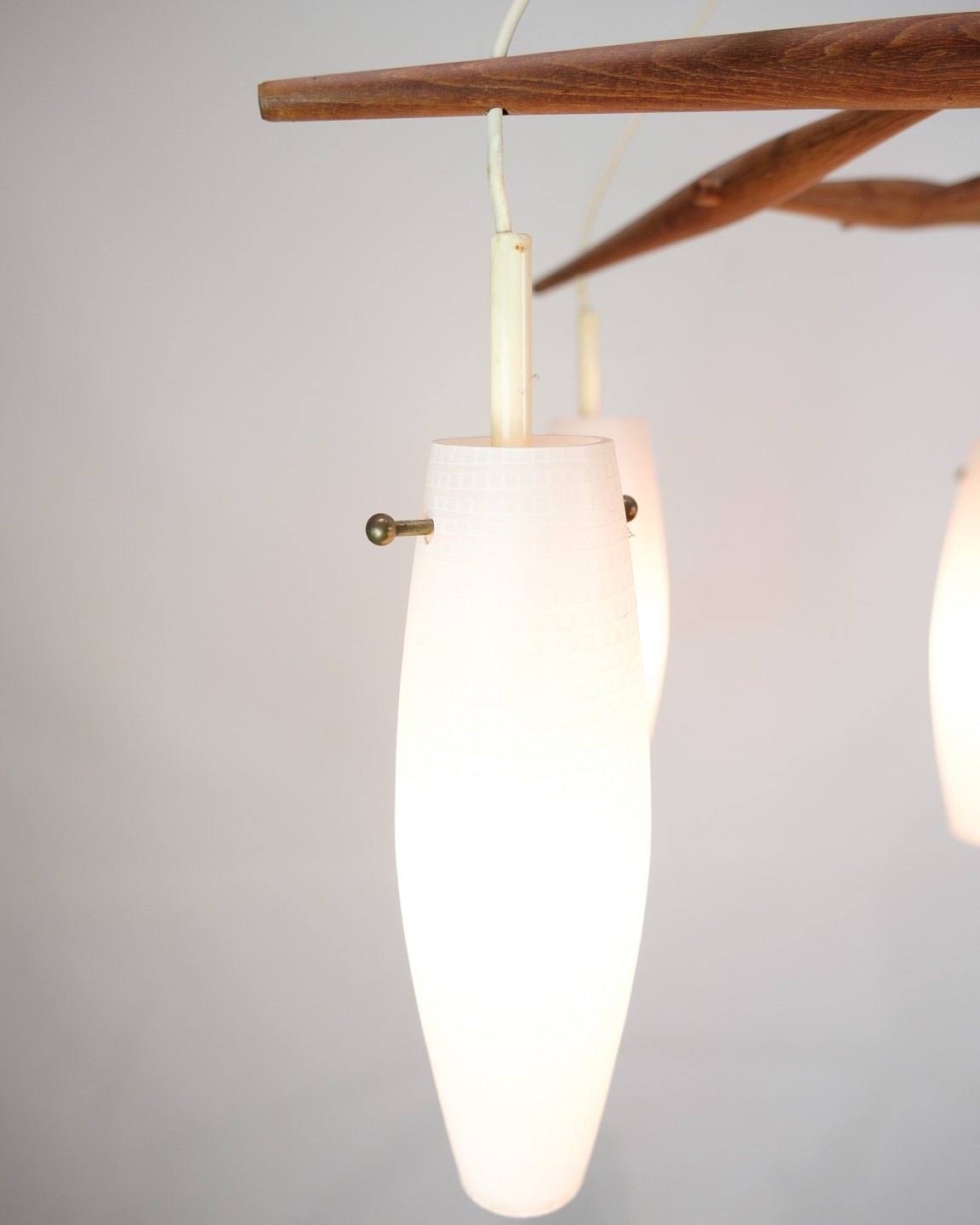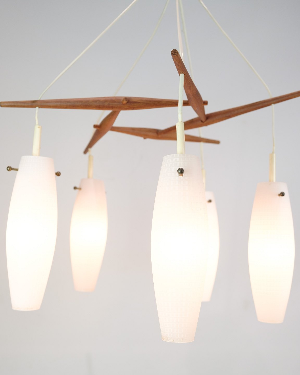 The warm color of the teak wood and the soft lighting of the opal glass create a pleasant atmosphere in any room. This combination of materials gives the lamp an organic look that fits perfectly with both modern and retro interiors.