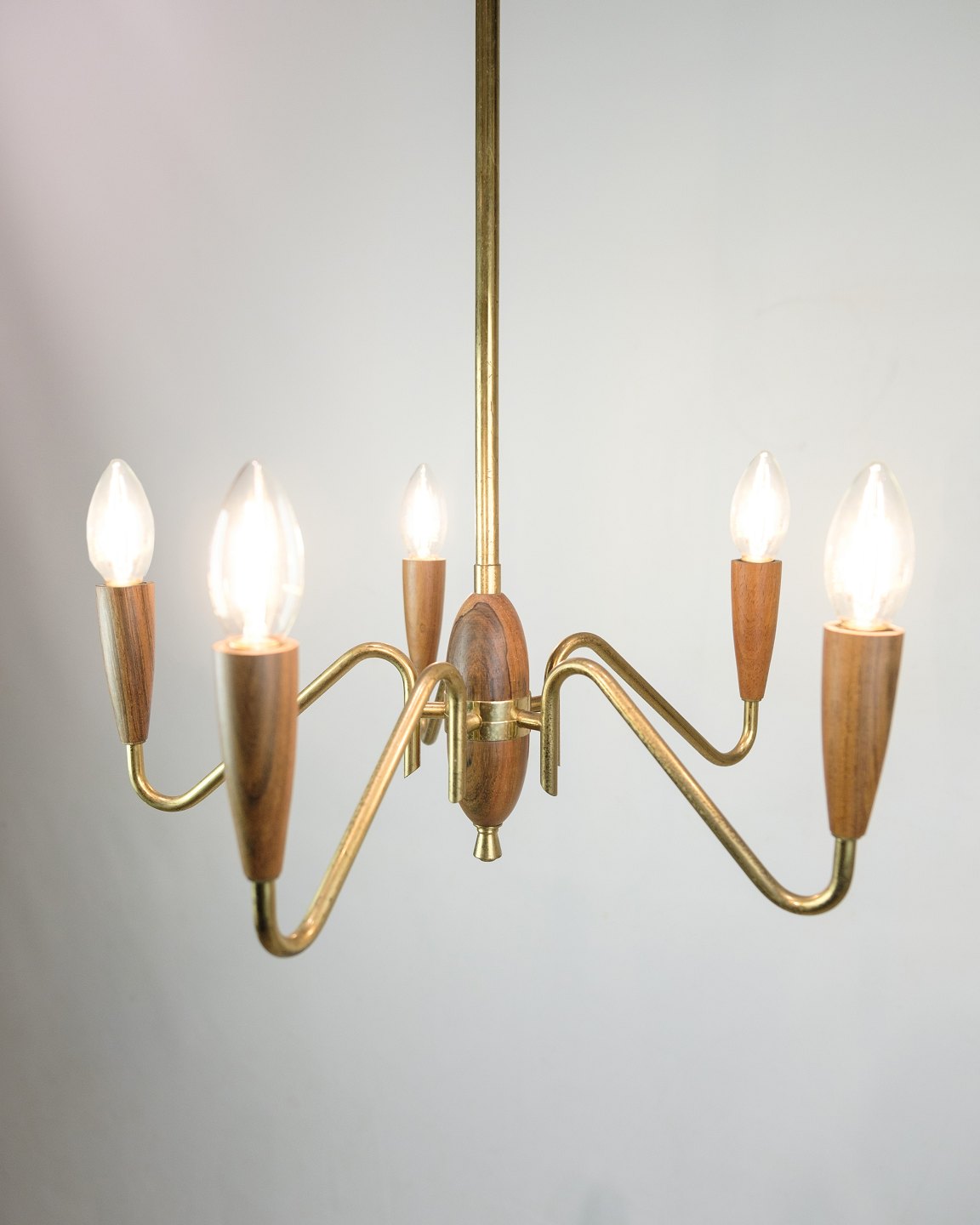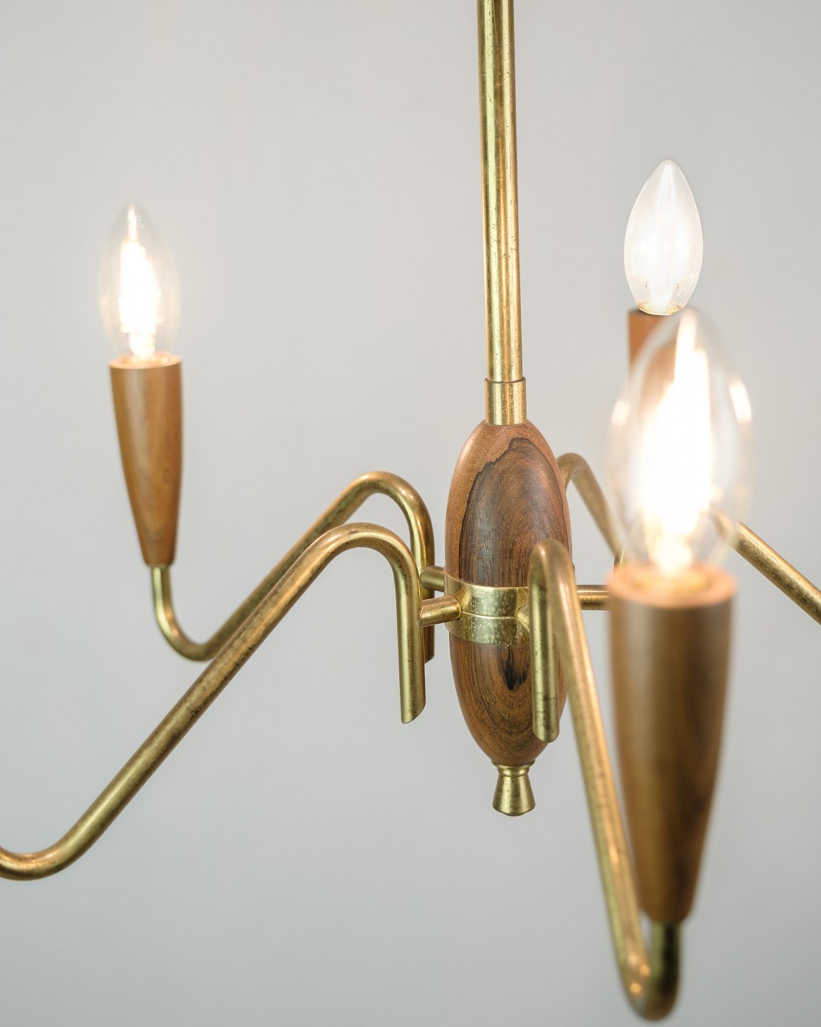 The beautiful combination of teak and brass creates a warm and welcoming atmosphere while adding a touch of luxury to any room. The design of the chandelier with five arms provides a generous illumination that spreads evenly and creates a pleasant atmosphere in the room.