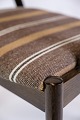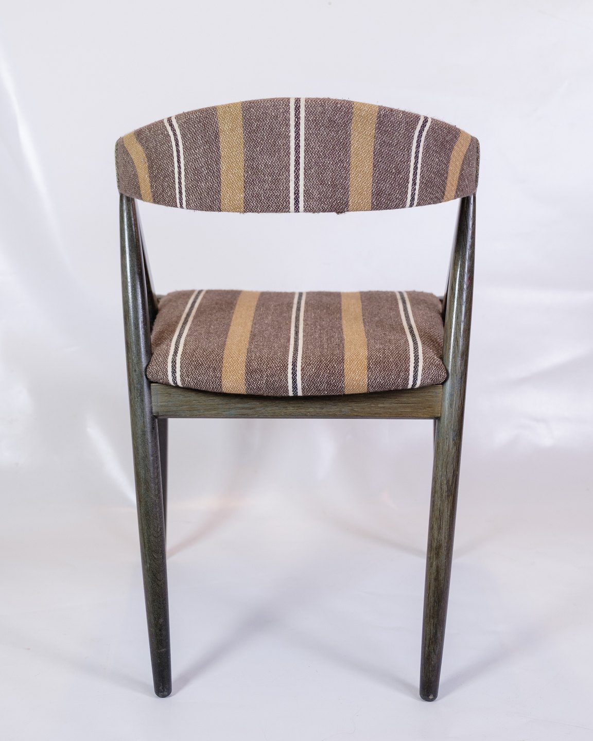 This set of six dining room chairs, model 31, designed by Kai Kristiansen and manufactured by Schou Andersen in the 1960s, is an excellent example of mid-20th century Danish furniture design. The chairs are made of dark wood and upholstered in striped fabric, which combines robustness with elegance and functionality.