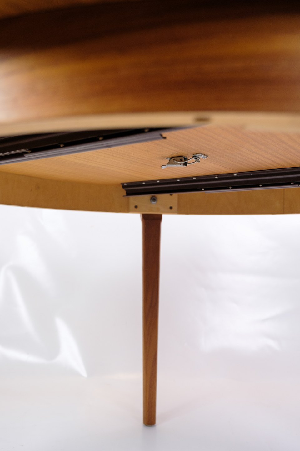 The table top is made of teak, known for its durability and beautiful, warm color tone. The natural grain patterns and rich color of the teak wood give the table a timeless and sophisticated aesthetic. The round shape makes it easy to place in different rooms and creates an inviting atmosphere that is perfect for social gatherings and family time.