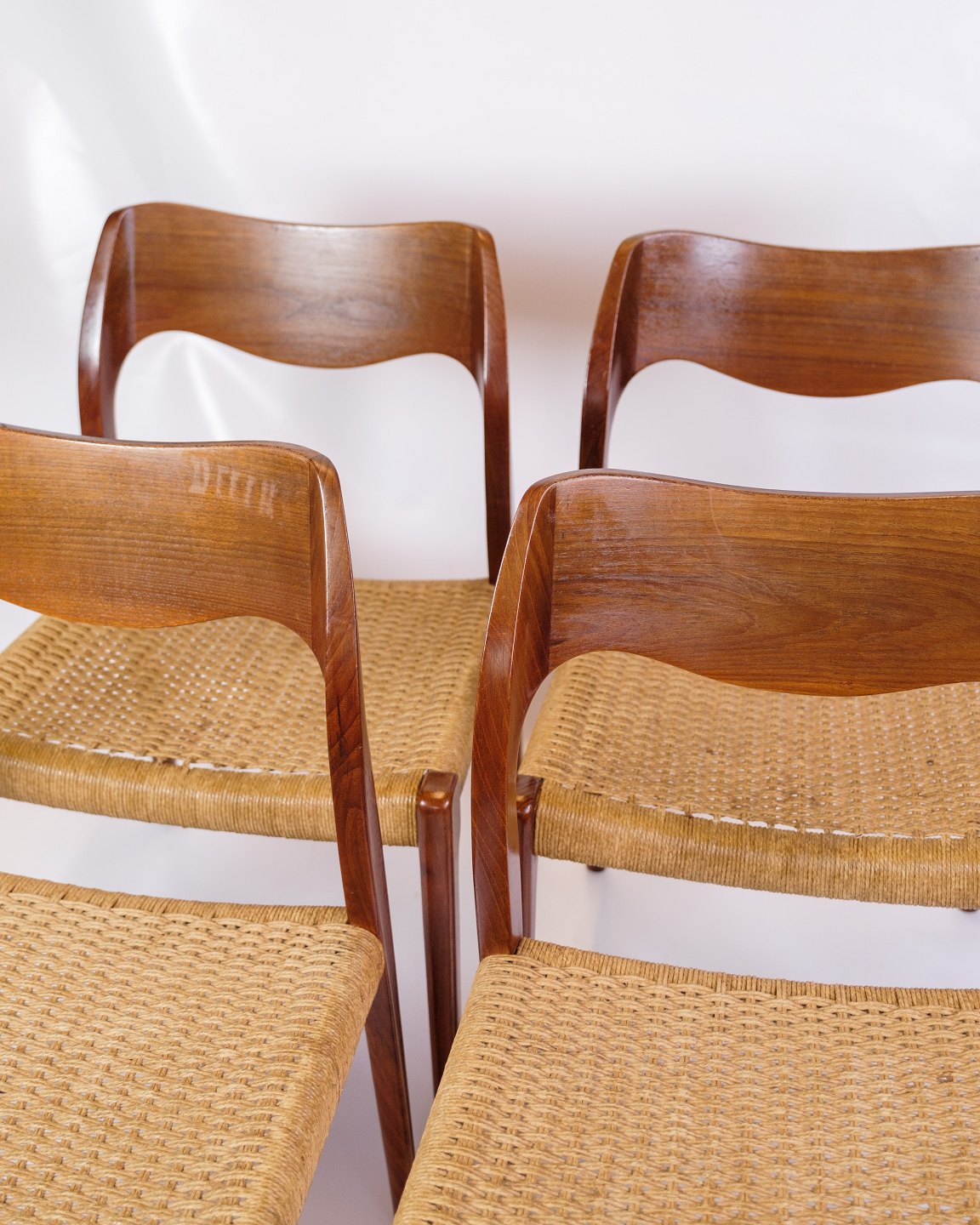 This set of four dining room chairs, model 71, designed by Niels Otto Møller in the 1960s, is an excellent example of Danish mid-century modern design. The chairs combine the natural beauty of teak wood with paper wicker, creating an elegant and timeless aesthetic.