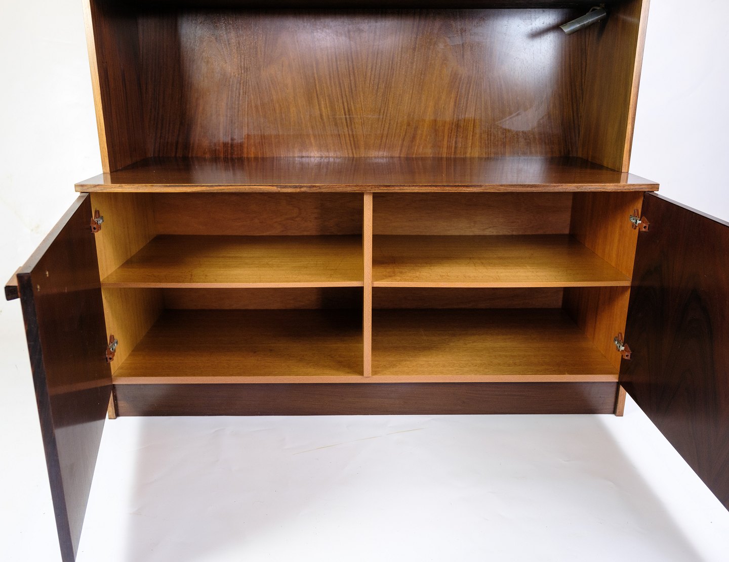 This bookcase with a light display, made from rosewood and showcasing Danish design from the 1960s, is a superb example of mid-century modern furniture. The piece combines functionality with elegance, making it a stylish and practical addition to any home.