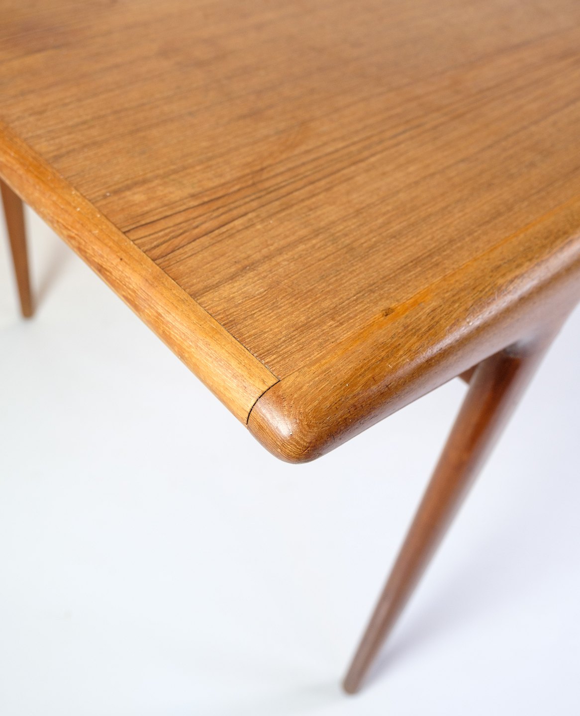 The teak wood used in this table is known for its durability and rich, warm hue. The natural beauty of the wood is emphasized by a smooth finish that both protects the surface and highlights the beautiful grain patterns. Teak is a popular material in mid-century design due to its strength and aesthetic qualities, ensuring that the table can withstand daily use while still looking elegant.