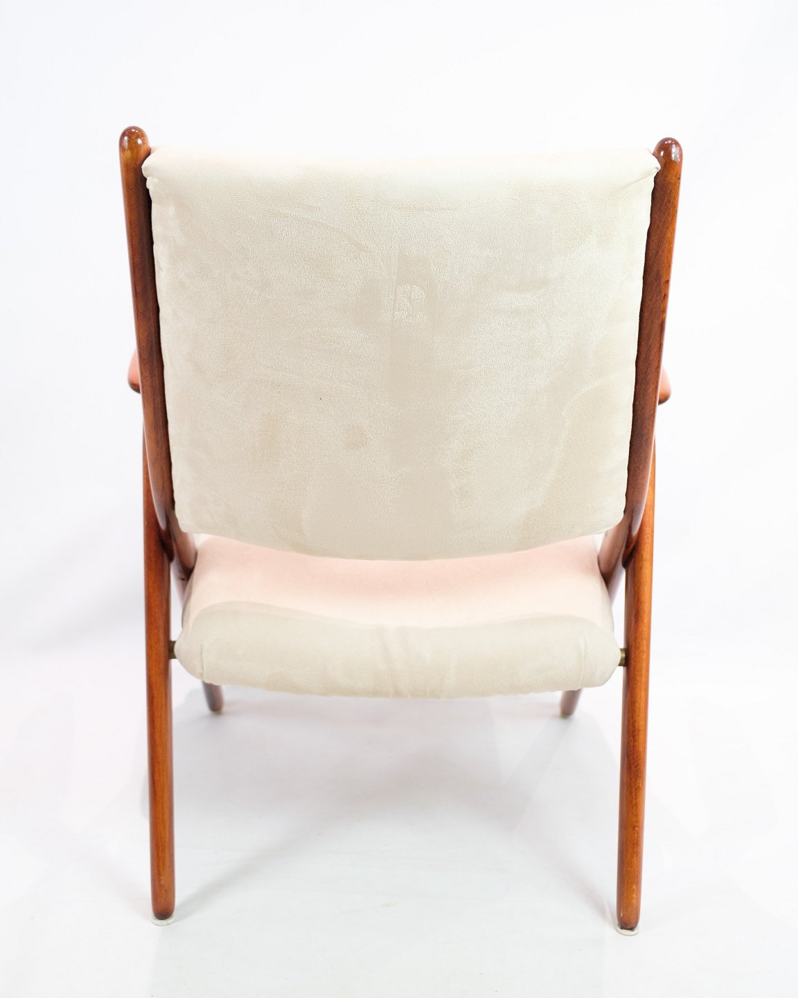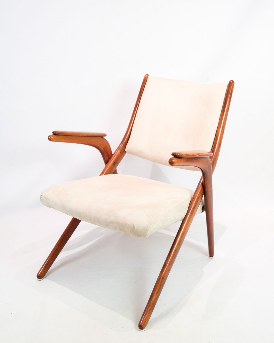 Lænestol udført i poleret mørkt træ polstret med lyst stof af den bedste kvalitet. Stolen er designet af en dansk designer ved navn Arne Hovmand-Olsen fra 1960'erne. Arne Hovmand-Olsen var en Dansk Møbelarkitekt og kom i 1938 i lære hos P. Olsen Siabast inden han i begyndelsen af 1950'erne begyndte at designe sine egne stole med stor succes. Han stole er i dag meget eftertragtet både nationalt og internationalt.