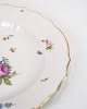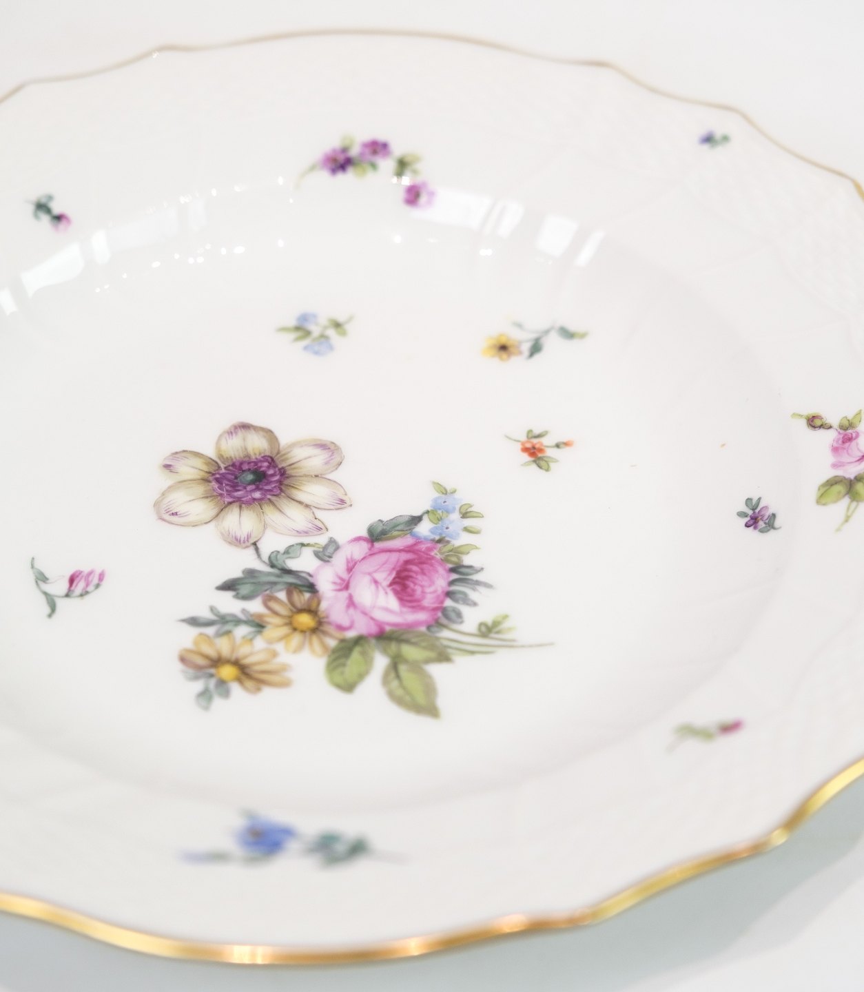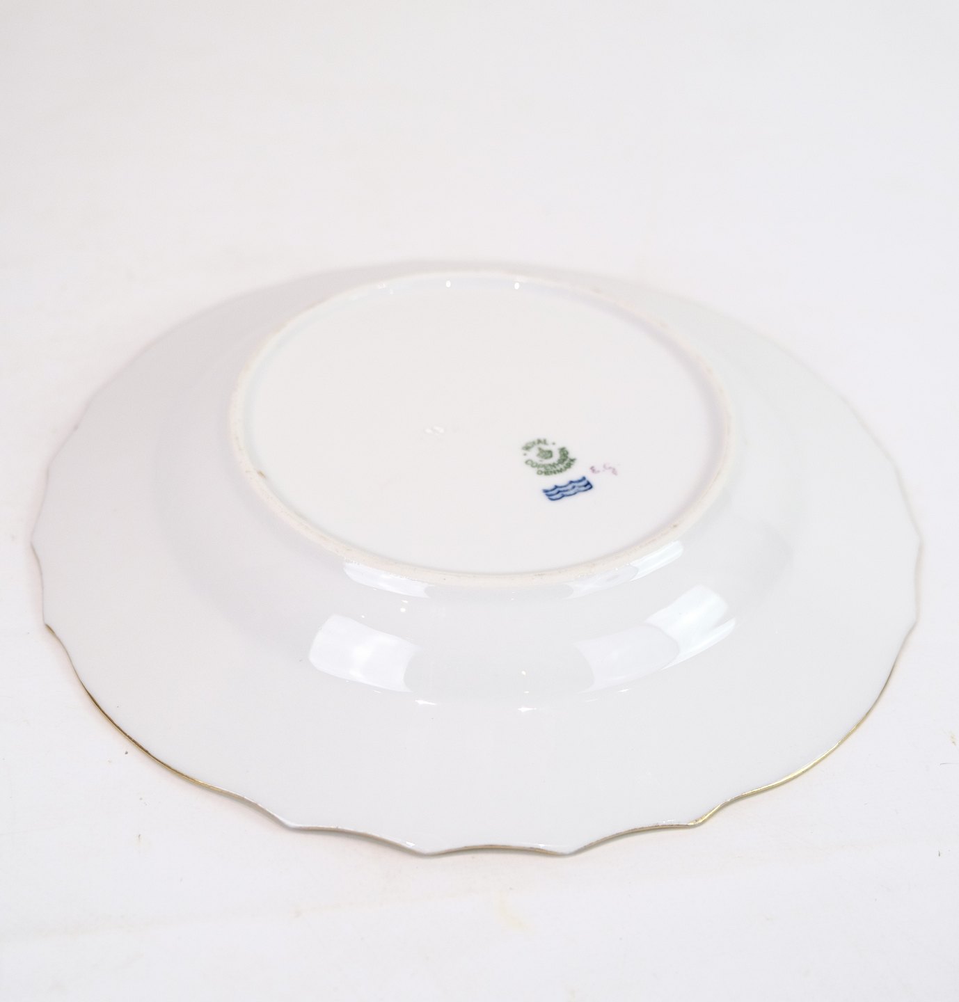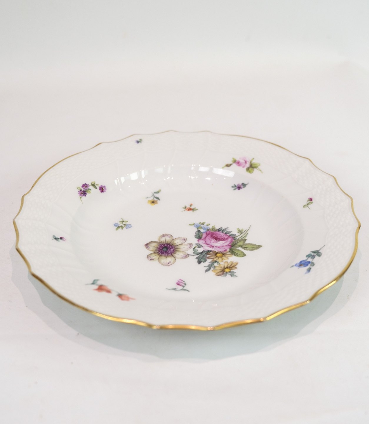 Royal porcelain dinner plates with patterned Saxon flower decorated on the edge with gold. Manufactured by Royal Copenhagen in approx. 1923, where all their goods have been hand painted and subsequently become very rare. The plates are free of flaws or defects.