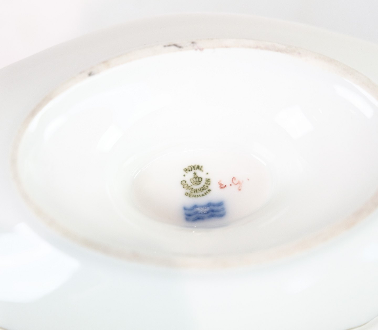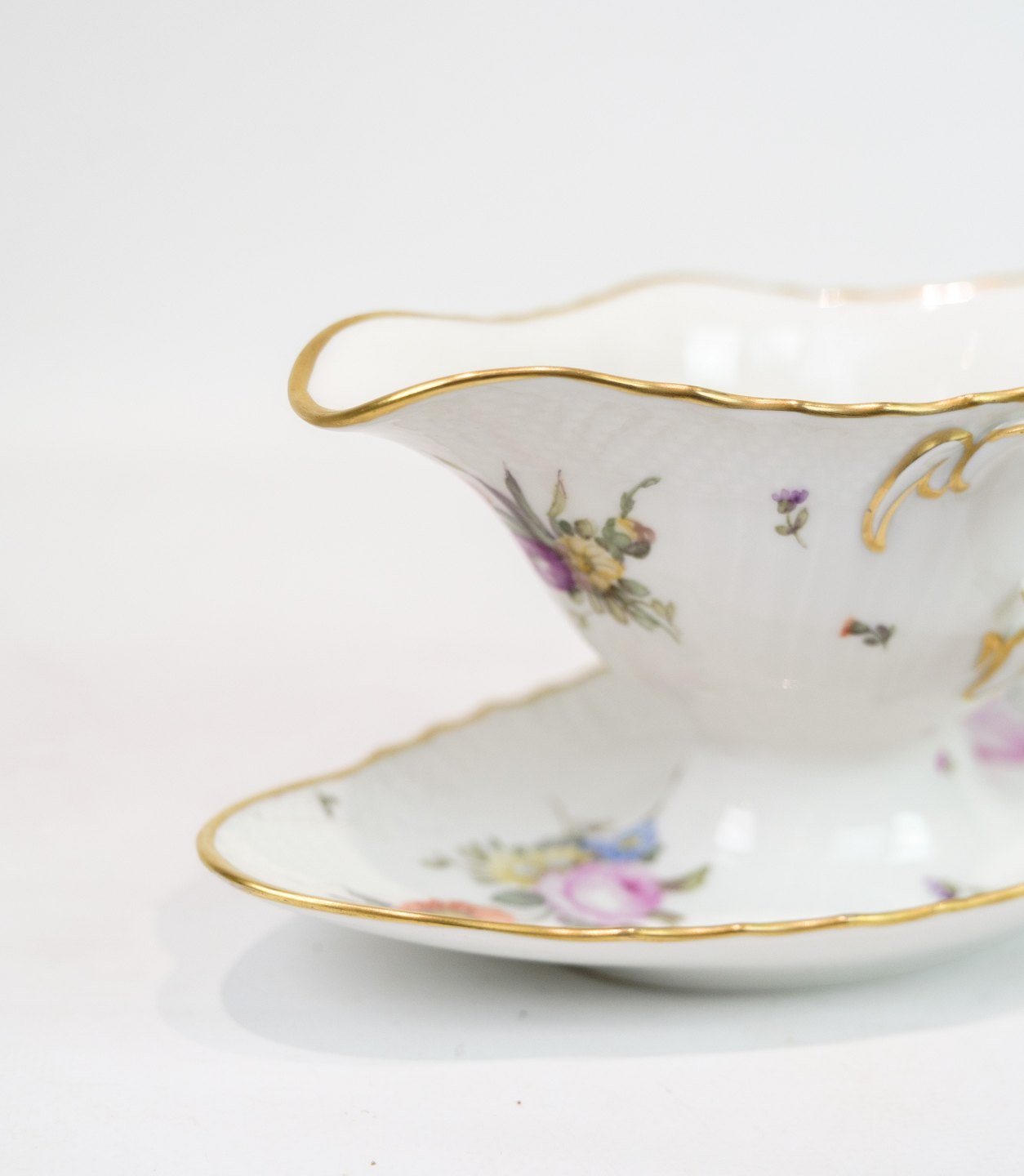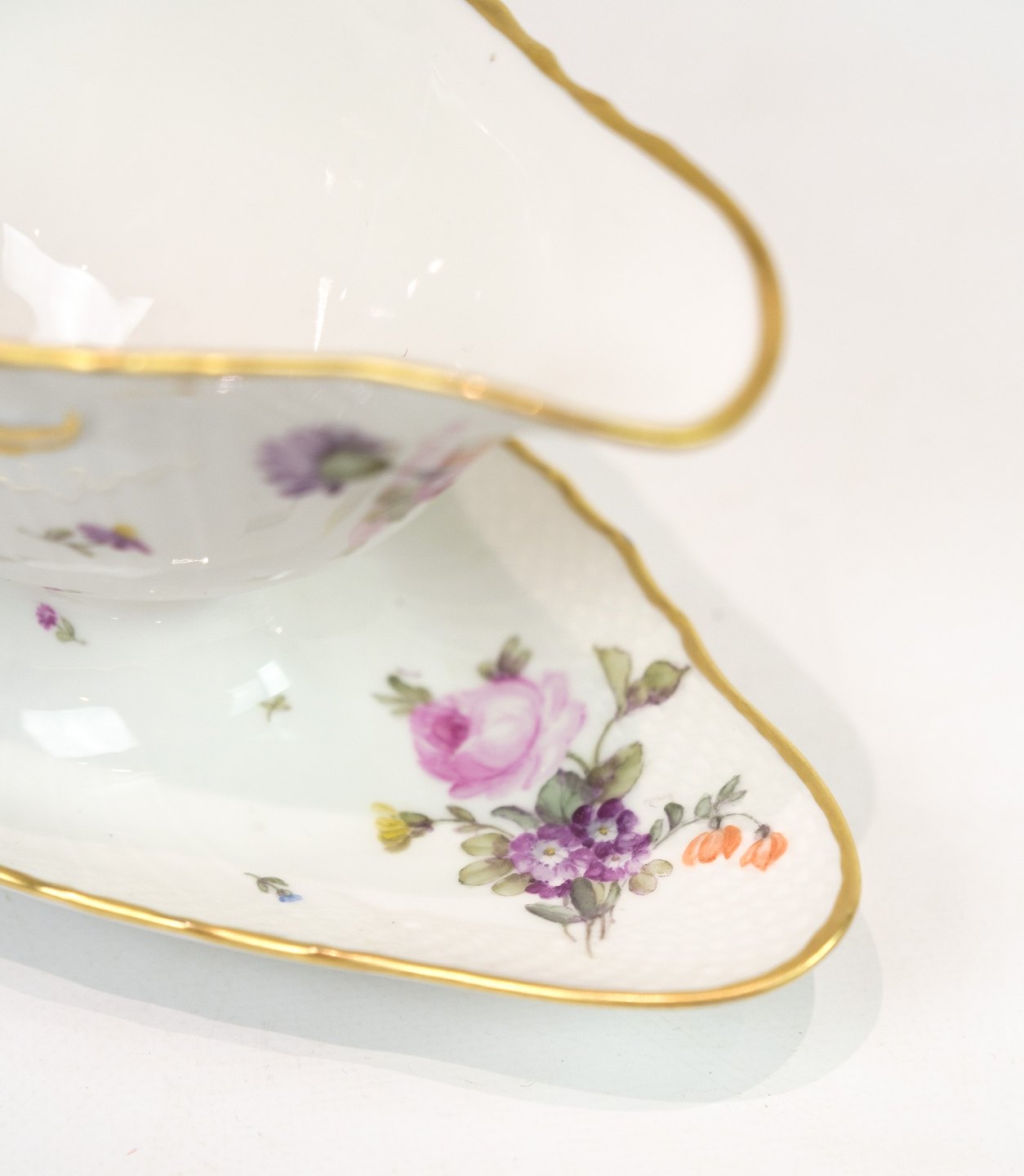 Sauce bowl of Royal porcelain with patterned Saxon flower decorated on the edge with gold. Manufactured by Royal Copenhagen in approx. 1923, where all their goods have been hand painted and subsequently become very rare. The sauce bowl is without flaws or defects.
