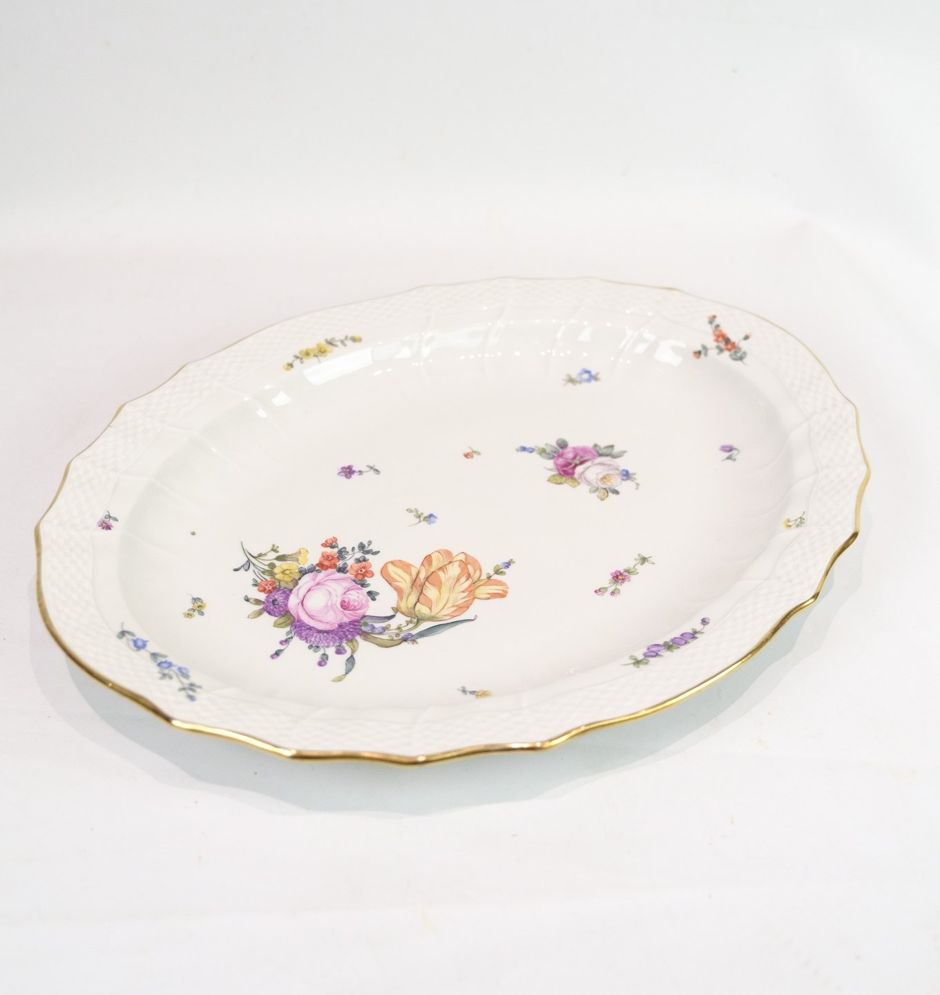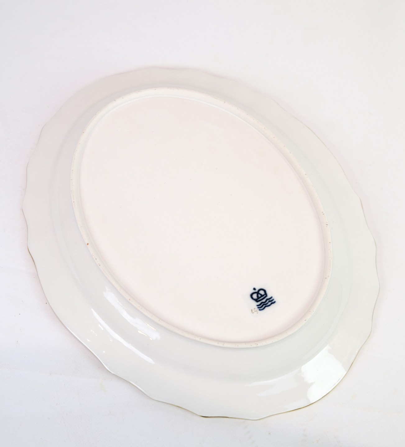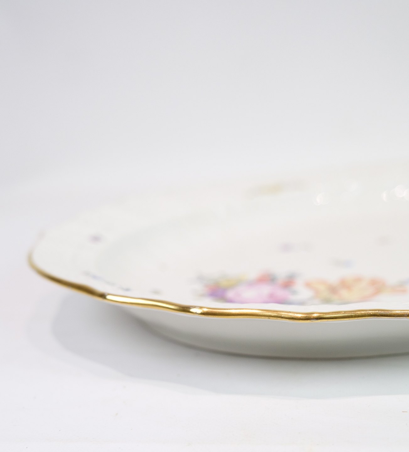Dish of Royal porcelain with patterned Saxon flower decorated on the edge with gold. Manufactured by Royal Copenhagen in approx. 1923, where all their goods have been hand painted and subsequently become very rare. The dish is without flaws or defects.