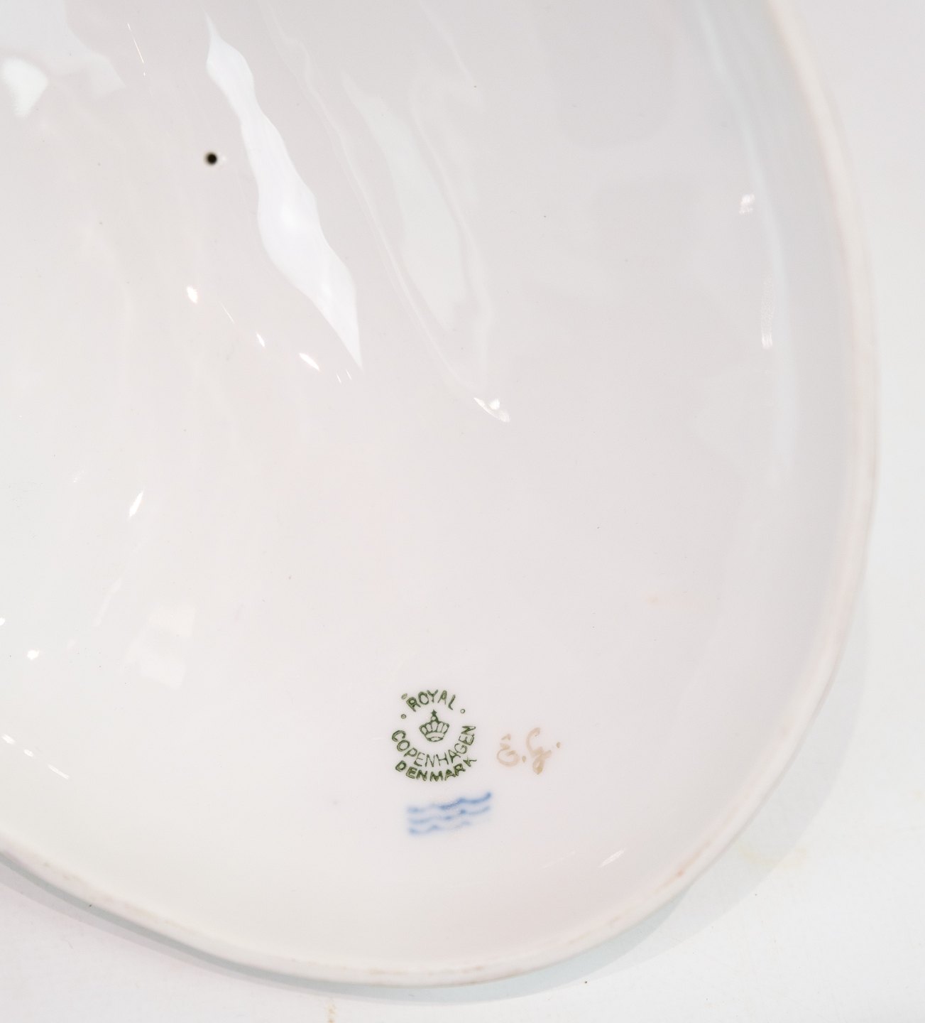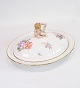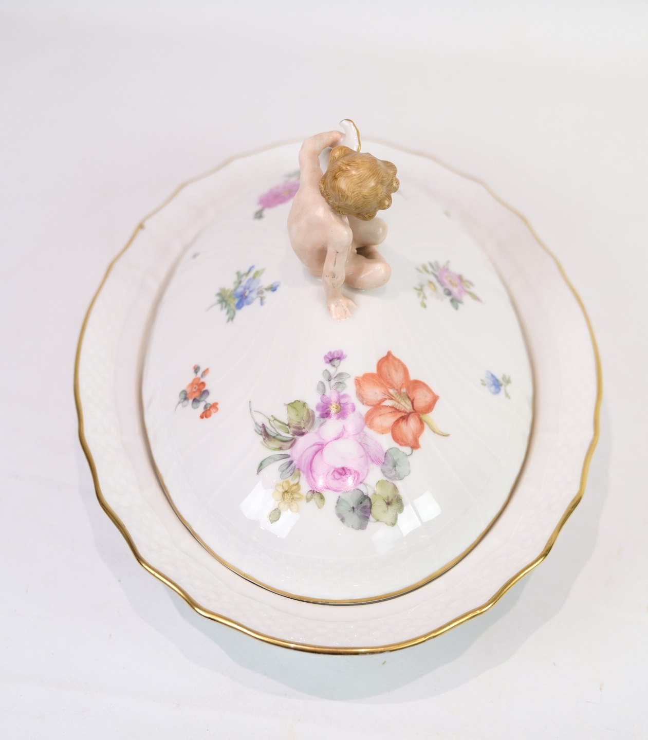 Stort Låg Fad dekoreret med en "Putti" siddende på låget lavet af Kongelig porcelæn med mønstret Saksisk blomst dekoreret i kanterne med guld. Fremstillet af Royal Copenhagen i ca. 1923, hvor alle deres varer er blevet håndmalet og efterfølgende blevet meget sjældne. Fadet står uden mangler eller defekter.