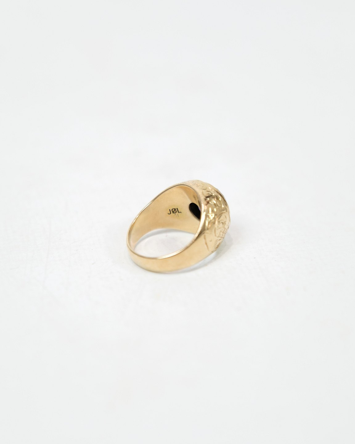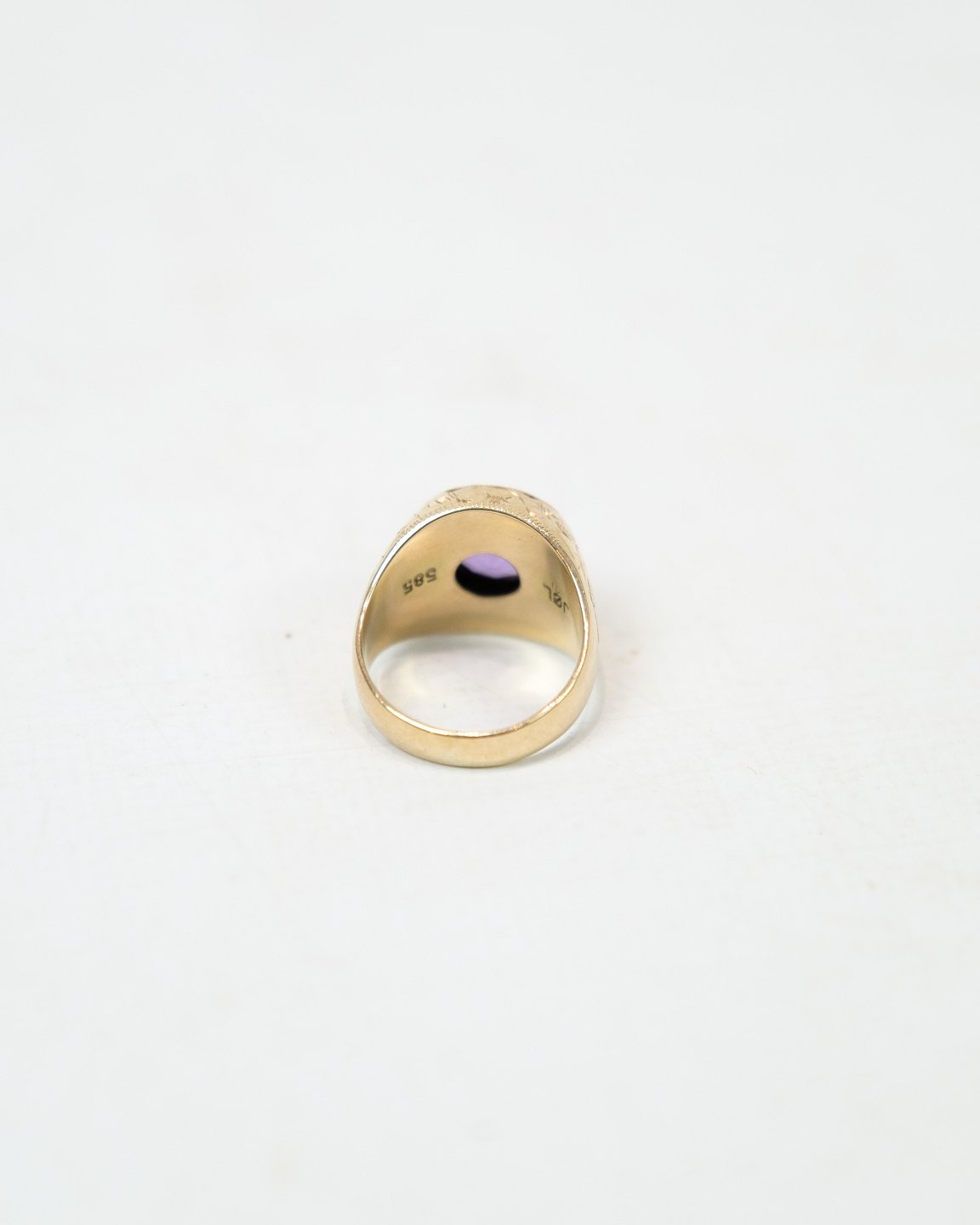 This ring is made of 14 carat gold and decorated with a beautiful amethyst. The ring is stamped with CHRISTMAS. Amethyst is known for its beautiful and rich purple hues and is a popular gemstone.
