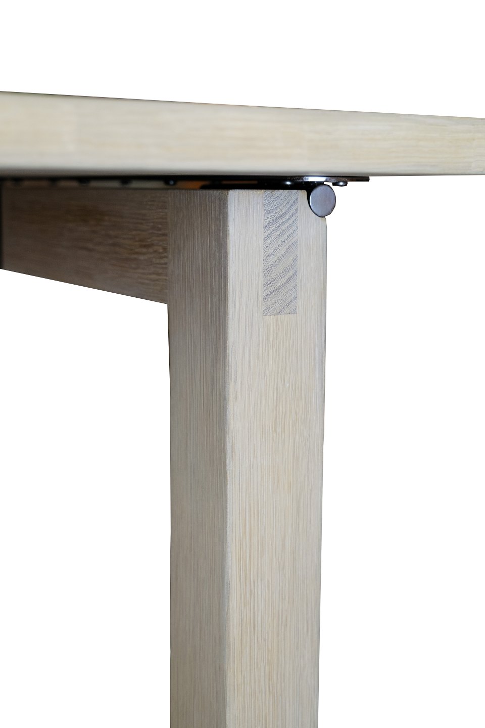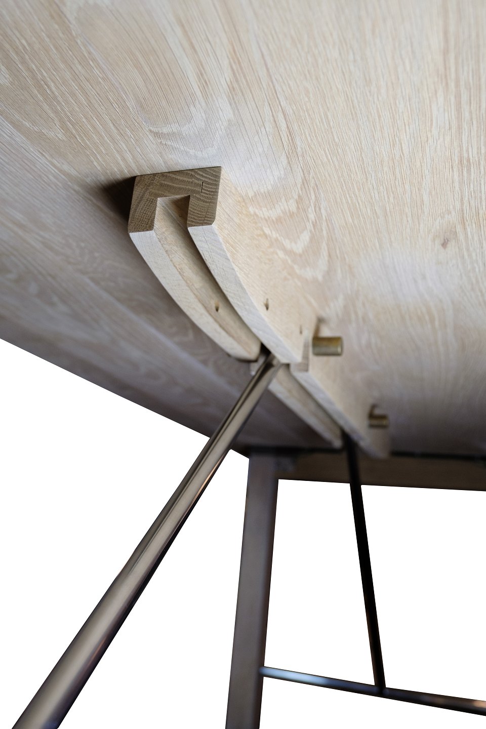 Spisebord af Massiv egetræ tegnet af Hans Thyge Raunkjær fremstillet af Trip trap med skråstiver af forkromet metal. Bordet er blevet efterset på vores værksted og står i meget flot stand. Næsten som nyt.