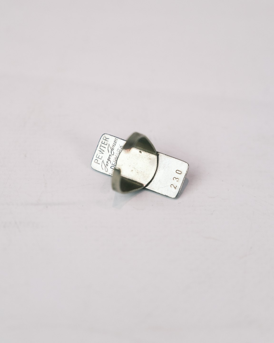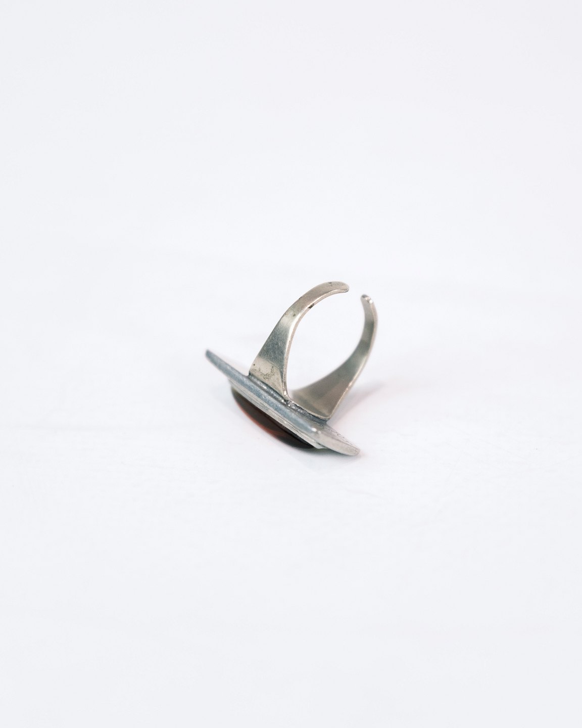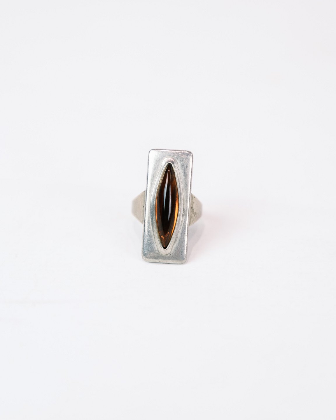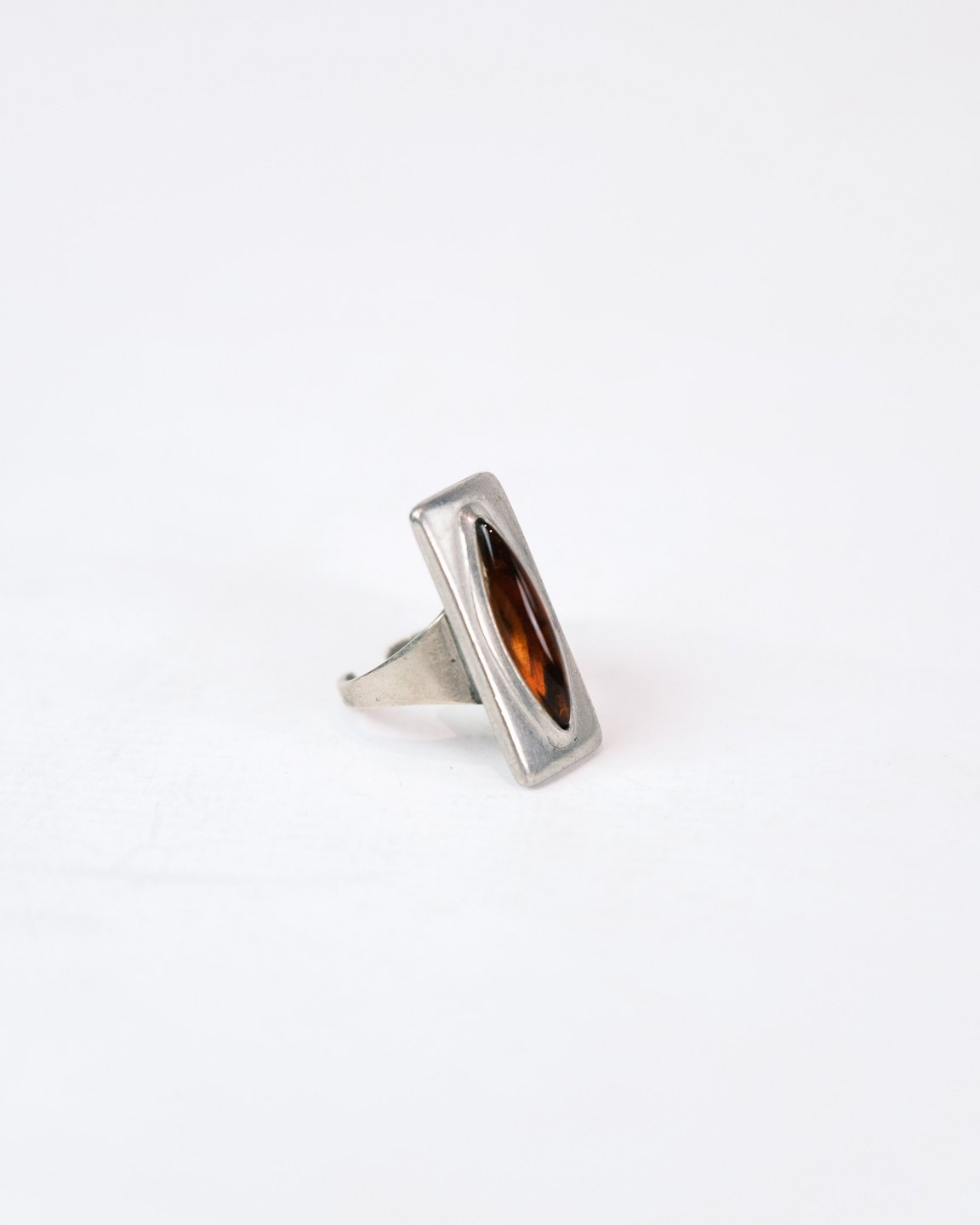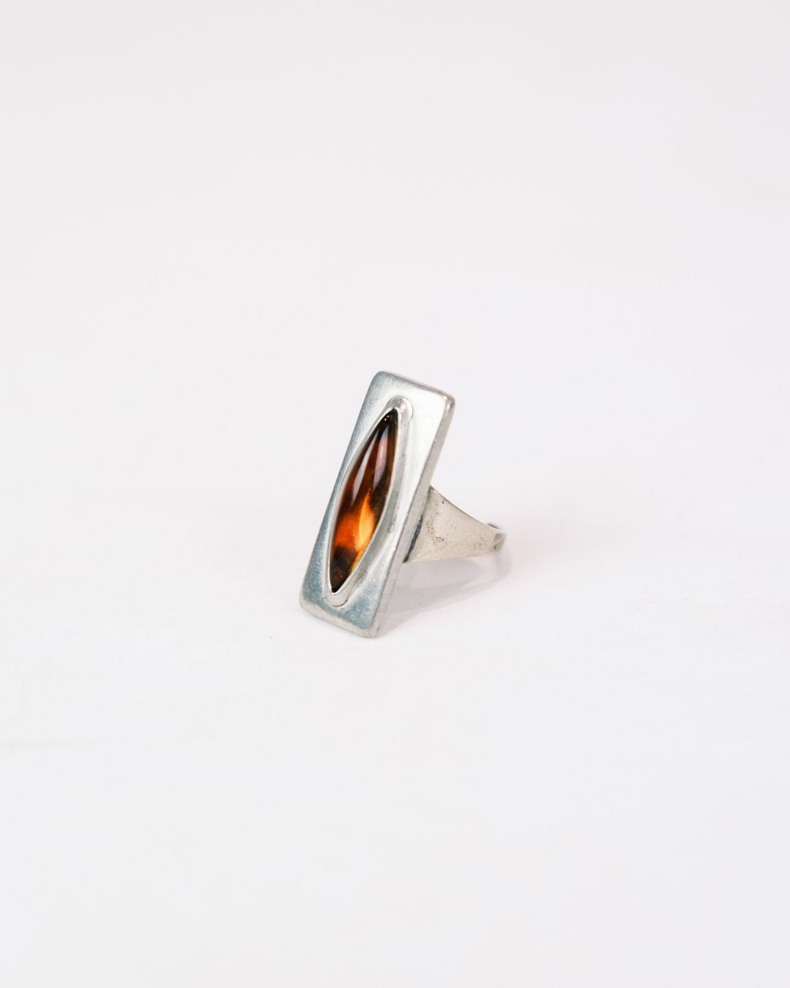 Vintage ring i tin, udsmykket med rav, designet af Jørgen Jensen i 1960'erne. Jørgen Jensen, anerkendt for sine designs i pewter, skabte smykker, der balancerer enkelhed og naturlig skønhed. Denne ring kombinerer det varme udtryk fra ravet med det kølige tin, hvilket gør den til et tidløst og unikt smykke fra 1960'erne.