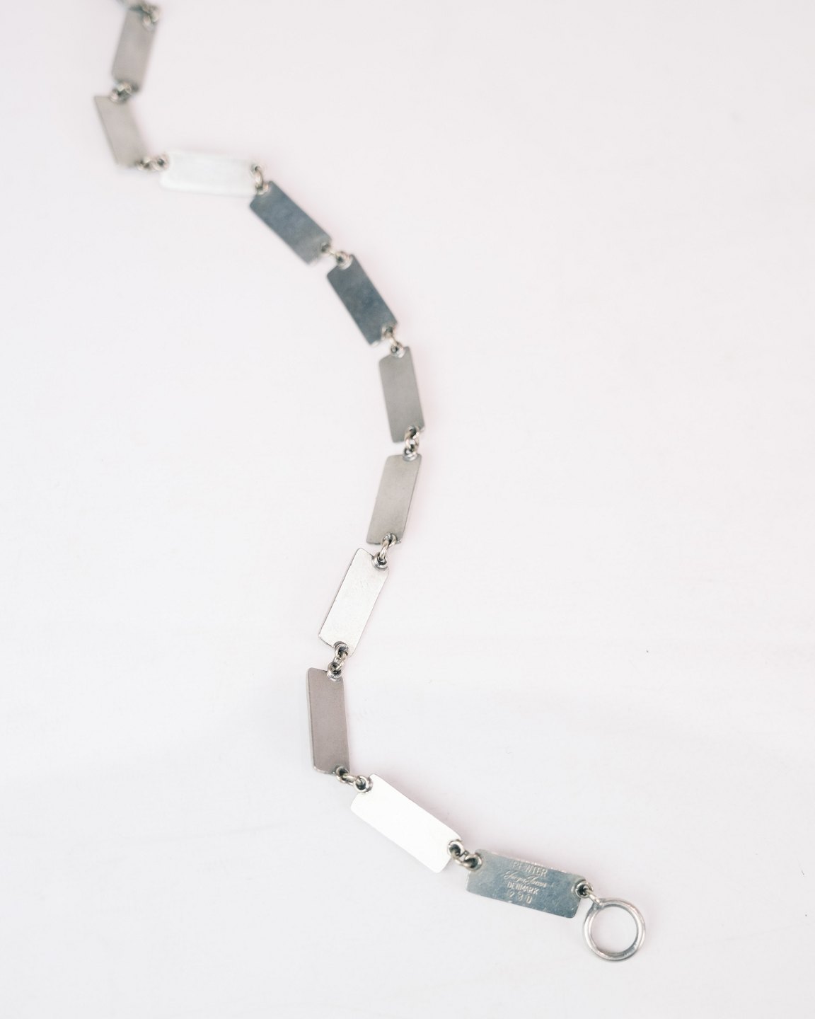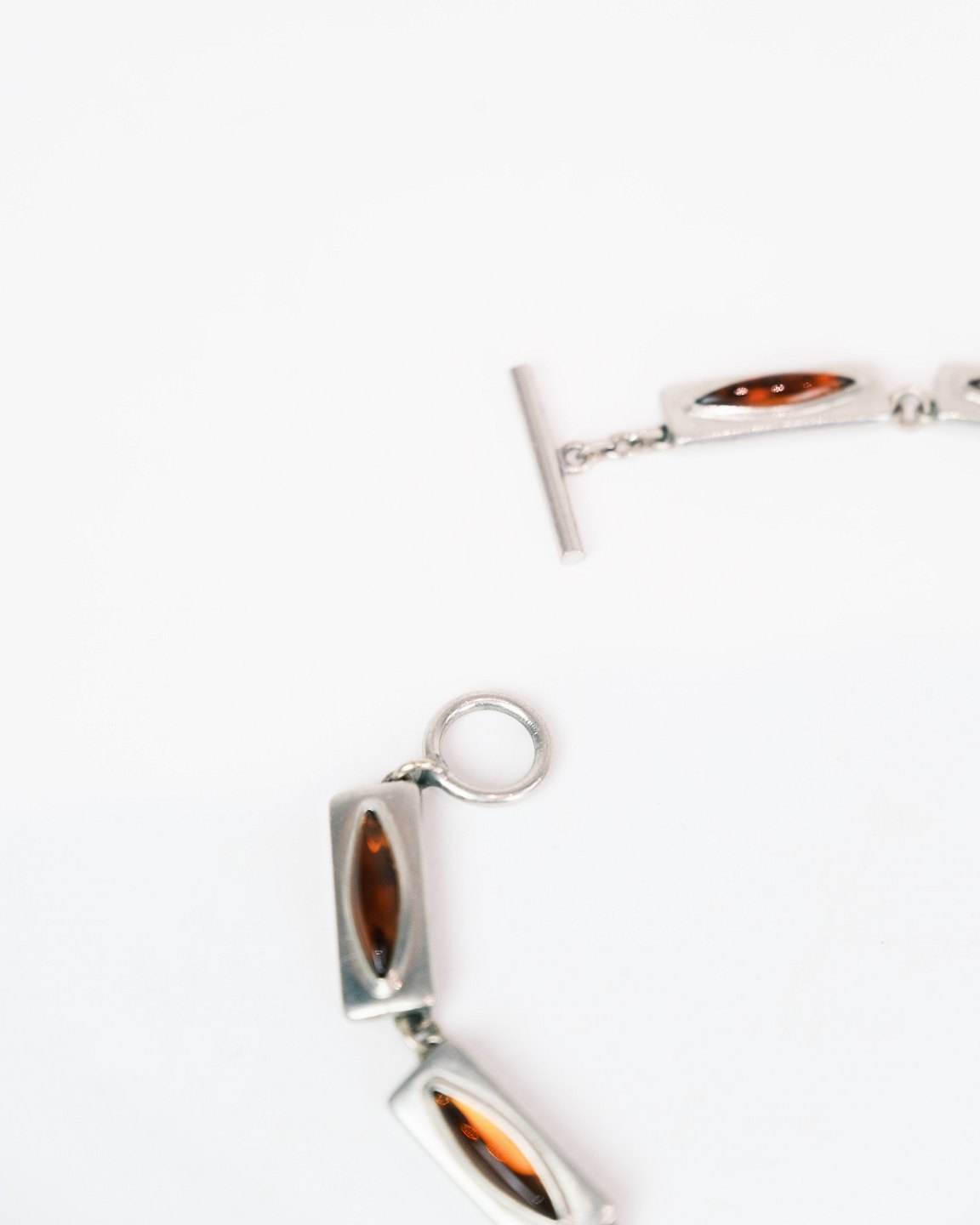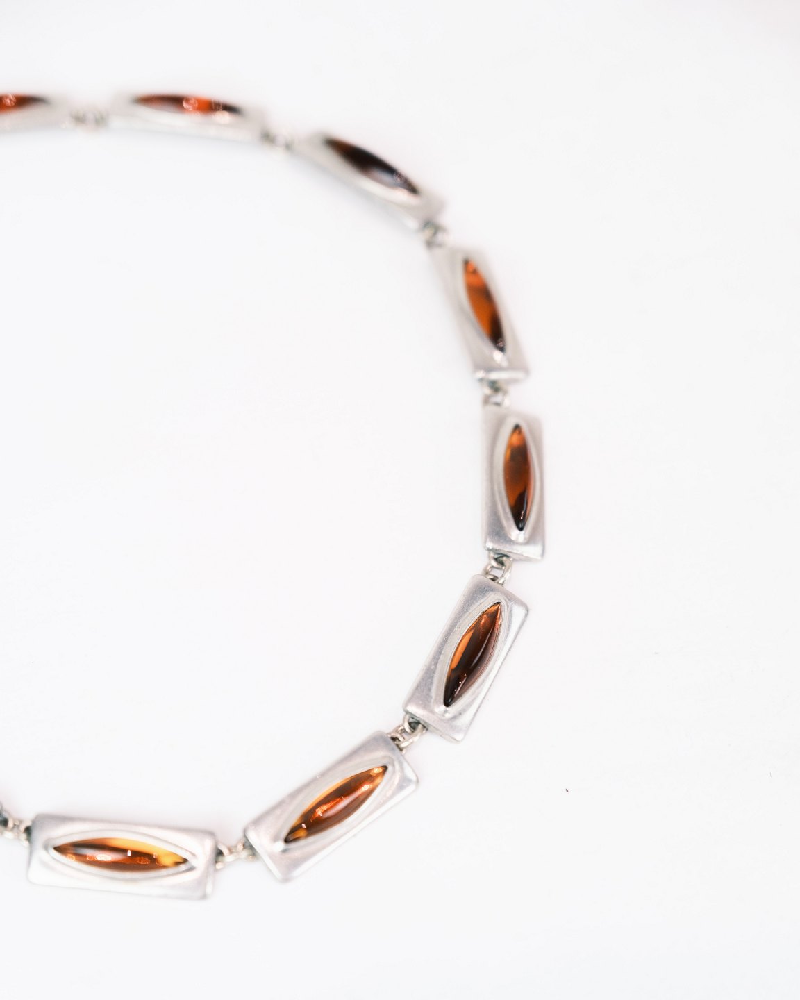 Necklace in tin, decorated with amber, designed by Jørgen Jensen in the 1960s. Jørgen Jensen, known for his work with pewter, created jewelery that combined simplicity and the beauty of nature. This necklace is a timeless example of his design, where the warm amber plays beautifully with the cool tin.