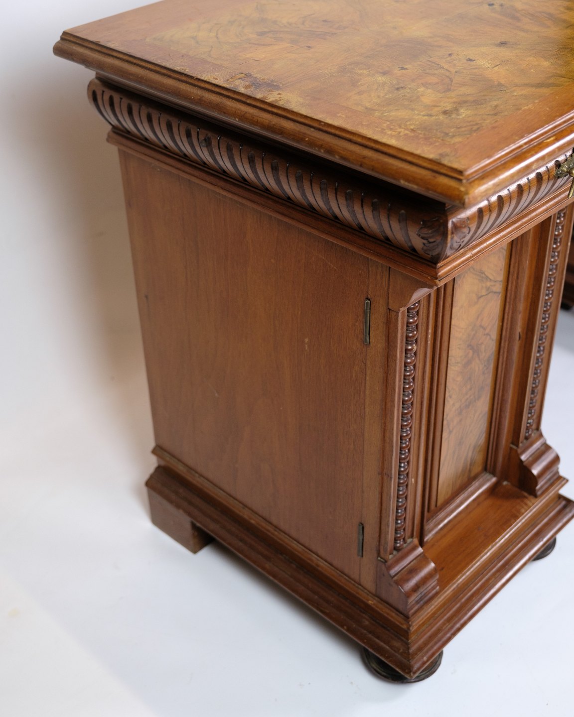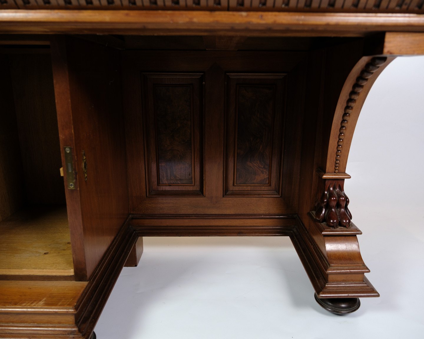 Antikt skrivebord med et lille side skab til opbevaring, udført i valnød fra 1860erne. Står i meget pæn stand.