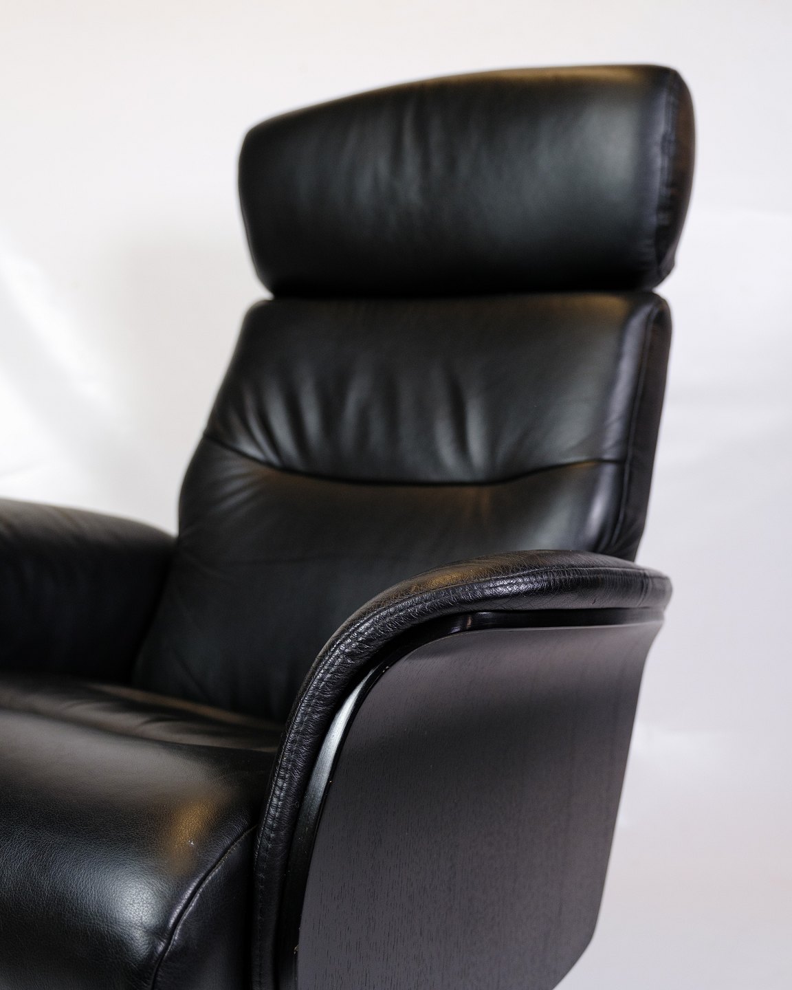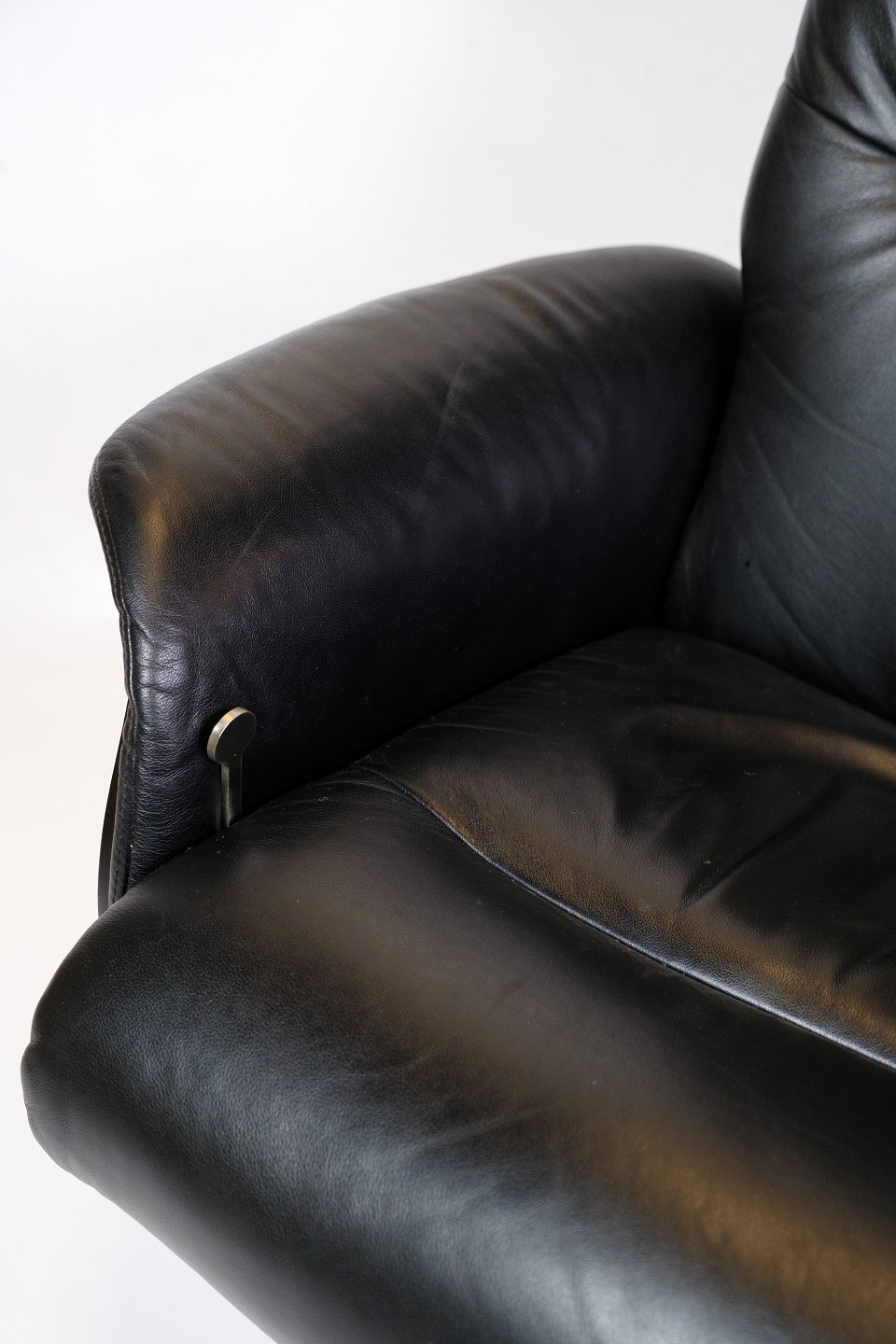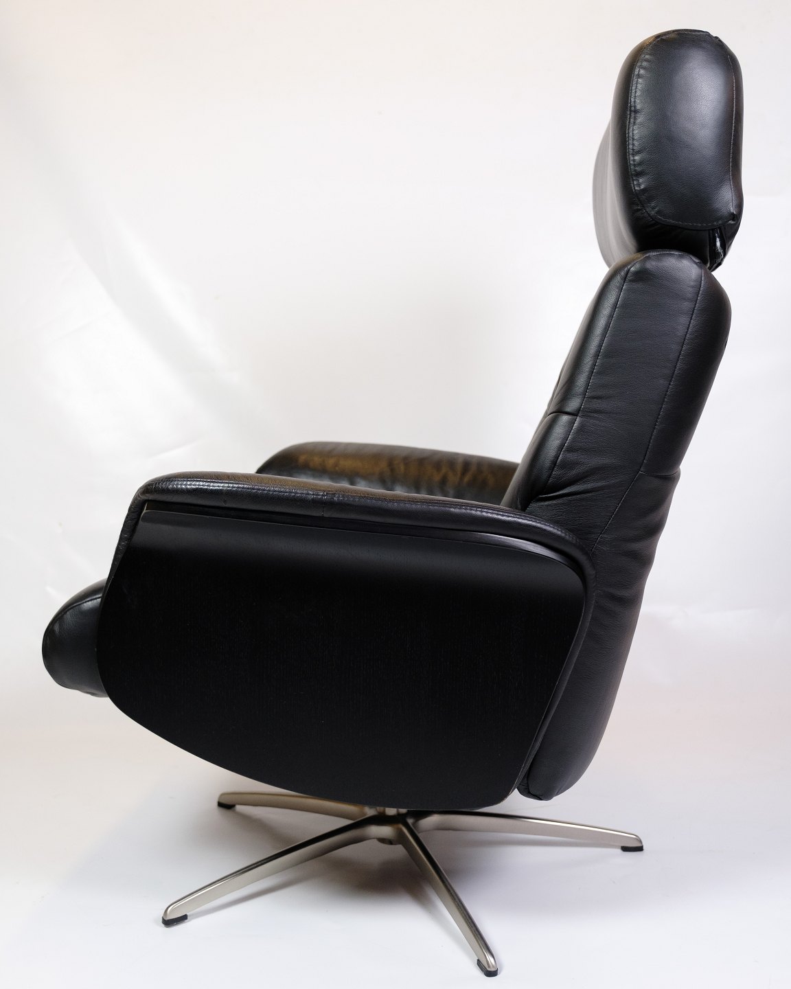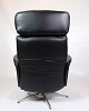 Lænestol betrukket i sort læder med drejefod af aluminium fra 1970'erne.