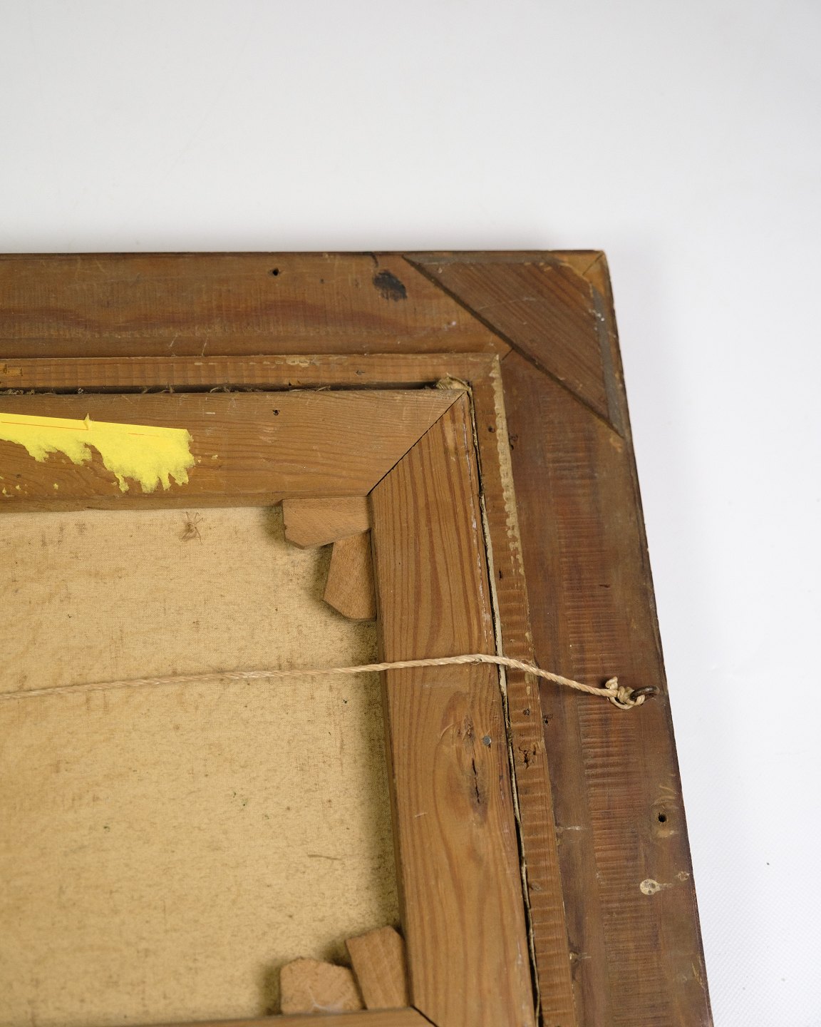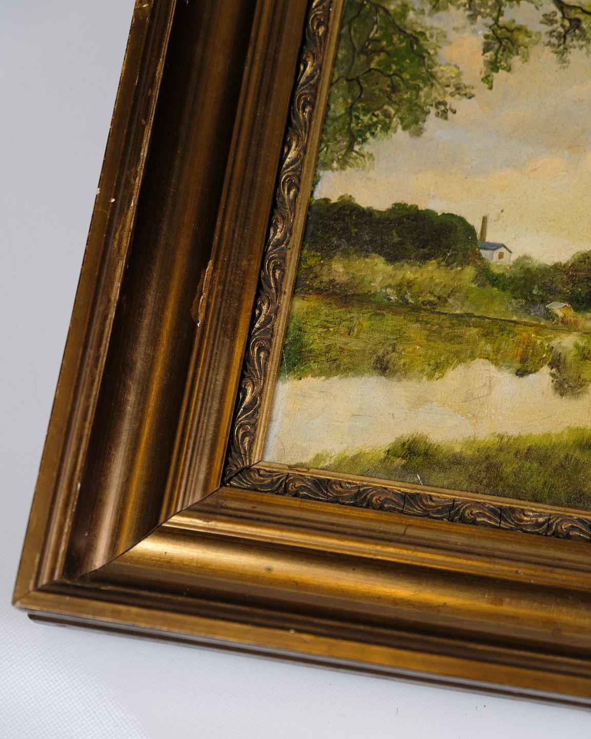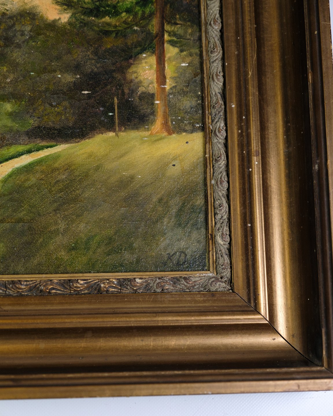 Oil painting framed in a gilded wooden frame with motif forest landscape in warm colors signed by Kai Drews from the 1930s