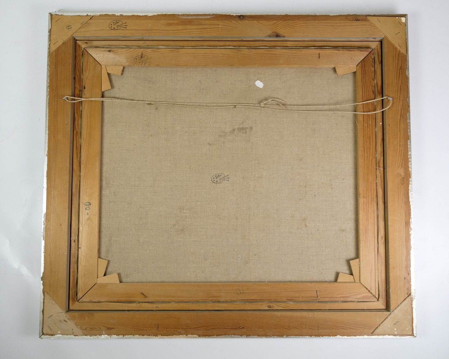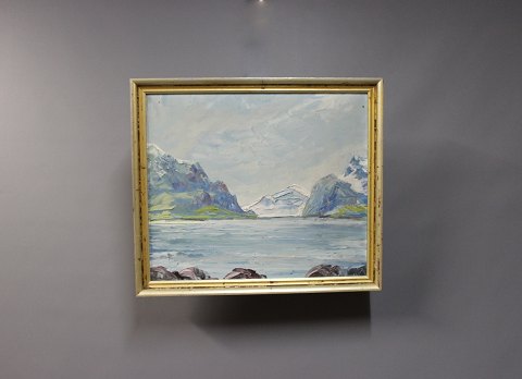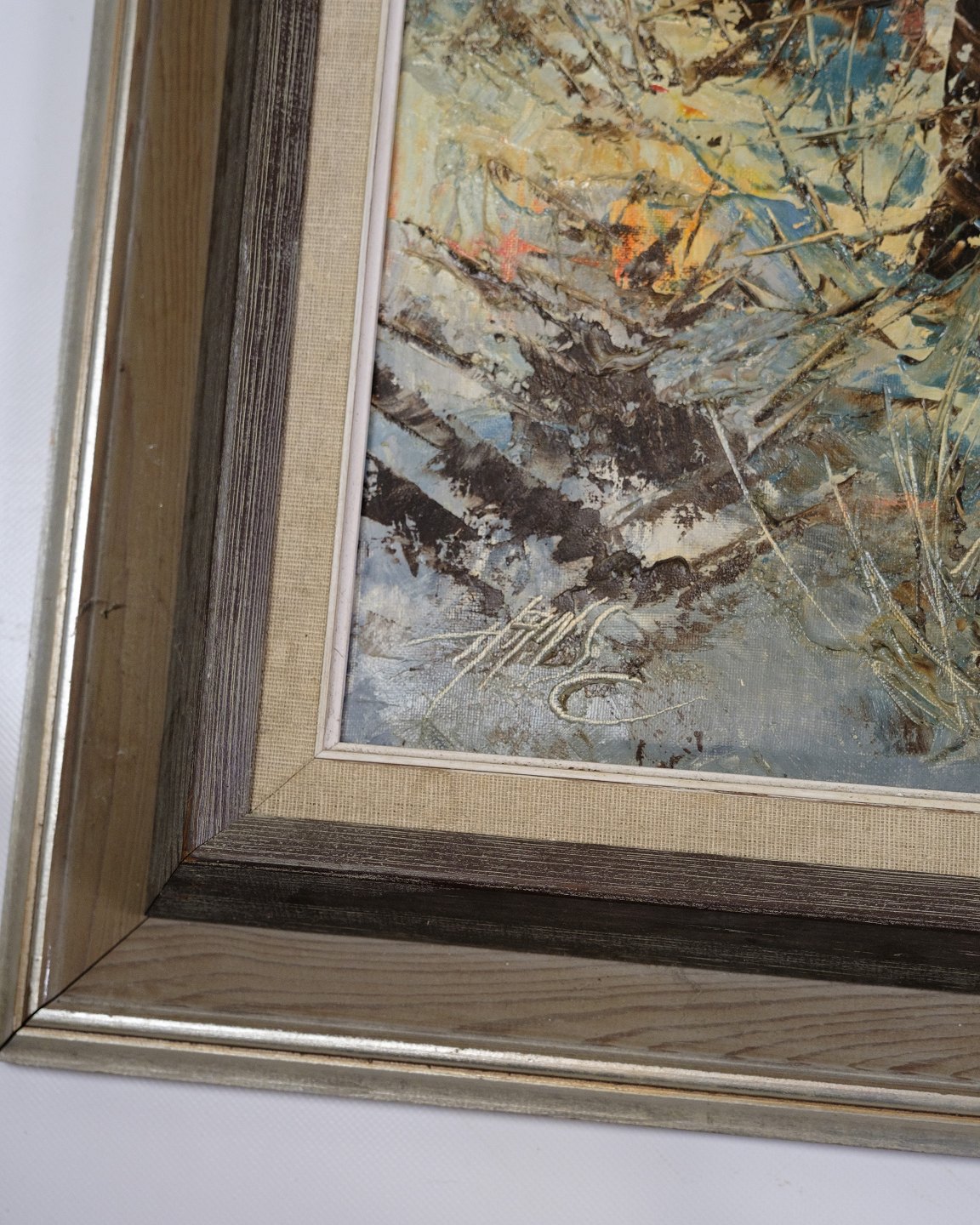 Oil painting with a motif of a snow-covered spruce forest and a sunset in the background, which creates an atmospheric light over the landscape. The painting is framed in a solid wooden frame, which emphasizes the natural beauty of the subject.