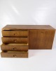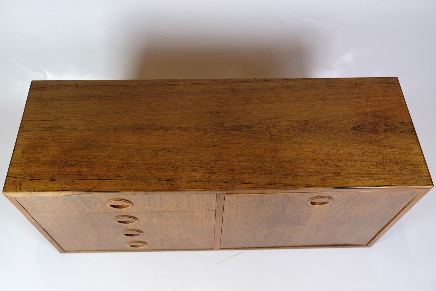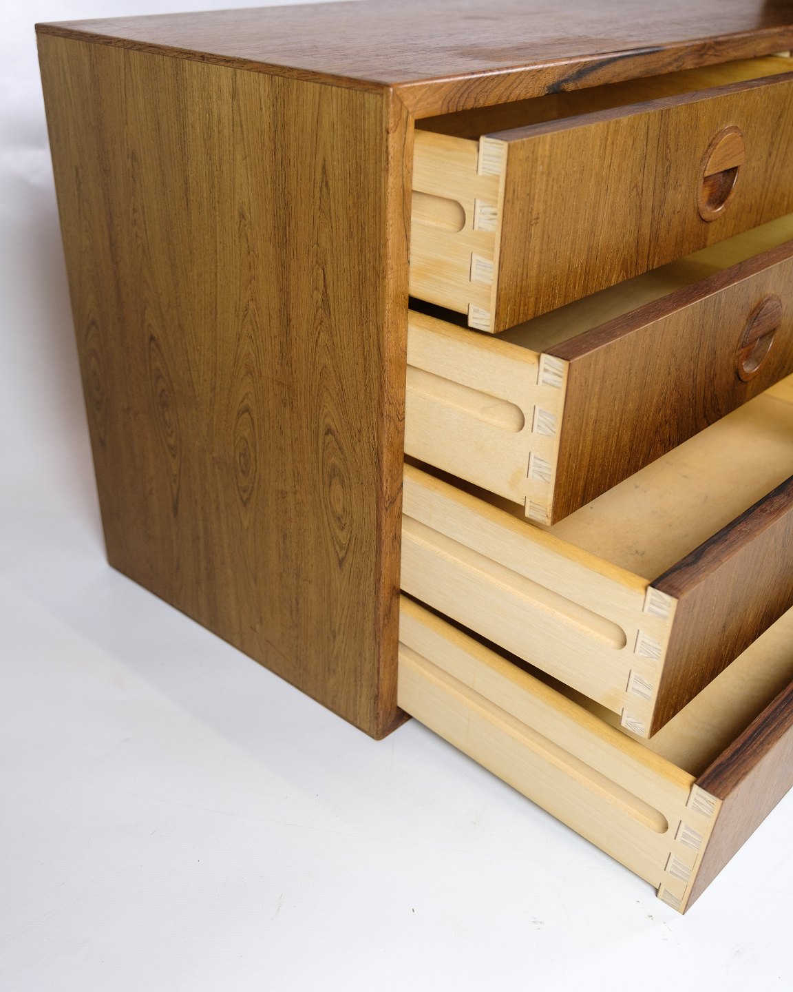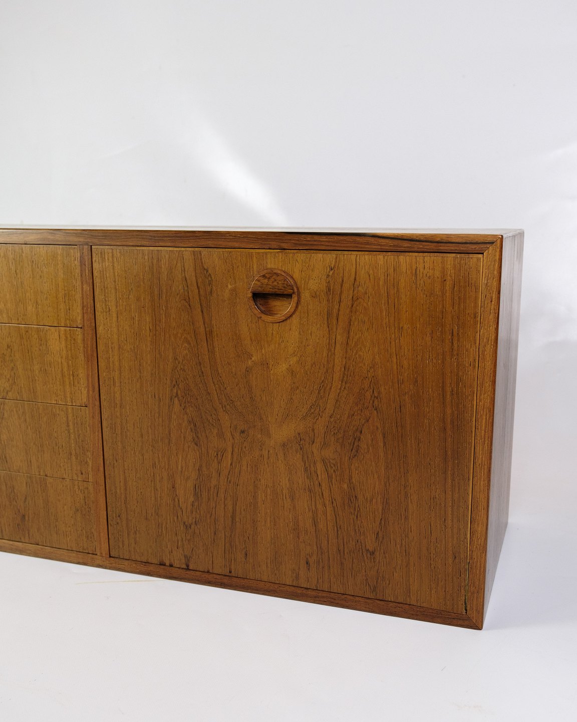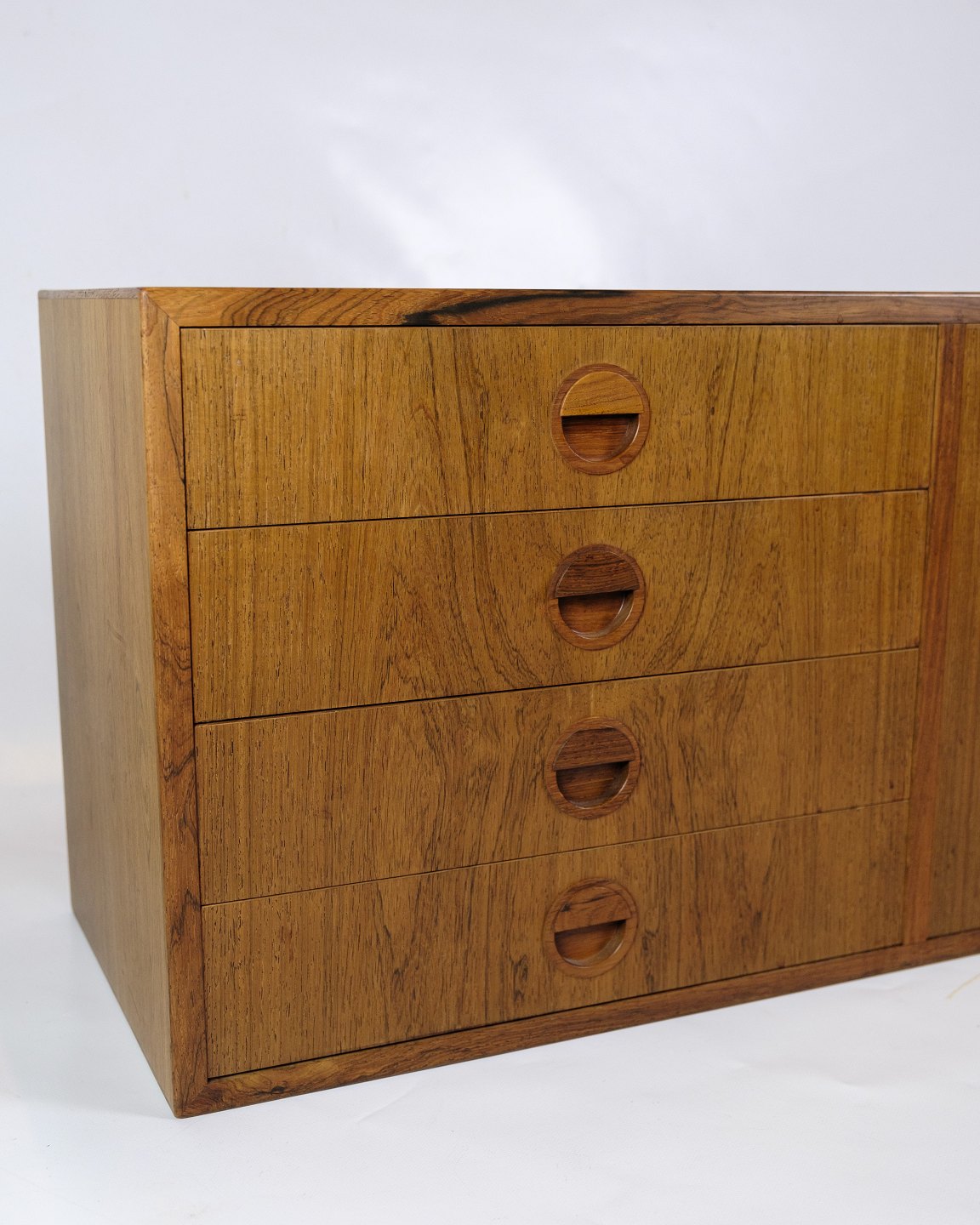 Wall-hung chest of drawers/cabinet in rosewood from the 1960s, of Danish design. The dresser/cabinet has 4 small drawers and a large compartment and is equipped with nice handles that give it an extra touch of elegance and good craftsmanship.