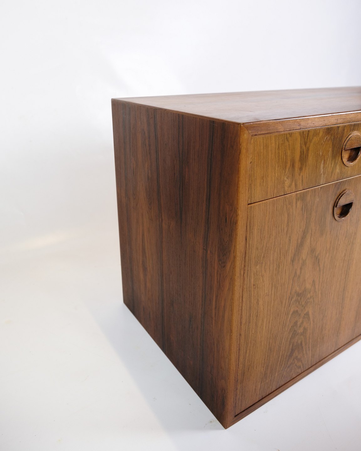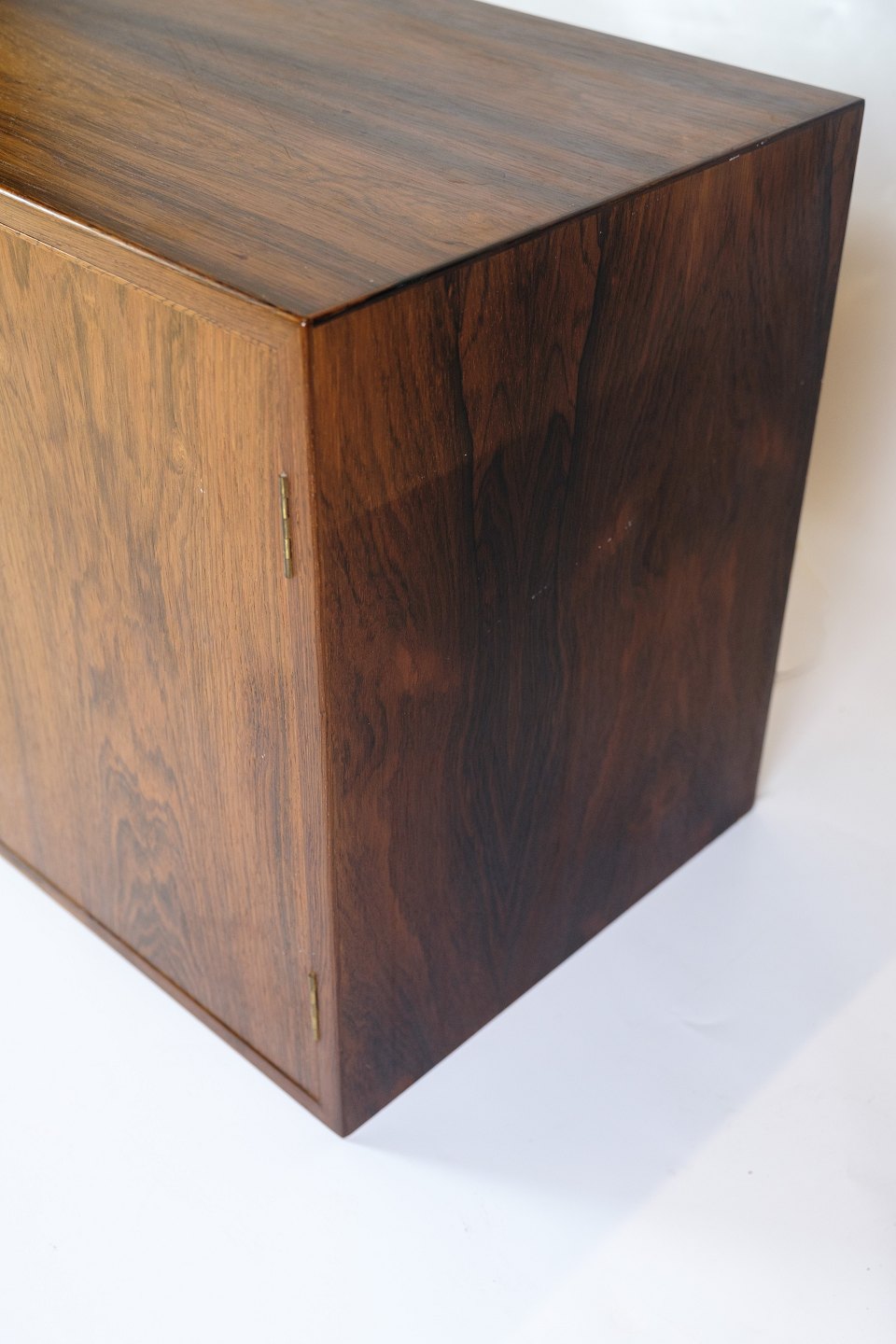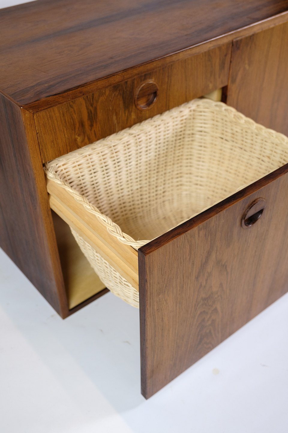 SoldWall-hung chest of drawers/cabinet in rosewood from the 1960s, of Danish design. The chest of drawers has a space-saving construction and is made of rosewood, which gives it an elegant appearance.