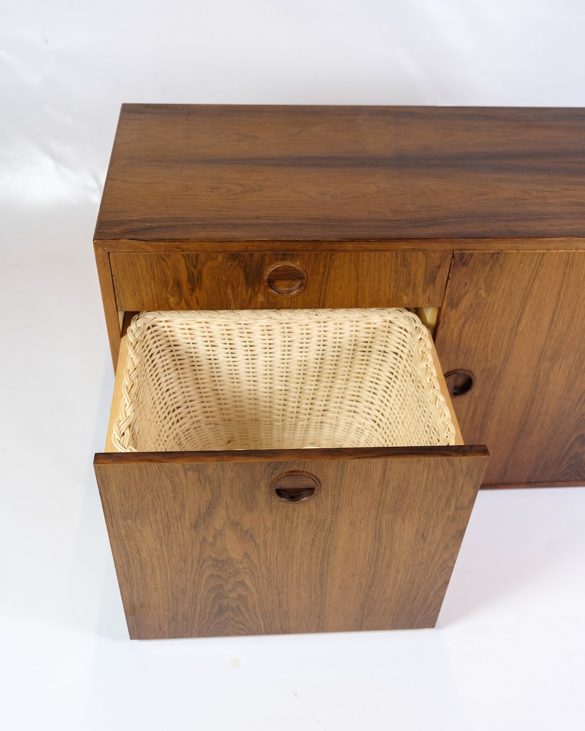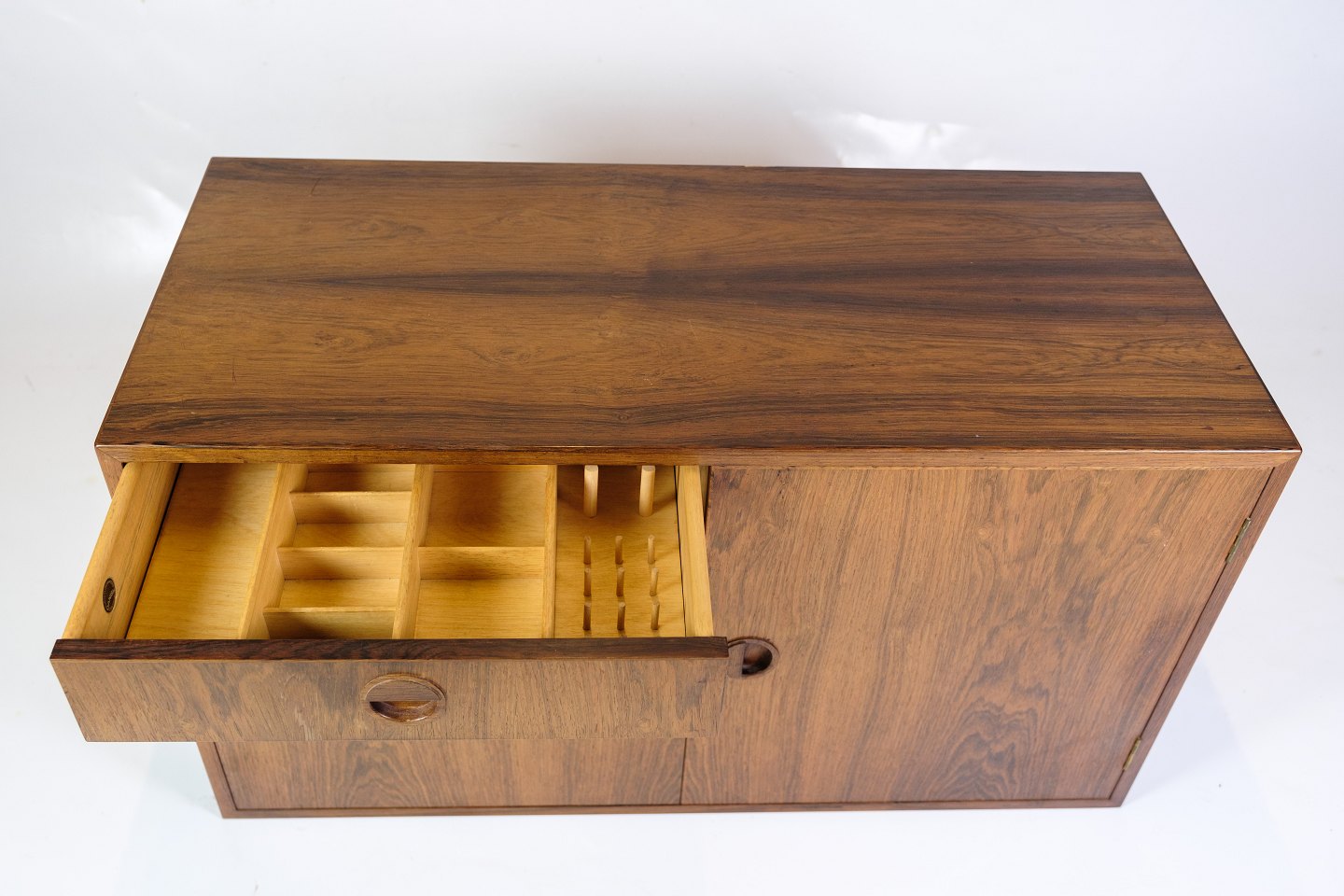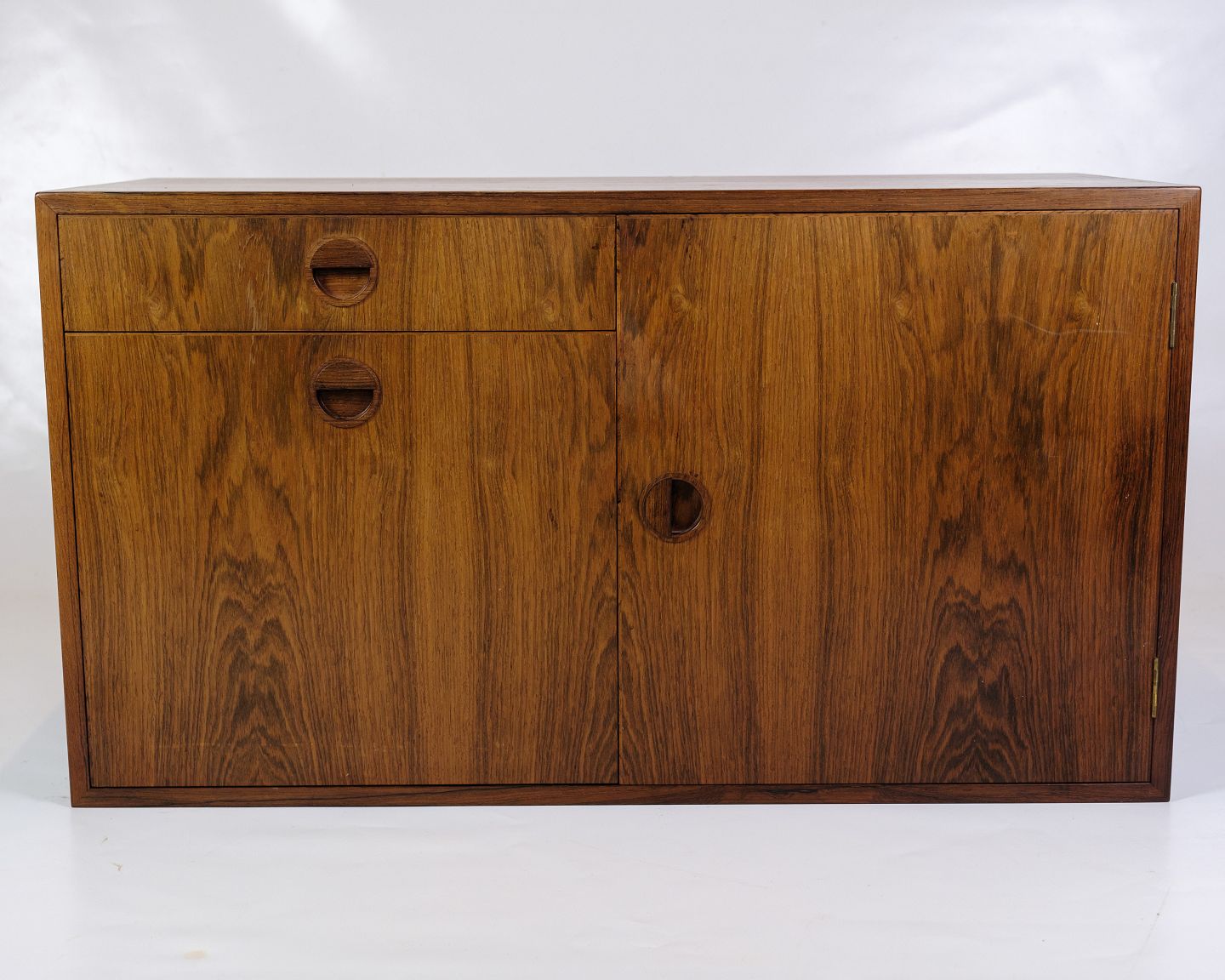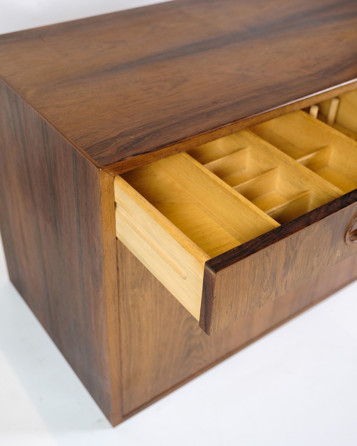SoldWall-hung chest of drawers/cabinet in rosewood from the 1960s, of Danish design. The chest of drawers has a space-saving construction and is made of rosewood, which gives it an elegant appearance.