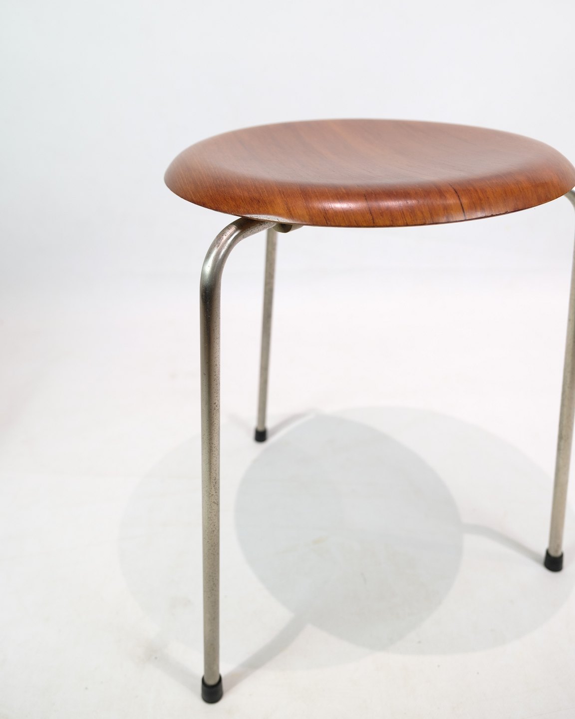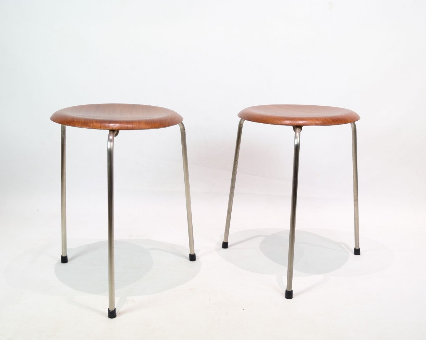 SoldSet of 2 Dot stools, model 3170, designed by Arne Jacobsen and produced by Fritz Hansen in the 1950s. The stools are made of teak, which gives them a warm and classic look. The Dot stool is an example of Jacobsen's minimalist and functional design style.