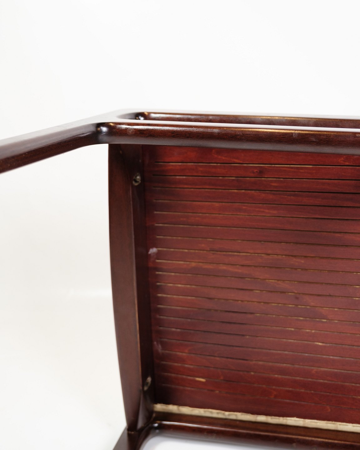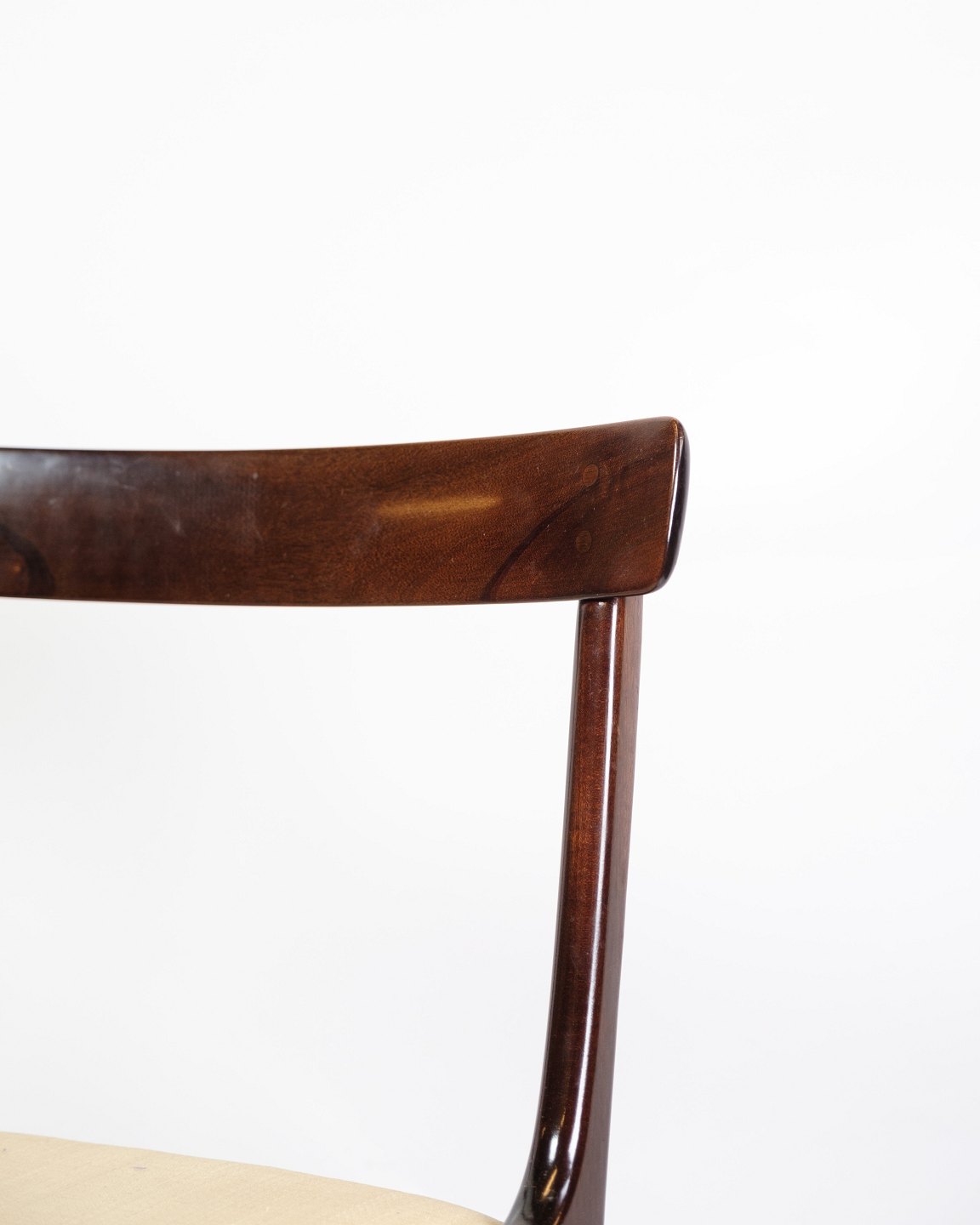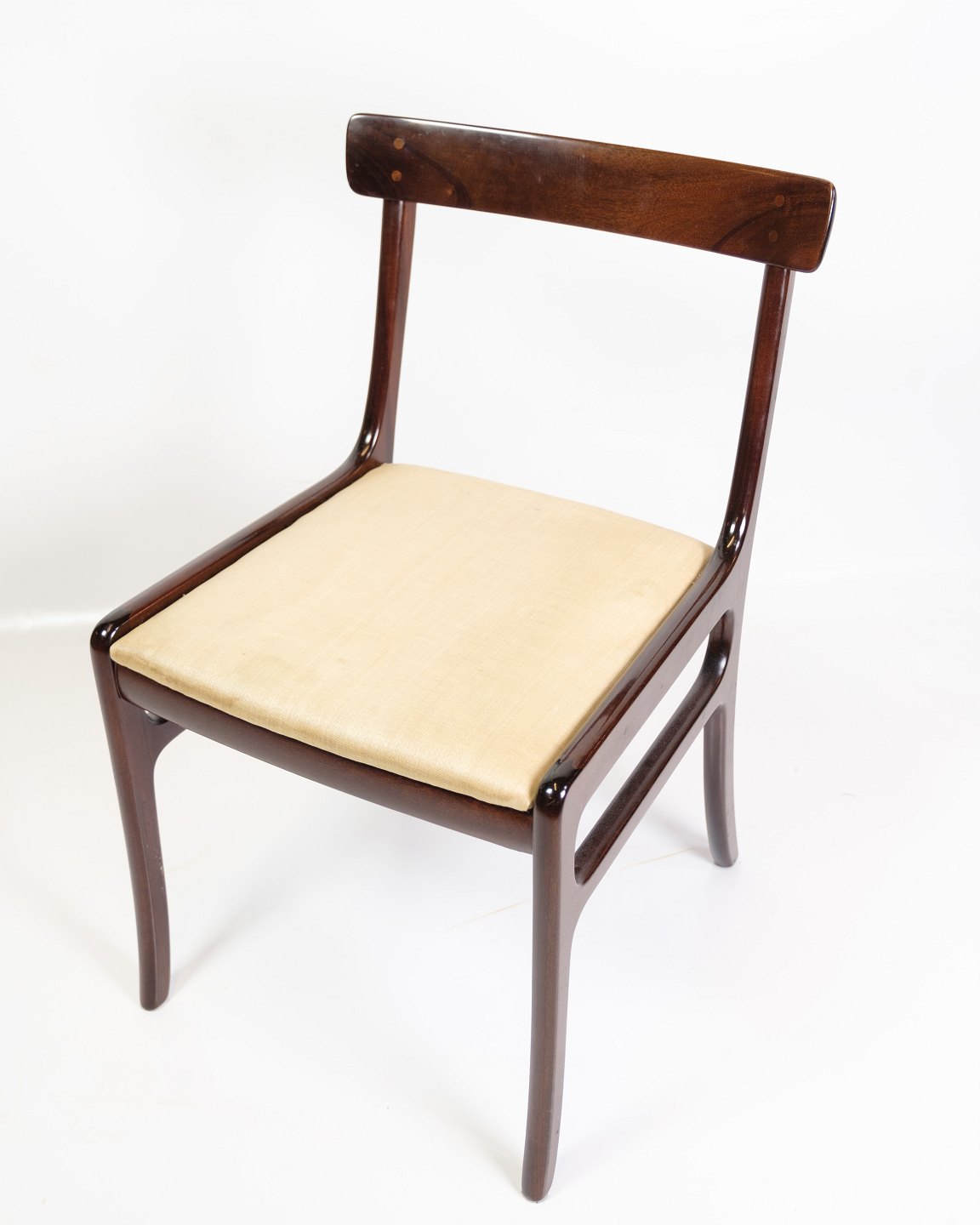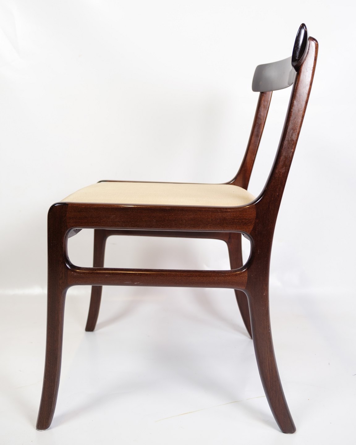 Set of 6 dining chairs, model Rungstedlund, designed by Ole Wanscher and manufactured by P. Jeppesen in the 1960s. The chairs are made of mahogany and upholstered with light fabric, which gives them a classic and stylish expression.