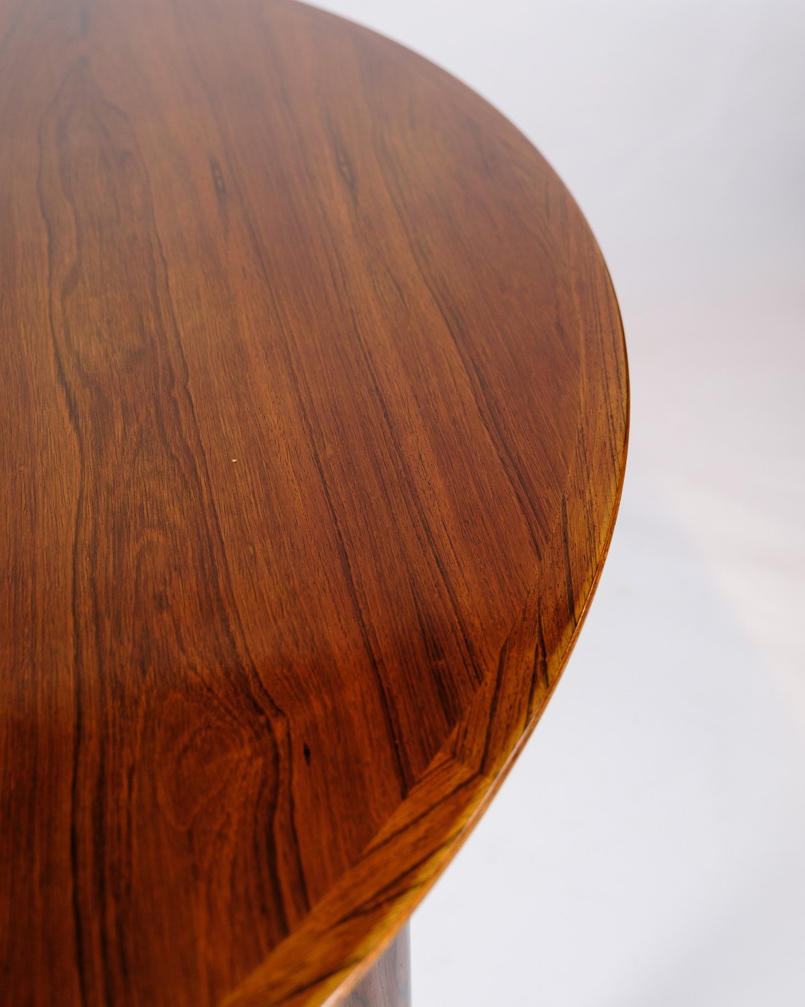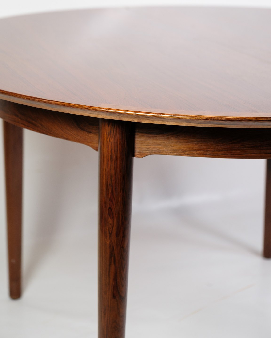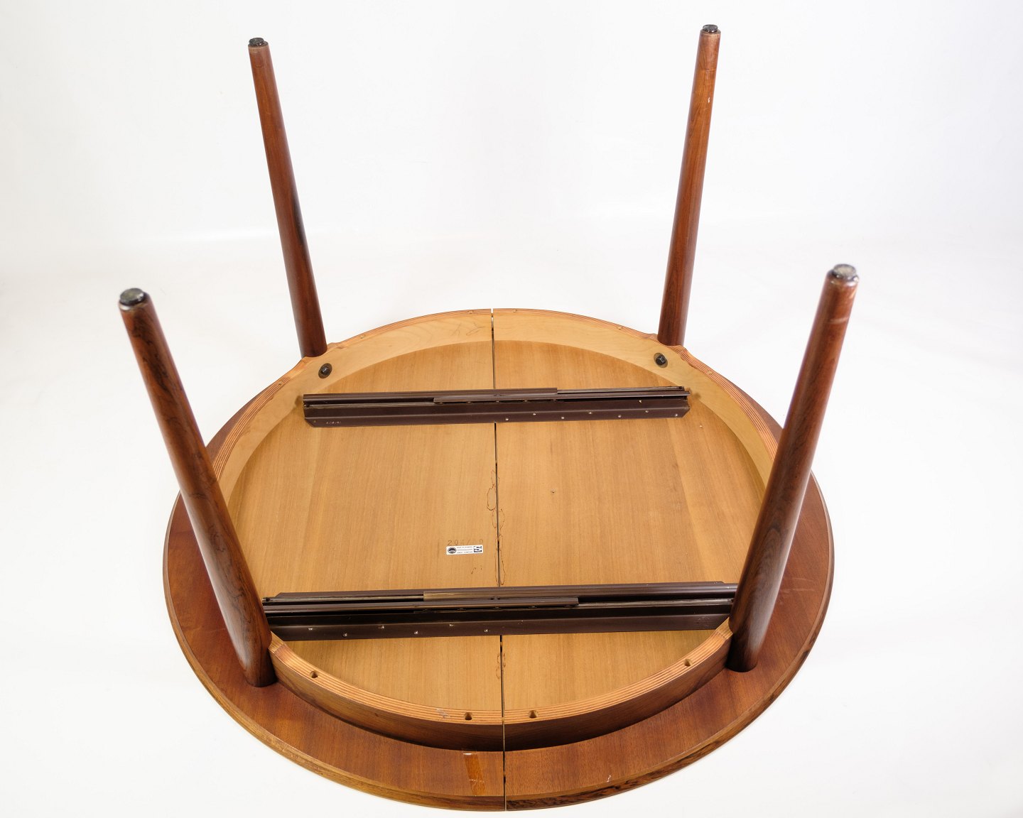 Round dining table in rosewood with extension leaves, designed by Arne Vodder and manufactured by Sibast Møbler in the 1960s. The table combines function and quality, with a robust teak construction that gives it a warm and natural glow. The extension leaves make it possible to extend the table to accommodate more guests.