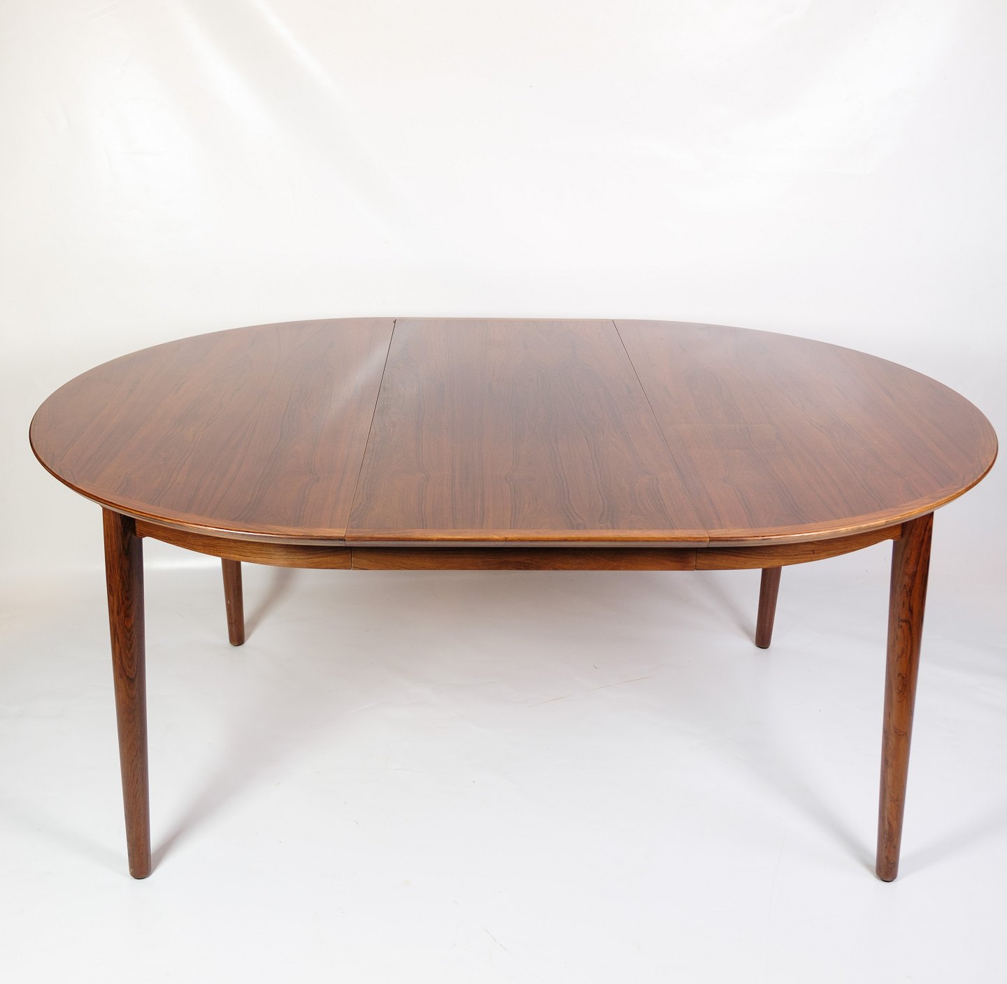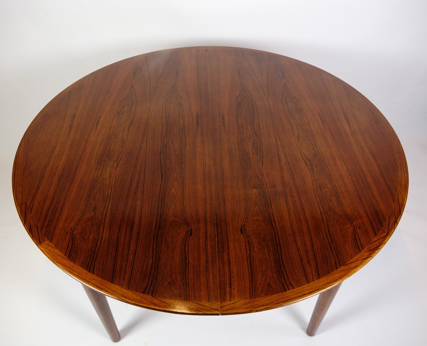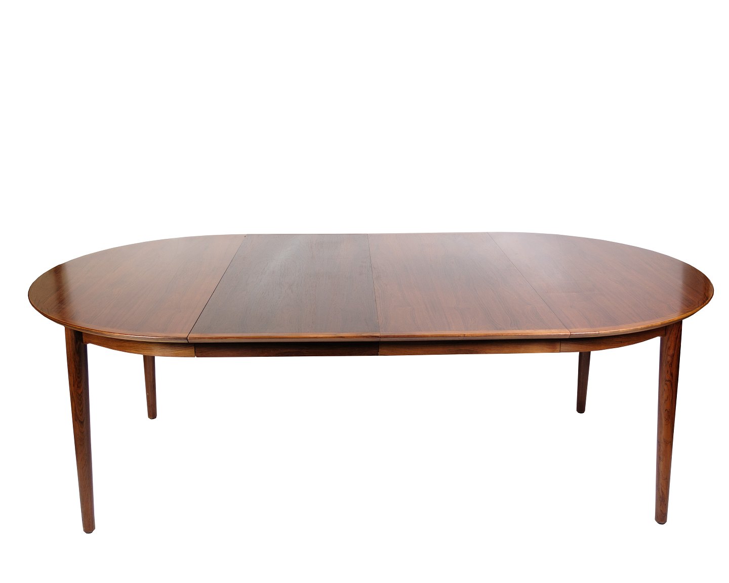 Round dining table in rosewood with extension leaves, designed by Arne Vodder and manufactured by Sibast Møbler in the 1960s. The table combines function and quality, with a robust teak construction that gives it a warm and natural glow. The extension leaves make it possible to extend the table to accommodate more guests.