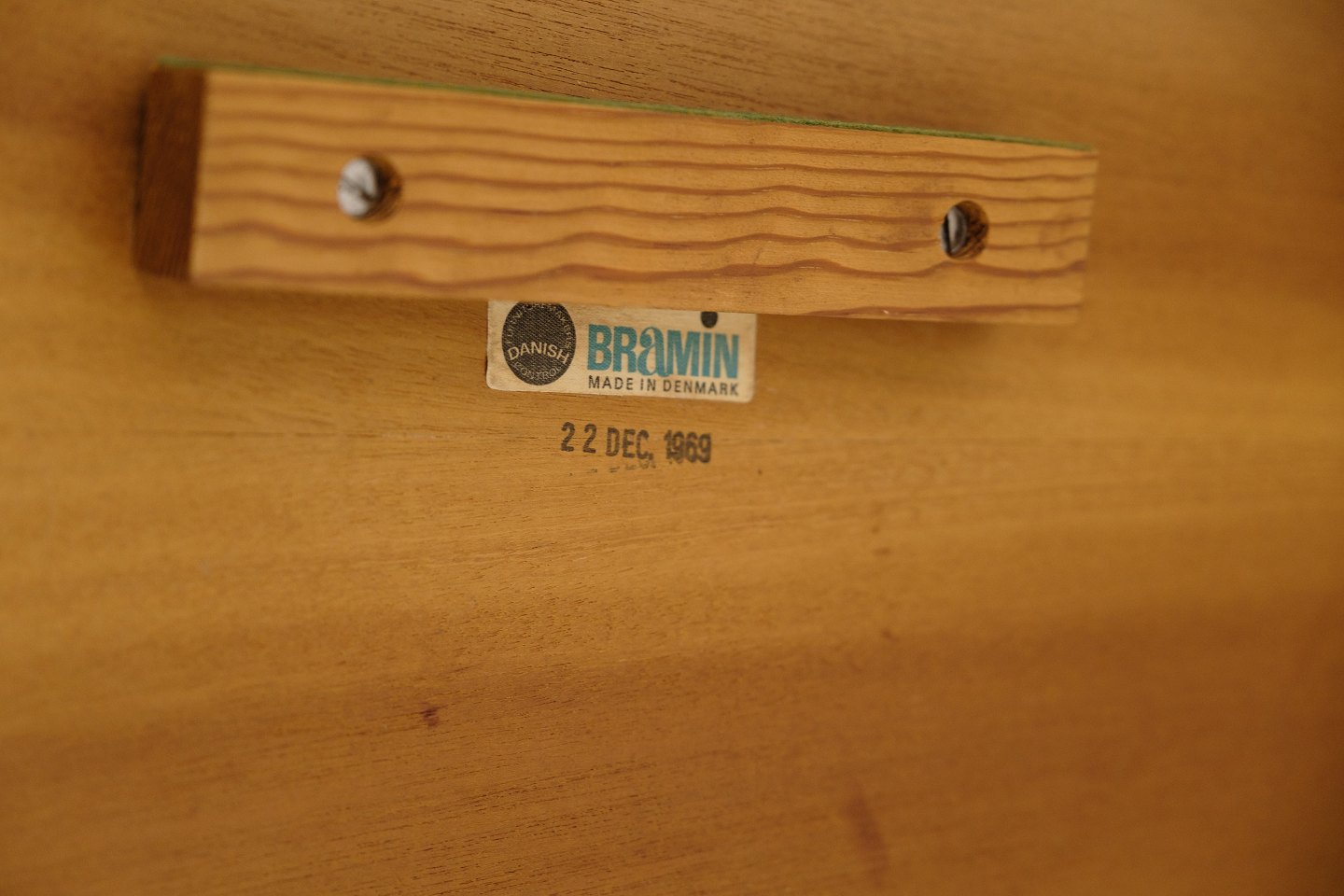 Henry W. Klein (1919-2003) var en norsk designer, der arbejdede i Danmark og samarbejdede med Bramin om at skabe møbler af høj kvalitet og med et fokus på funktionalitet. Bramin var kendt for deres produktion af møbler, hvor godt håndværk og design gik hånd i hånd. Dette spisebord er et godt eksempel på Kleins tilgang til møbeldesign, hvor enkelhed og holdbarhed er i fokus, og hvor de tappede samlinger tilføjer en karakteristisk detalje.