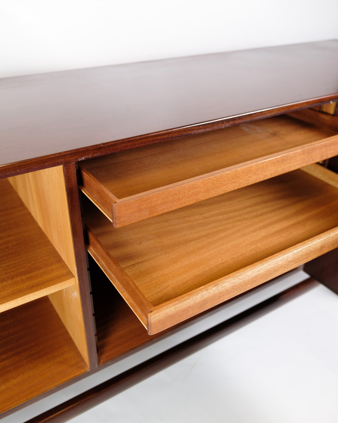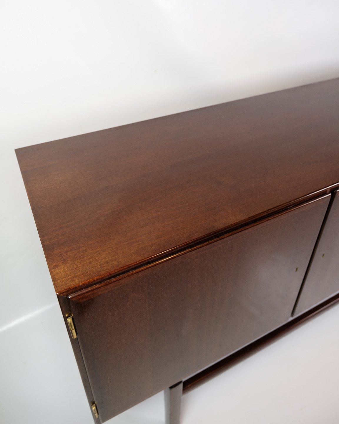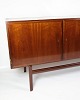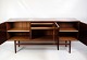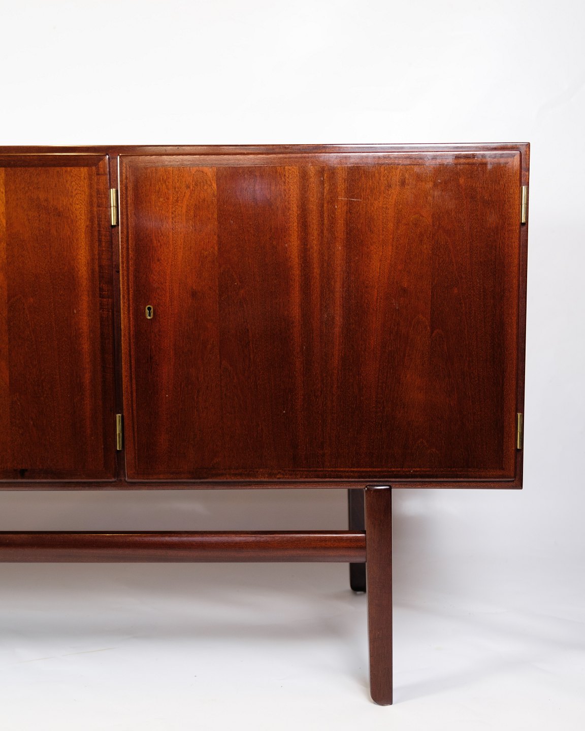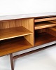 SolgtSkænk i mahogni, designet af Ole Wanscher og fremstillet af P. Jeppesen i 1960'erne. Skænken har tre låger på fronten, som åbner op til rummelige opbevaringsrum med hylder på begge sider samt to skuffer i midten, ideelle til opbevaring af mindre genstande. De tappede samlinger og det smukke mahogni fremhæver kvaliteten og det solide håndværk, der er kendetegnende for Wanschers designs.