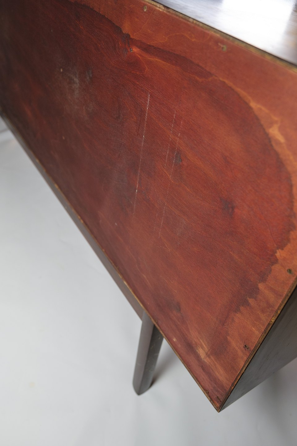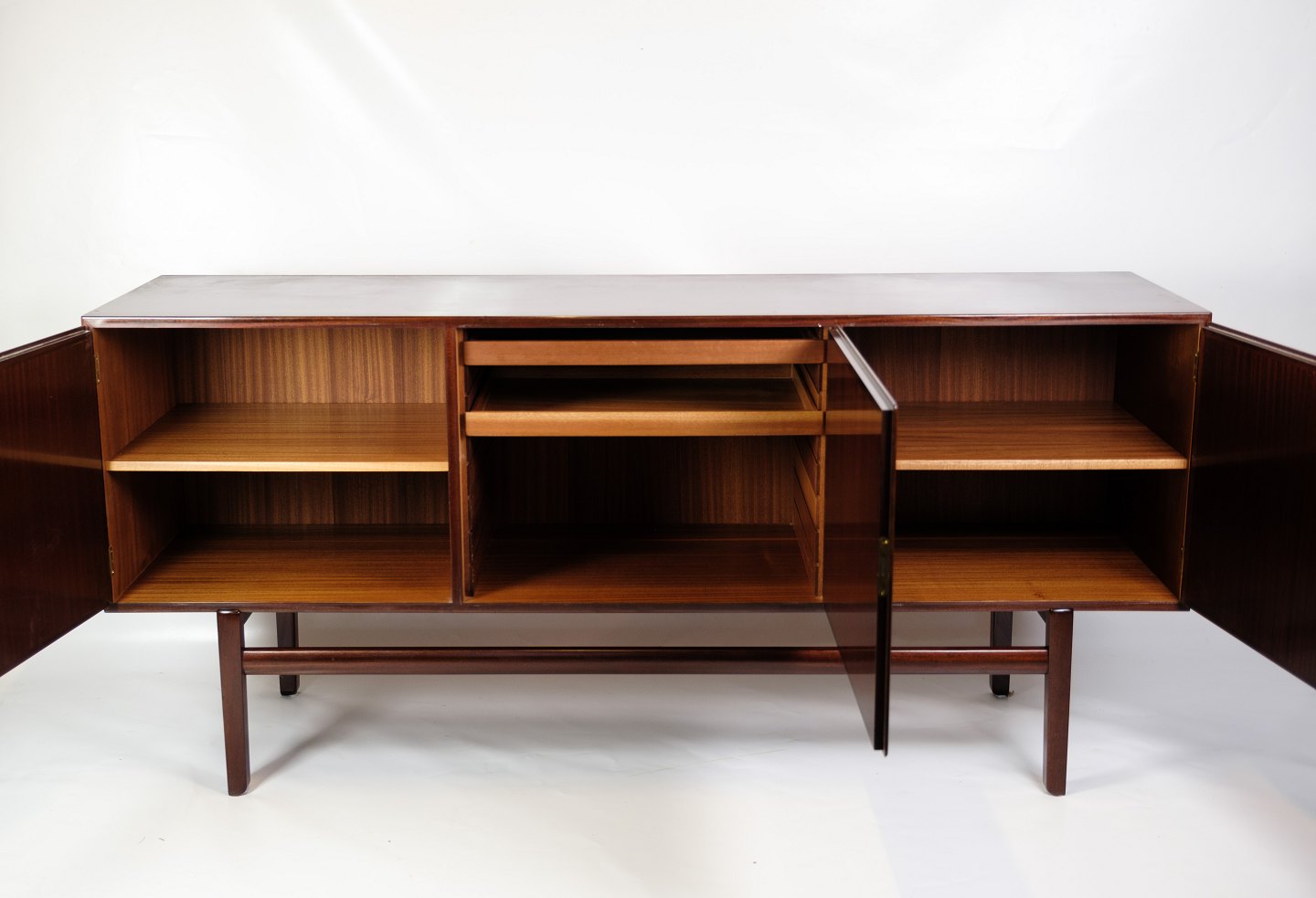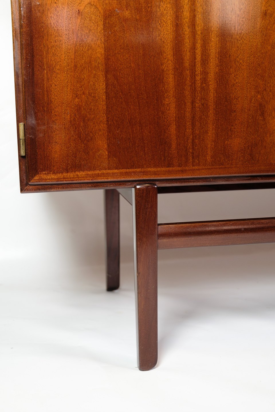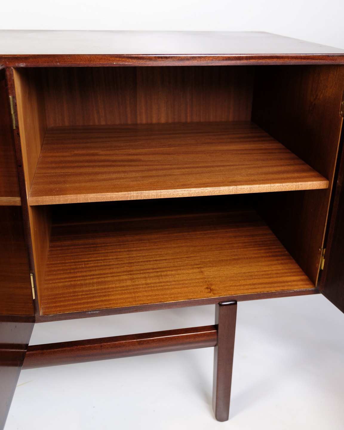 Skænken står på et let hævet stel med 4 ben og en afstivende tværstang, som giver både stabilitet og elegance. Wanschers fokus på enkelhed og funktionalitet skinner tydeligt igennem, og dette møbel er et godt eksempel på dansk design fra perioden.
