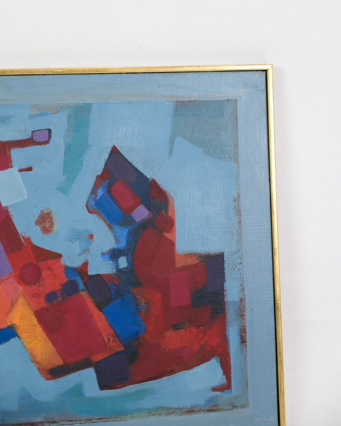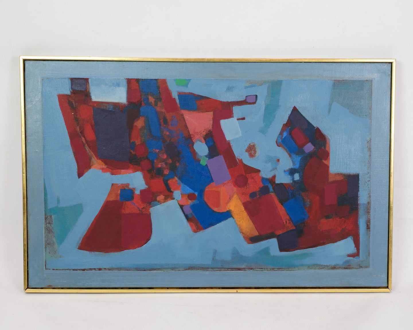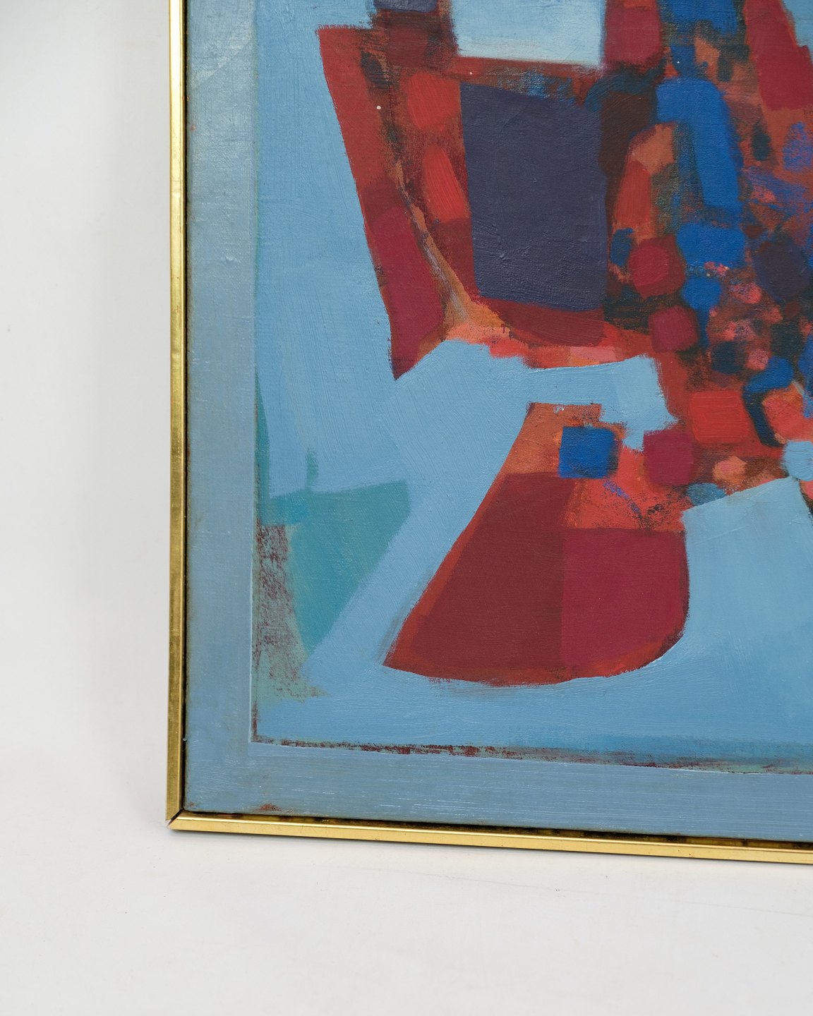 Dette oliemaleri af Gudmund Olsen er et imponerende eksempel på abstrakt kunst. Maleriet udstråler en harmonisk balance mellem geometriske former og farvekontraster, hvor rige røde, blå og violette nuancer dominerer kompositionen. Den blå baggrund skaber en beroligende ramme, der fremhæver de dynamiske elementer i forgrunden.