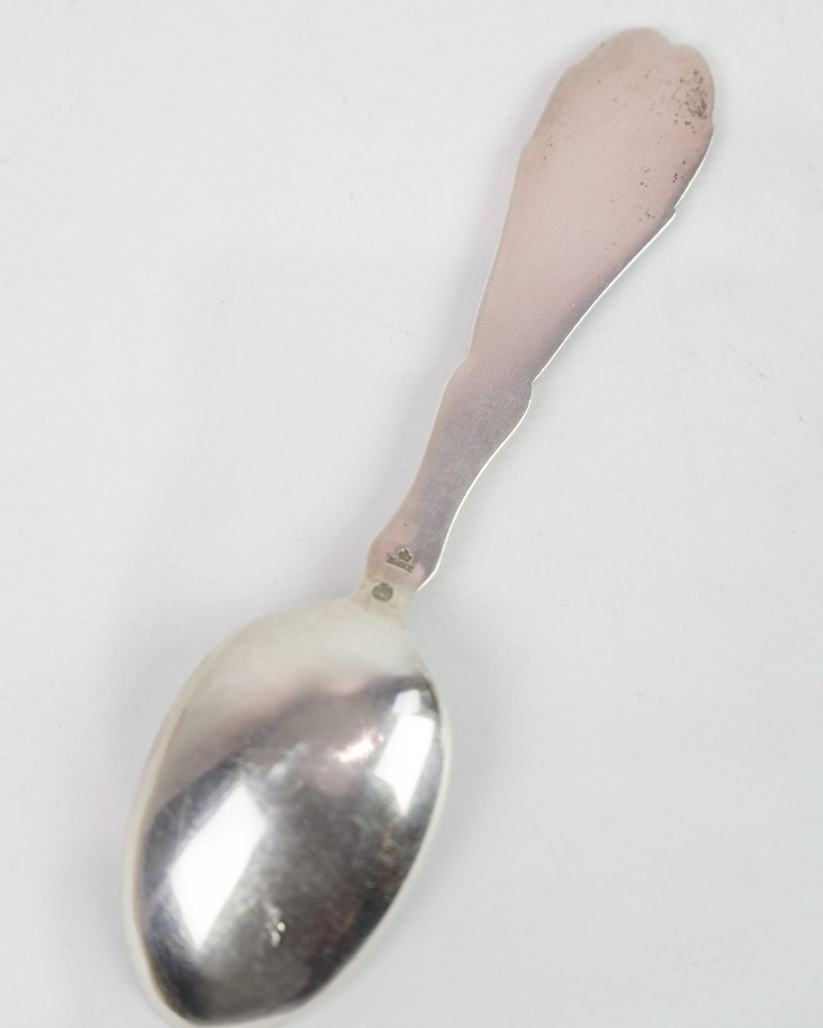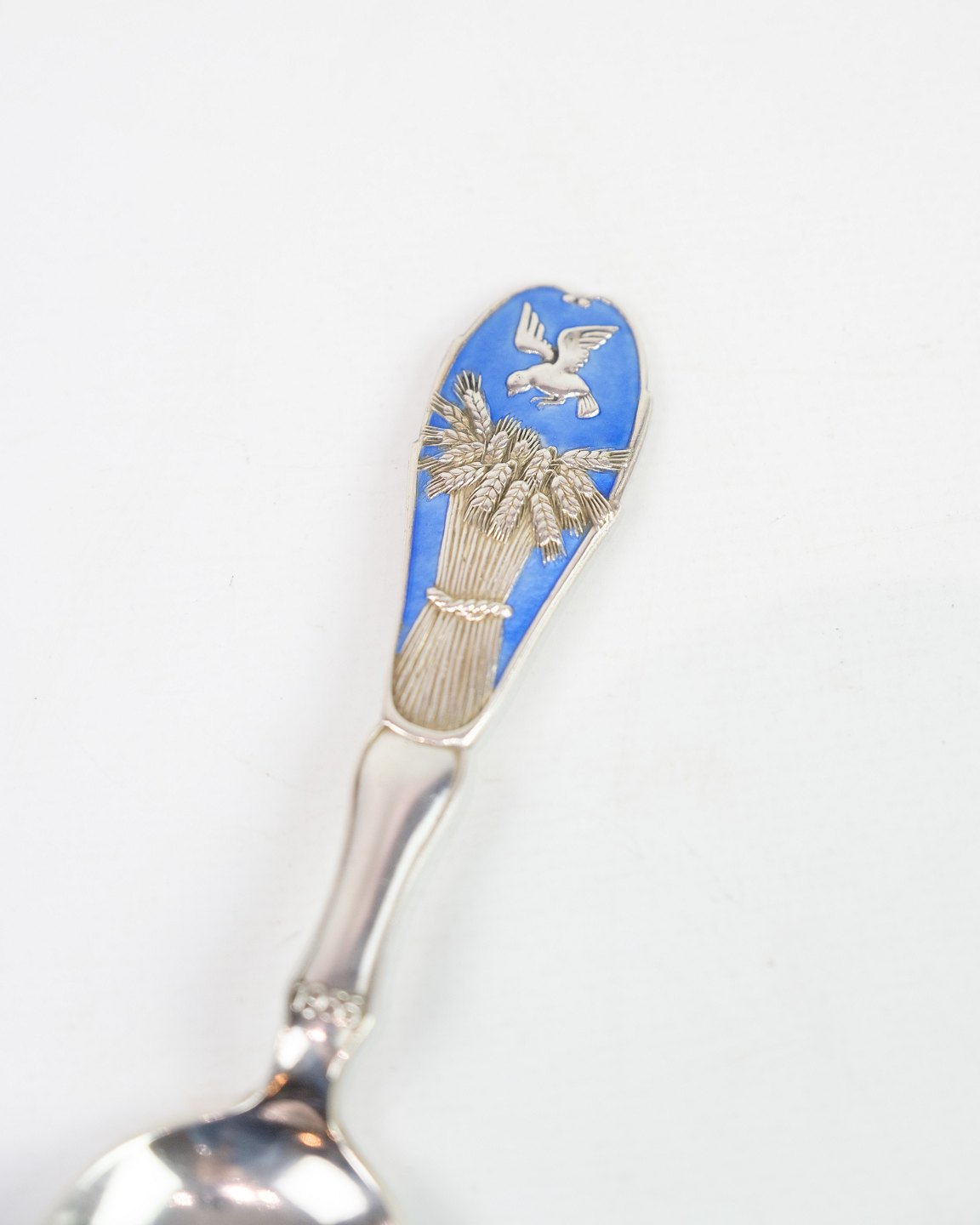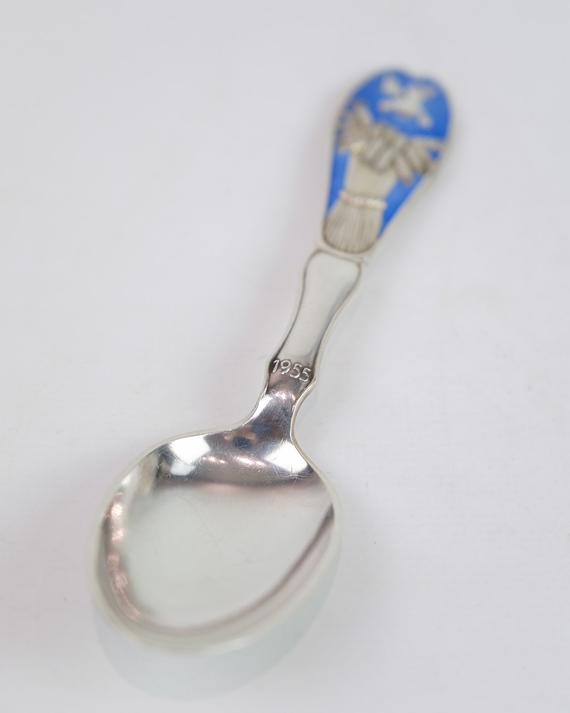 Denne årsske fra 1955 er udført i sterling sølv og stemplet med "3 tårne," som bekræfter dens danske oprindelse og høje kvalitet. Skeen er designet af E. Mertz og har et smukt dekoreret skaft med blå emalje, der viser et motiv med kornneg og en fugl, hvilket symboliserer frugtbarhed og naturens rigdom. Dette er et klassisk eksempel på dansk sølvhåndværk fra midten af 1900-tallet og en eftertragtet genstand for samlere af årsskeer og sølvarbejder.
