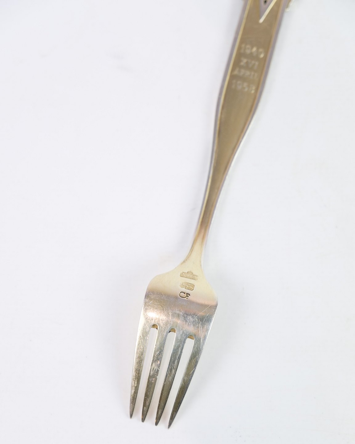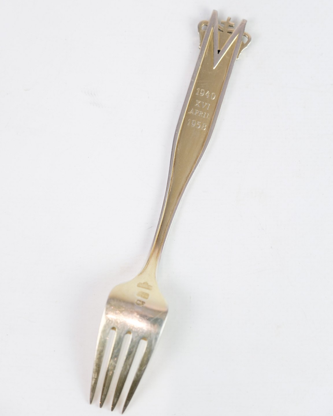 This commemorative fork was made in sterling silver by Anton Michelsen on the occasion of Princess Margrethe's 18th birthday on April 16, 1958. Designed by Carsten Frölich.
