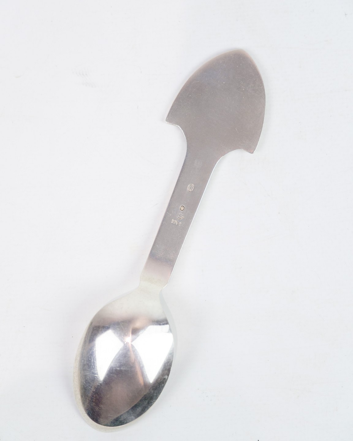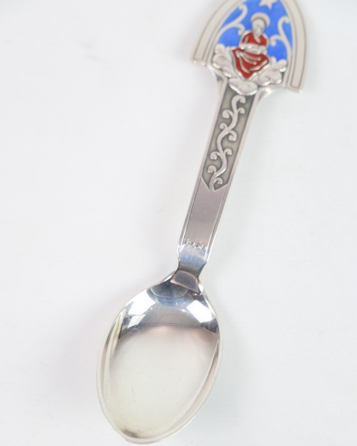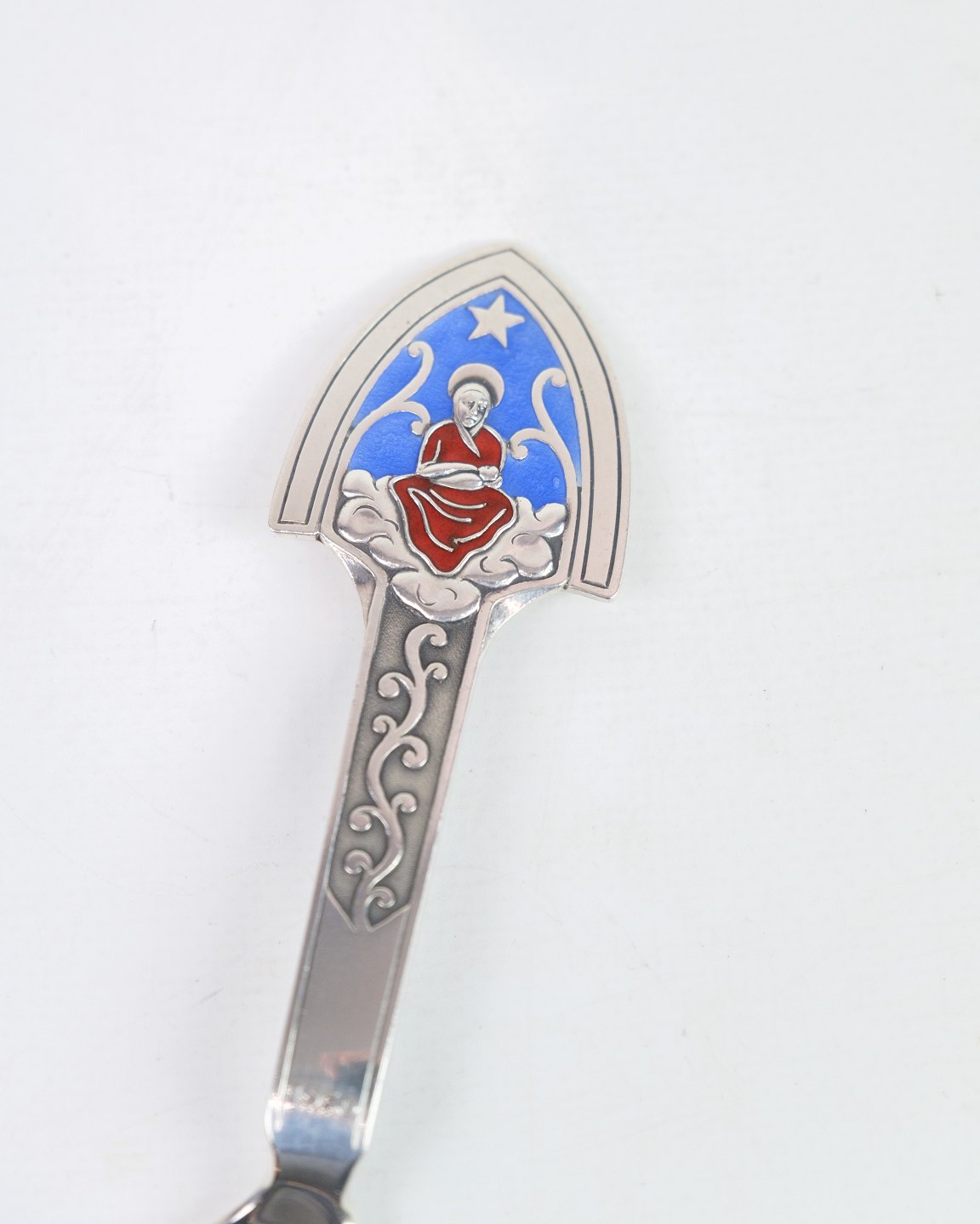Denne juleske fra 1950 er fremstillet af Grann & Laglye i København og udført i sterling sølv. Skeen er dekoreret med et motiv, der forestiller Jomfru Maria med Jesusbarnet, omgivet af stjerner og skyer, hvilket afspejler julens religiøse symbolik. Med sin detaljerede emaljearbejde er skeen et fint eksempel på dansk sølvhåndværk fra midten af det 20. århundrede. Grann & Laglye er kendt for deres unikke designs, og denne juleske er en eftertragtet genstand for samlere af julebestik og dansk design.