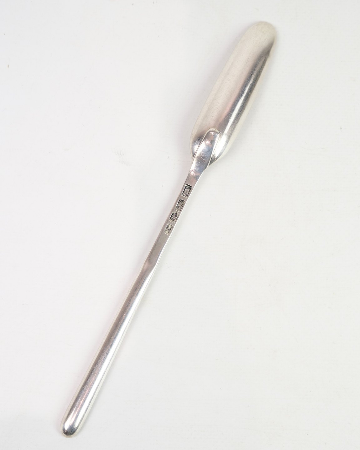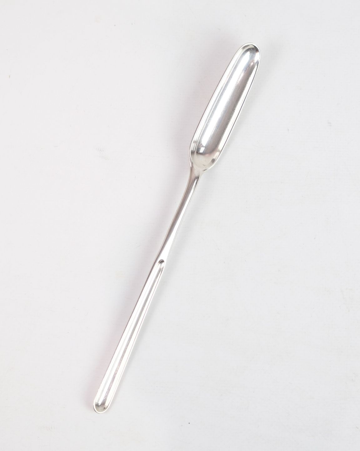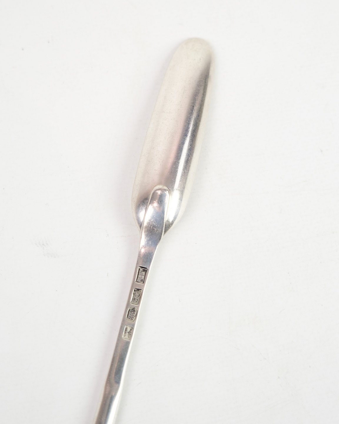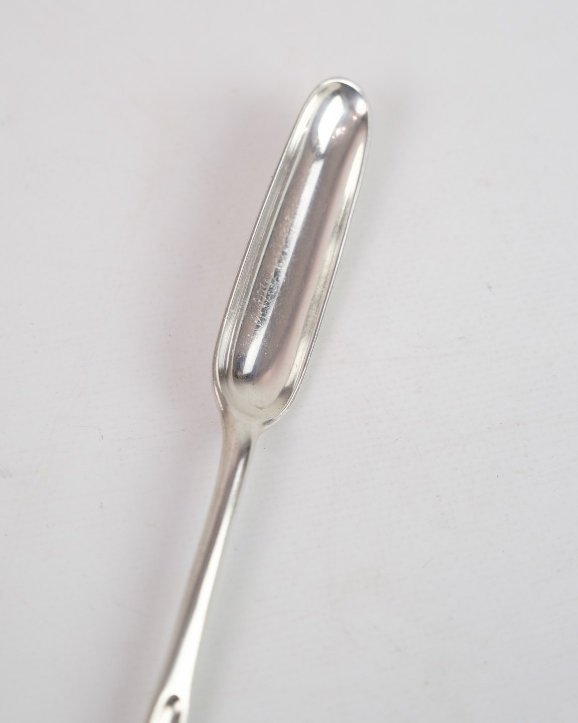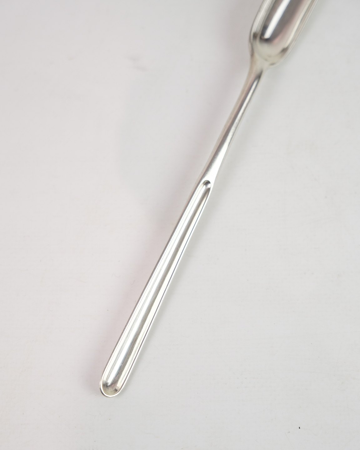 Denne delikatesse-ske er fremstillet af den danske sølvsmed C.C. Hermann i sterling sølv. C.C. Hermann, aktiv fra 1949 til 1959, er kendt for sit håndværk af høj kvalitet. Skeen er stemplet med "C.C. Hermann" og "Sterling Denmark", hvilket bekræfter dens ægthed og oprindelse. Med sit elegante design er denne ske ideel til servering af delikate retter og udgør et smukt supplement til enhver sølvsamling.