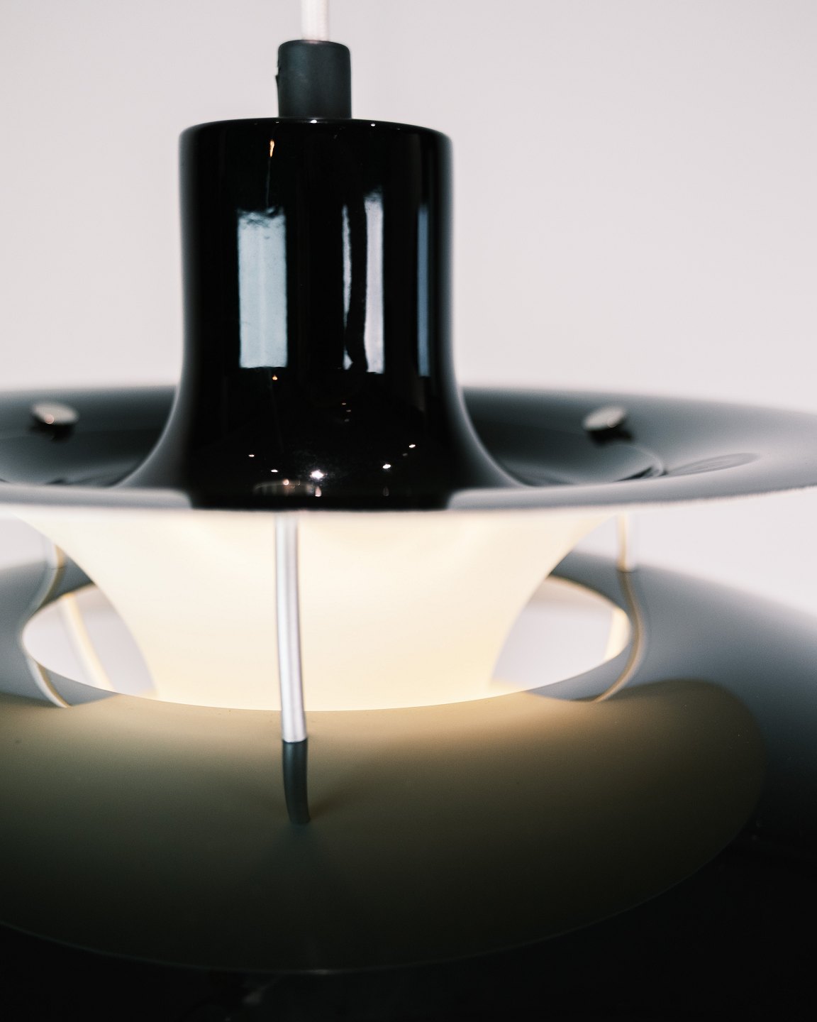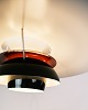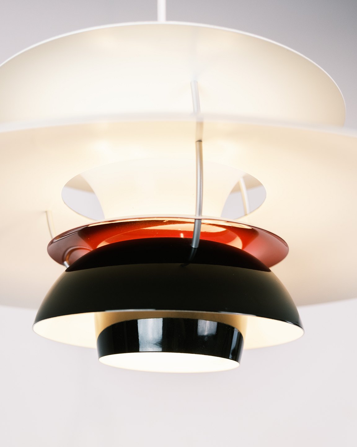 PH5 lampe designet af Poul Henningsen i 1958 og fremstillet af Louis Poulsen. Lampen har lakerede metal skærme i sort, rød og hvid, samt er af nyere model.