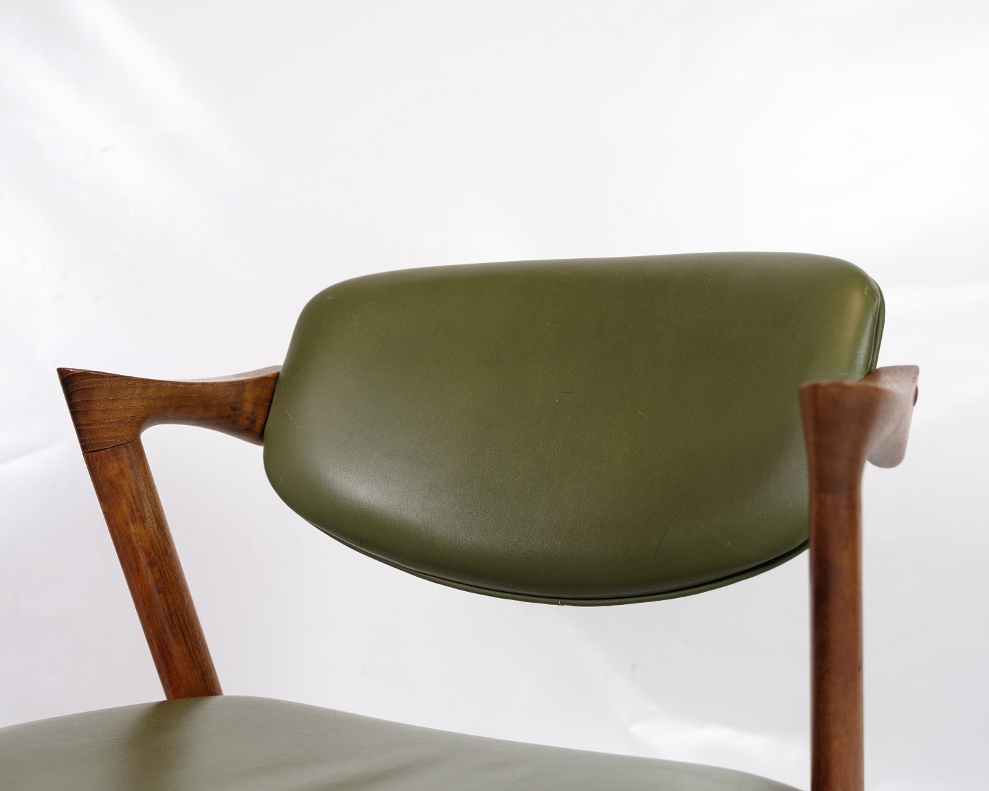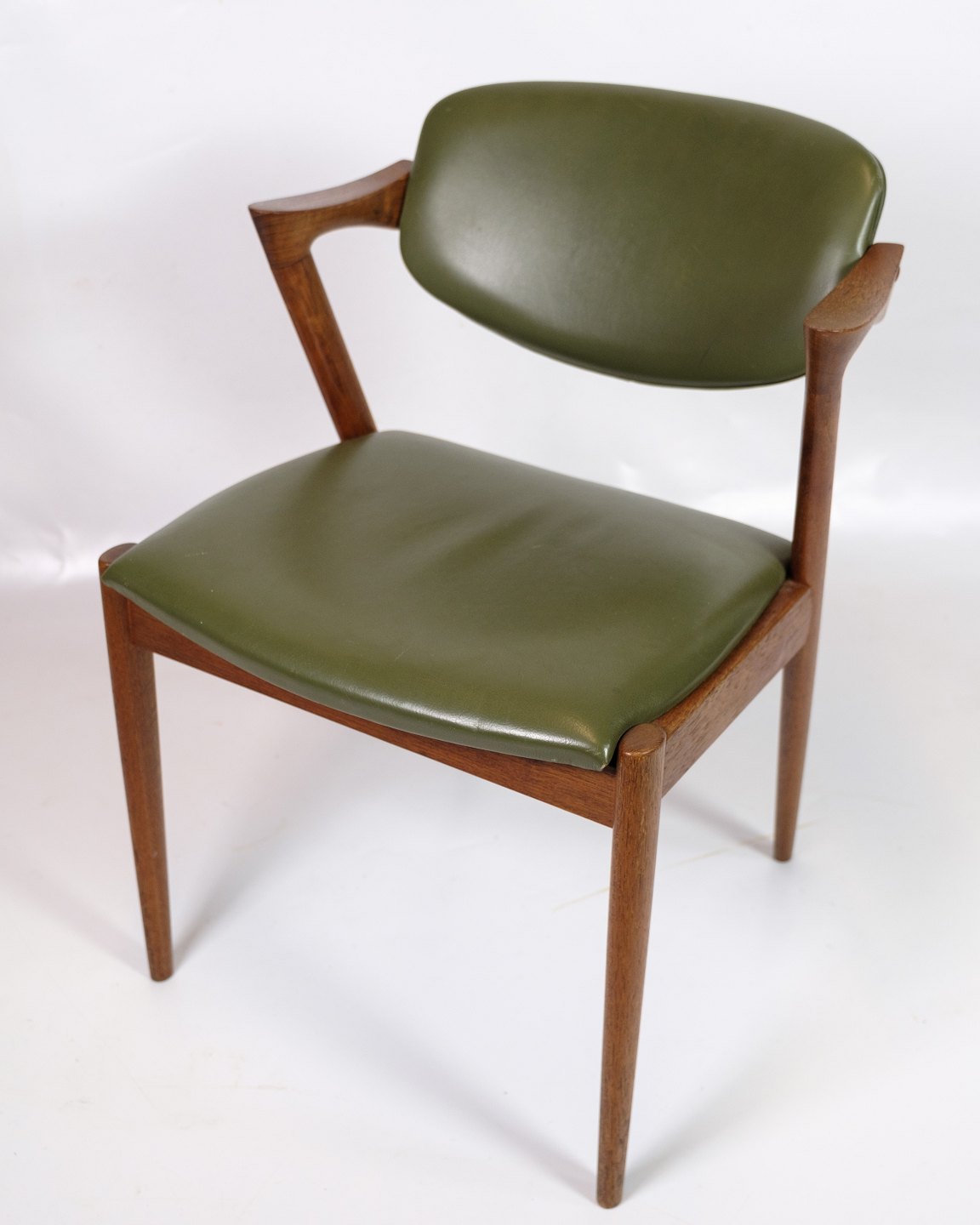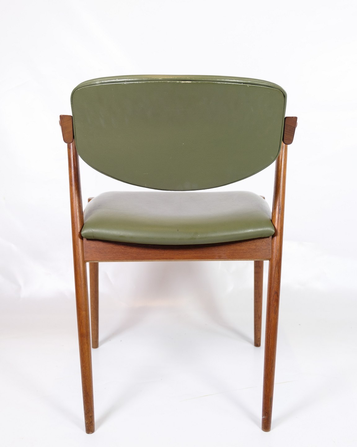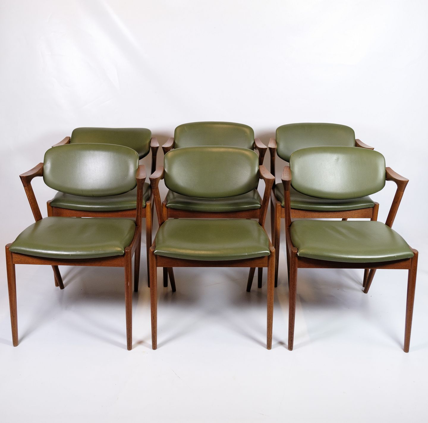 Set of 6 dining chairs, model 42, designed by Kai Kristiansen and produced by Schou Andersen in the 1960s. The chairs are made of teak, which gives them a warm and natural look, and they are upholstered in green leather. Model 42 is known for its ergonomic design with slanted backrests, which provide a comfortable sitting experience and good support.